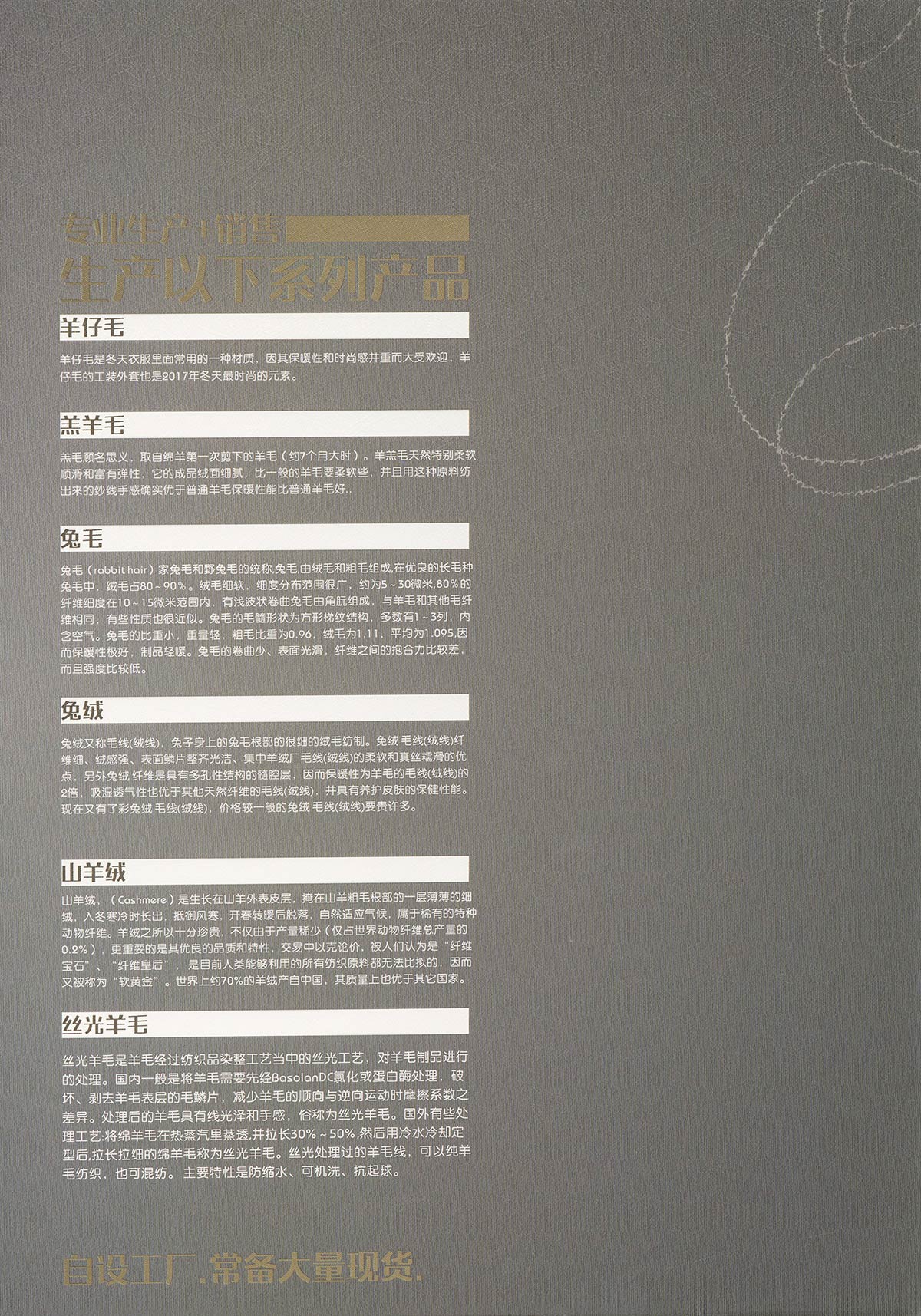 羊仔毛及混紡紗線 、羊絨及混紡紗線、 兔絨及混紡紗線 、 兔毛及混紡紗線、 各種動物纖維混紡紗線、 各種粗紡花式紗線。