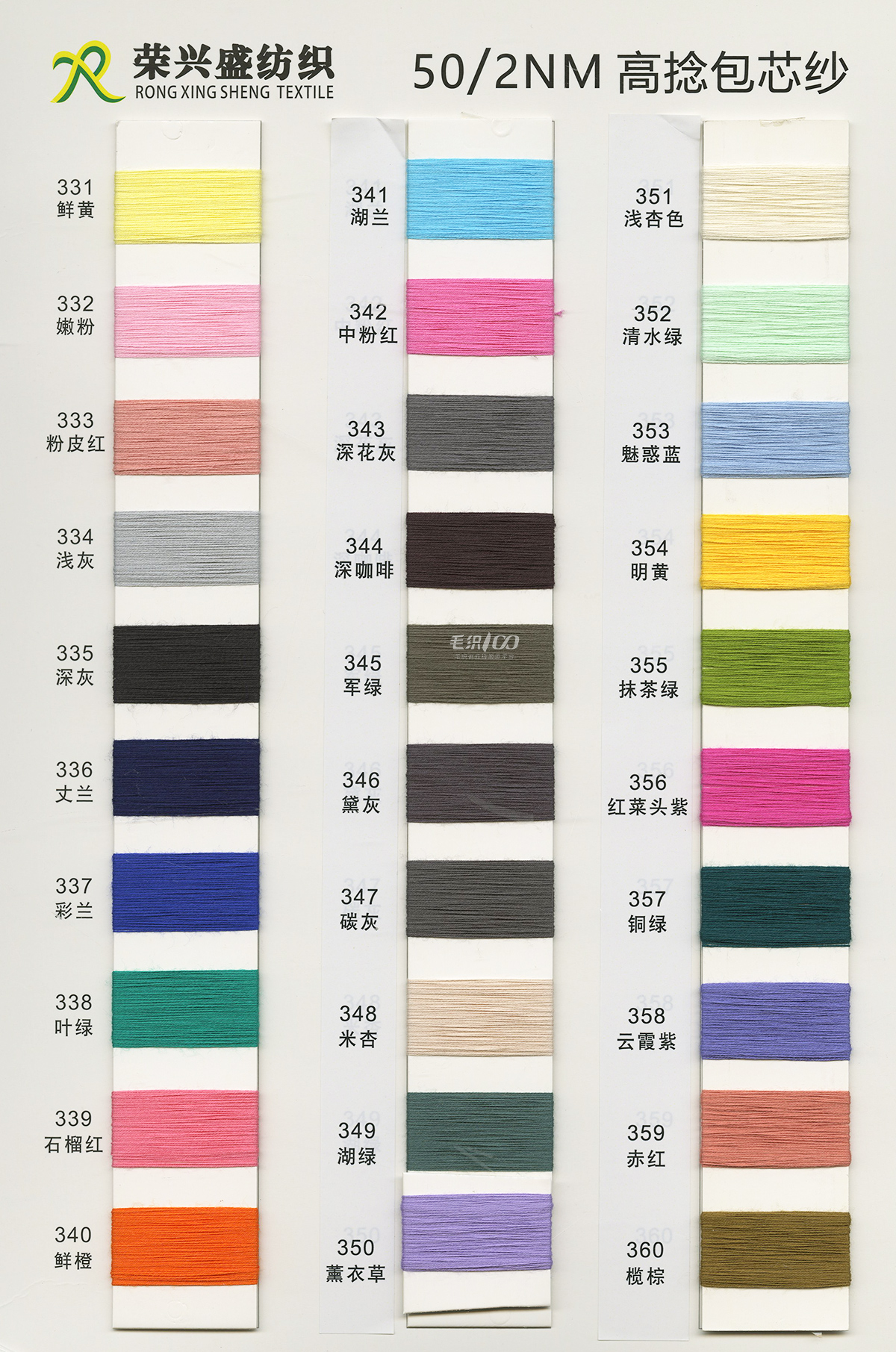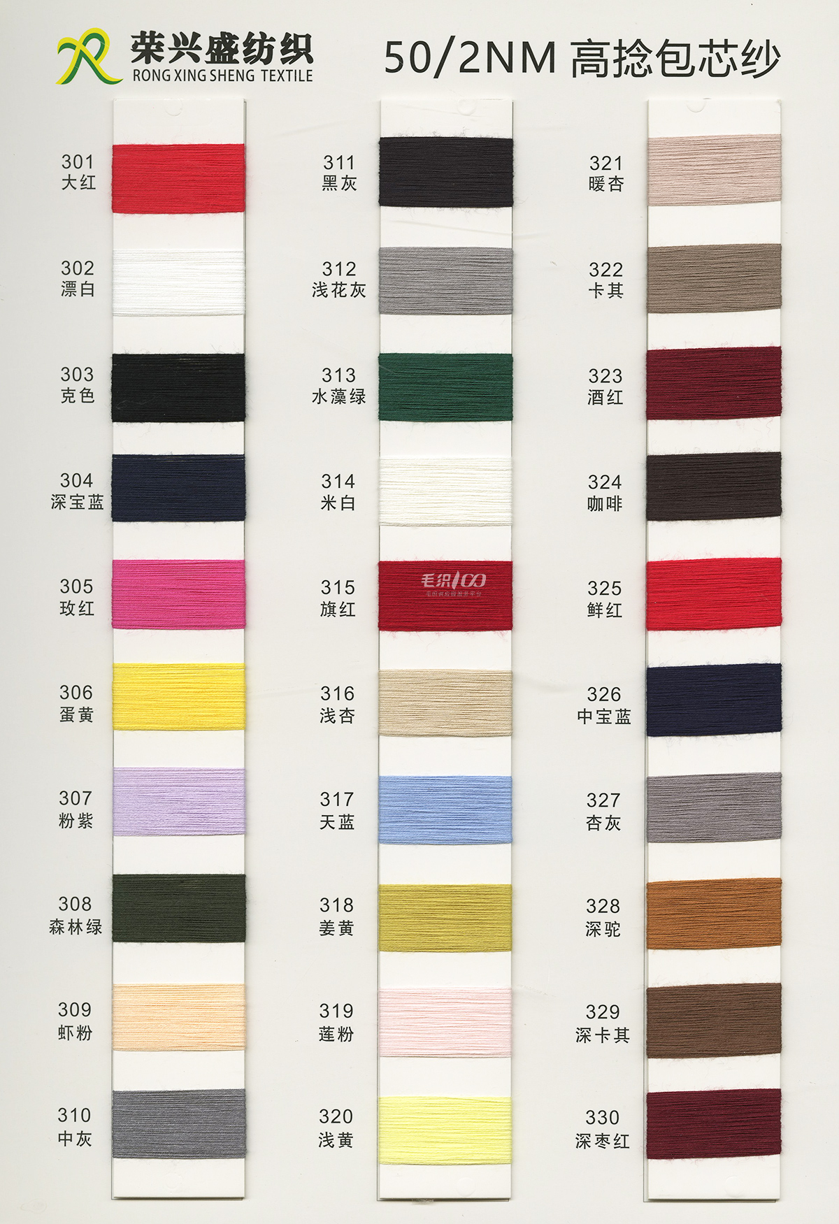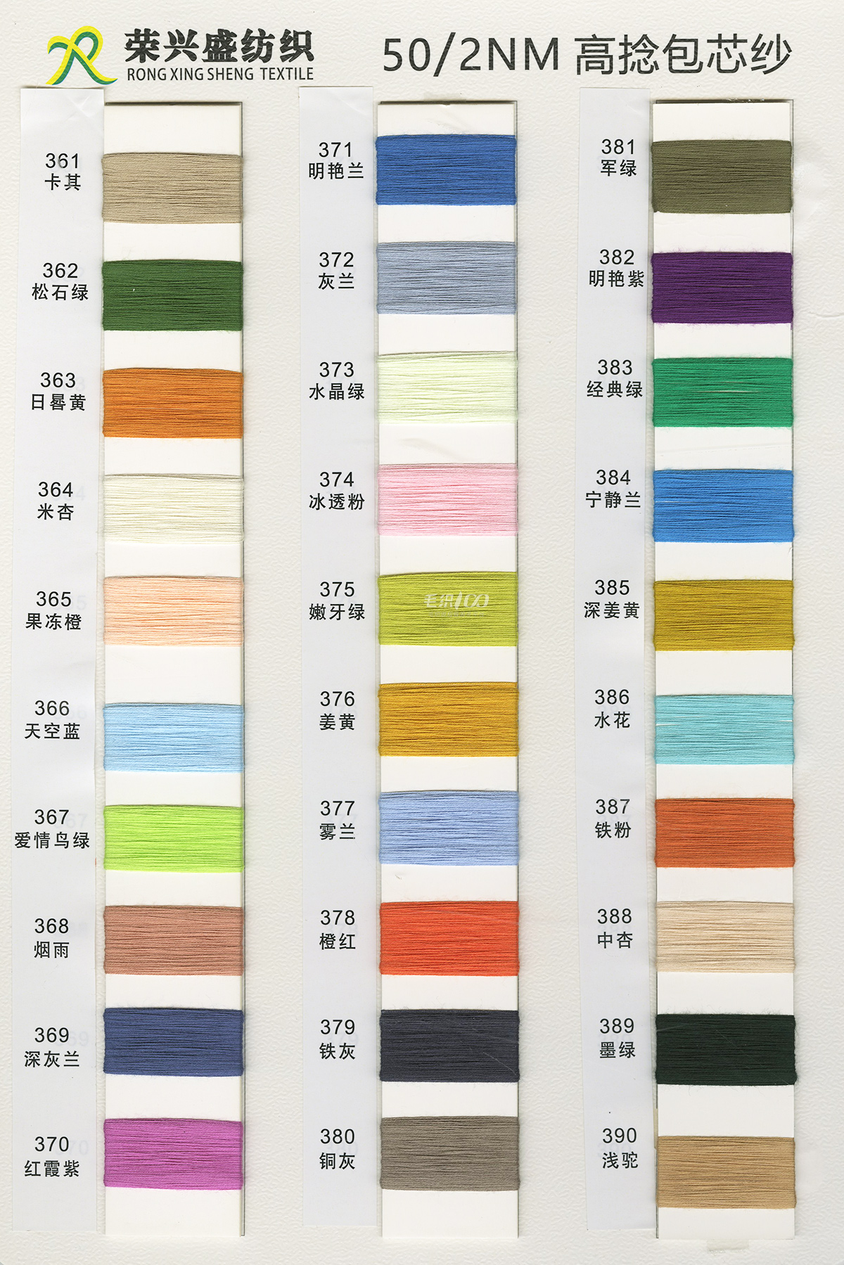 棉紗系列:32S/2有色半精梳棉紗、32S/2色紡花棉、32S/2幻彩棉紗、32S/2彩點棉;16/2膨體棉晴;包芯紗系列:28/2高彈包芯紗、50/2高捻包芯紗、44/2抗起球莫代爾包芯紗、50/2抗起球絲光包芯紗、30/2抗起球花式包芯紗;