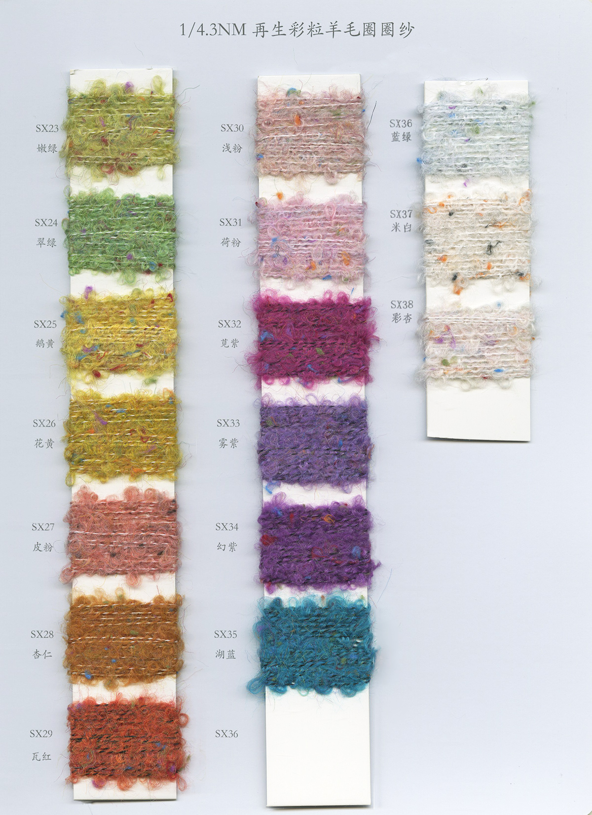 4.9/1NM超柔密圈圈(單色/雙色),4.3/1NM彩粒圈圈,2.4/1NM菊花絨,2.2/1NM法蘭絨,2.2/1NM星星點點,8.2/1NM彩點馬海,8.5/1NM好柔軟,4/1和6/1NM彩糯