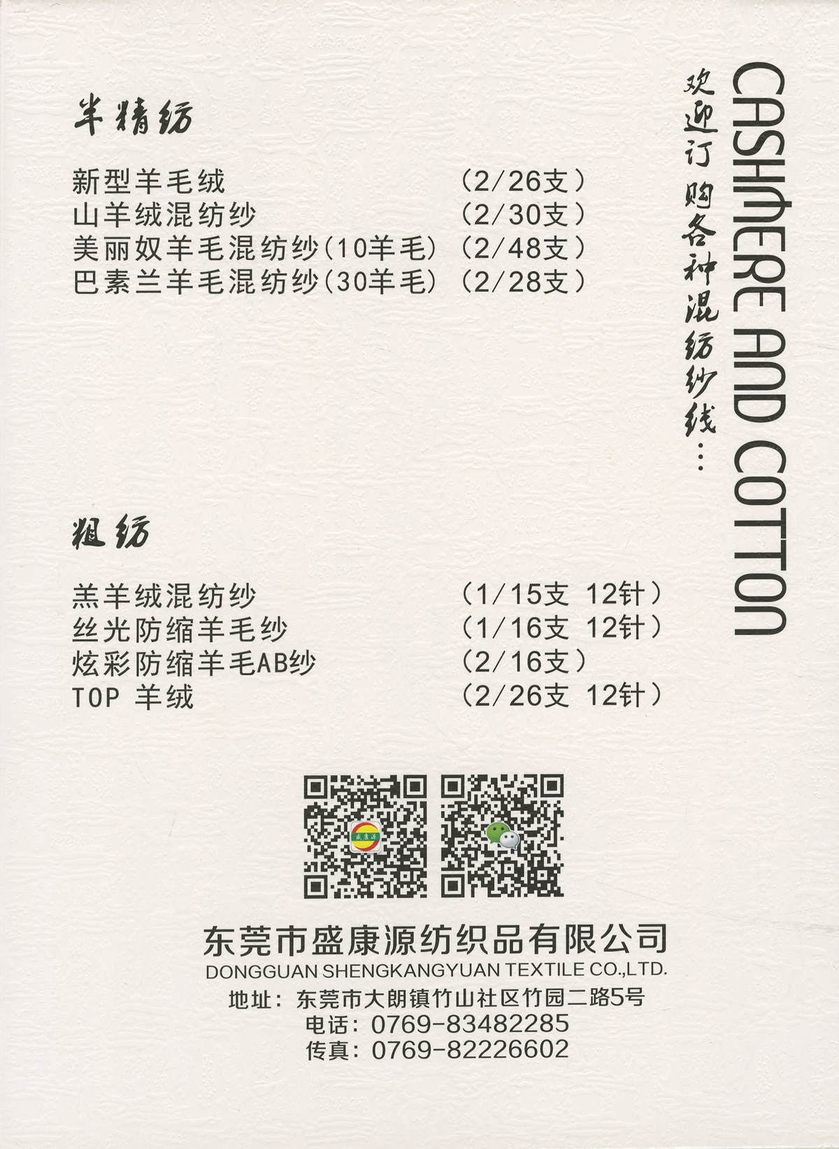 2/26NM克什米爾,2/26NM新型羊毛絨,2/30NM山羊絨混紡,1/16NM珠片紗 ,1/15NM羔羊絨混紡紗,2/13NM澳羊毛,2/28NM巴素蘭羊毛混紡,1/16NM 絲光防縮羊仔毛,2/24NM狐貍絨,2/16NM 絲光防縮羊仔毛幻彩紗,2/24NM 精品澳毛絨,2