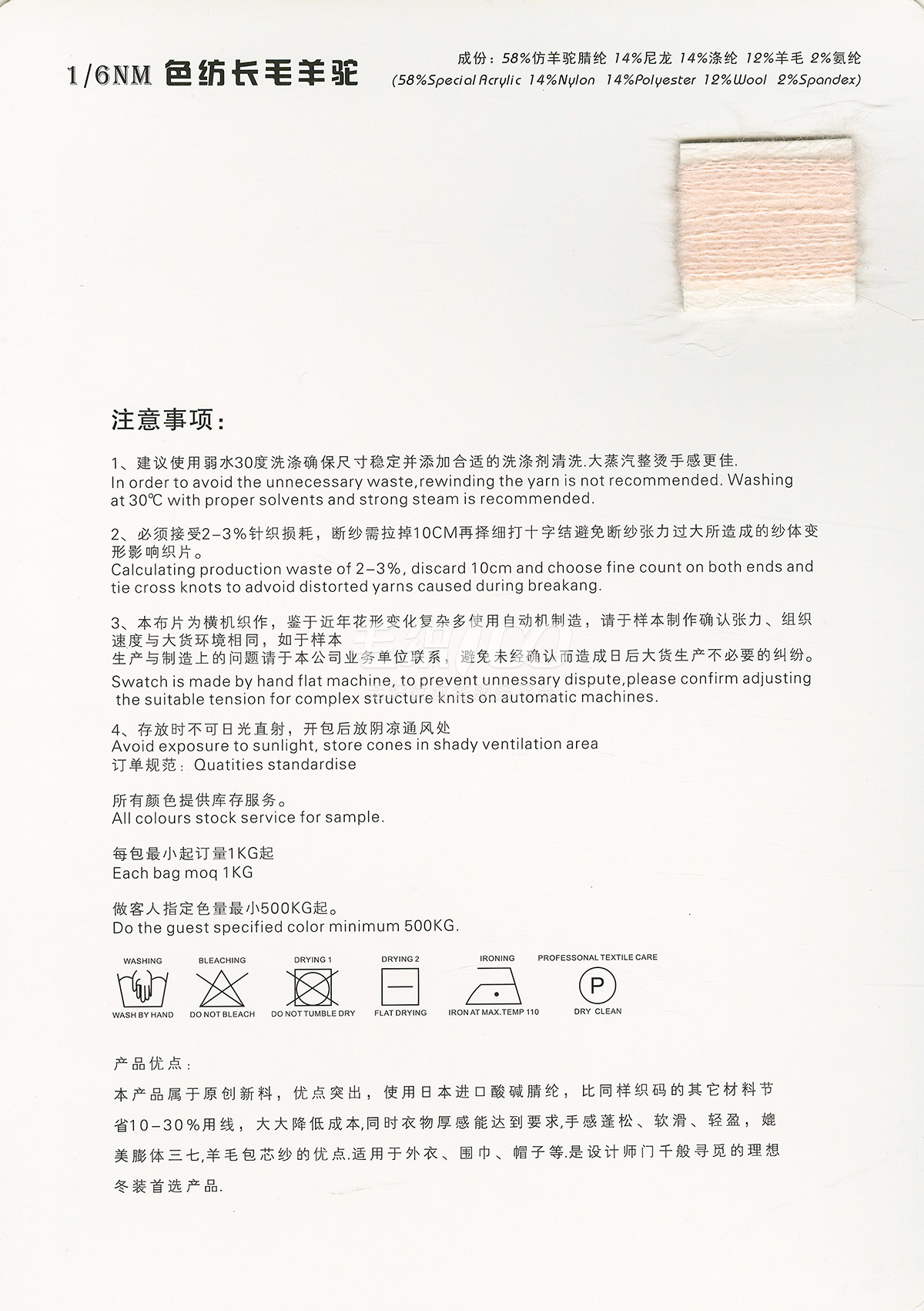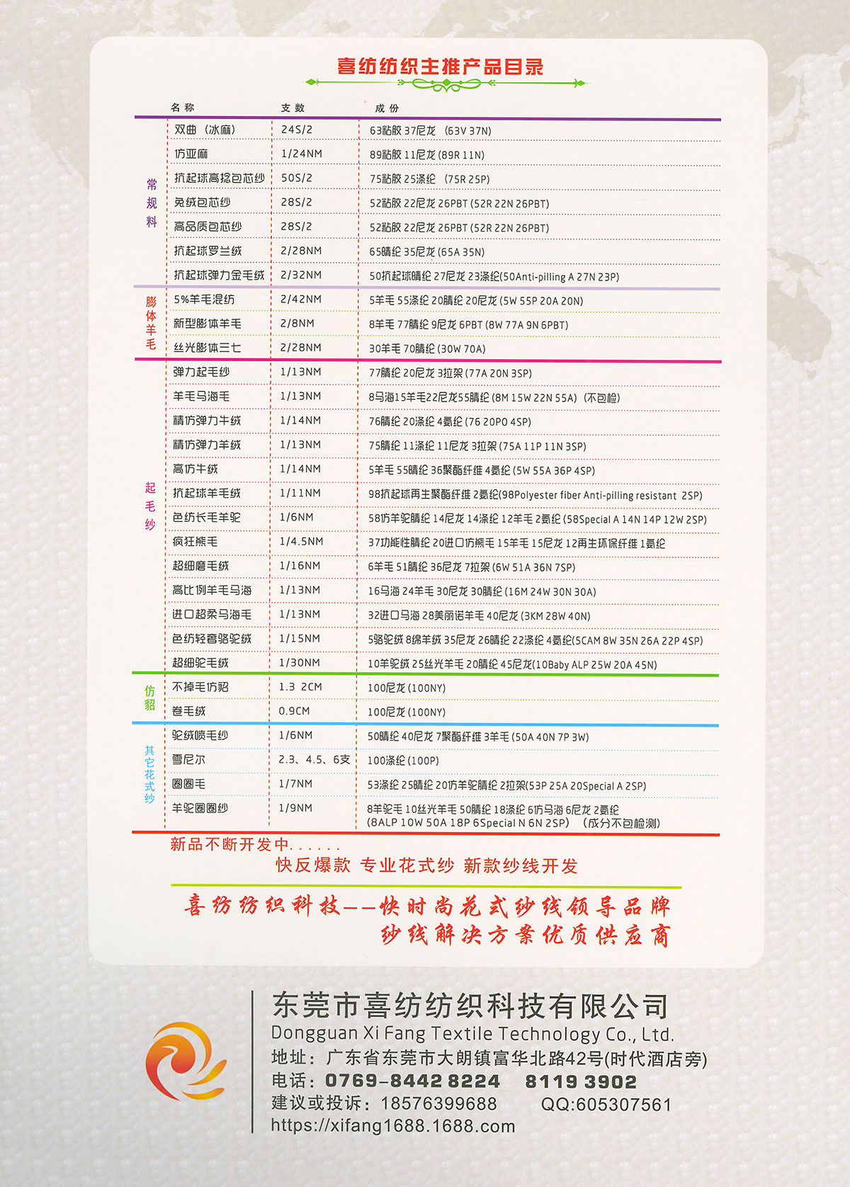 一. 流行花式紗線(中低價位):磨毛紗、拉毛紗、圈圈紗、噴毛紗 ; 二. 高品質常規料:包芯紗、北極絨(綿羊絨); 三. 膨體紗線:絲光膨體羊毛、新型膨體羊毛、膨體棉晴 。