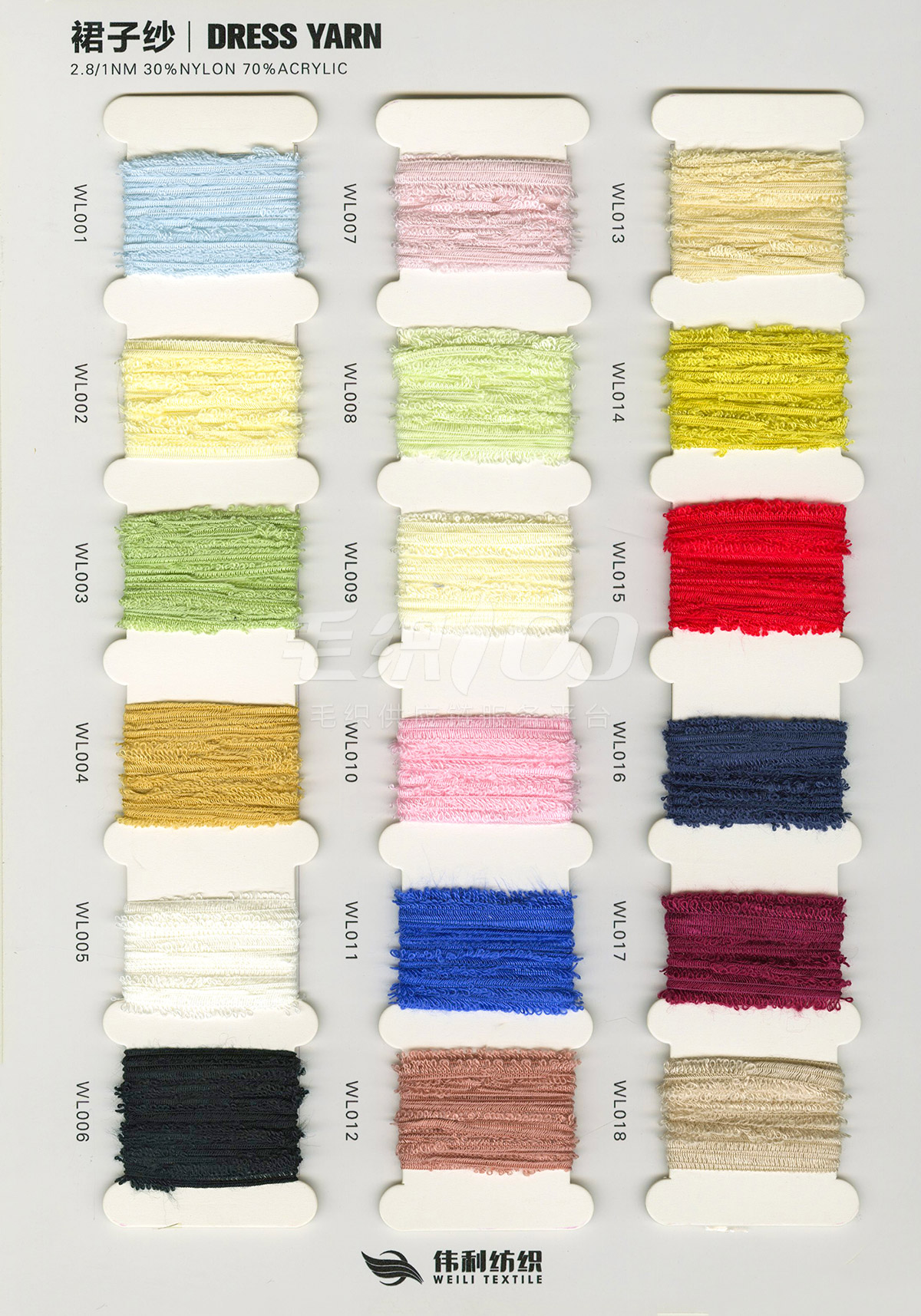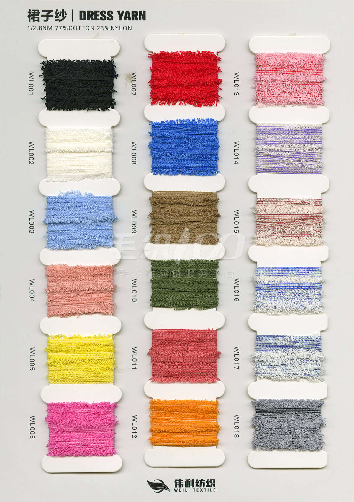 特種花式紗系列:螞蟻絨、棉花絨、珊瑚絨、花駝絨、磨毛考拉絨、彩虹噴毛紗、羊絨珠片紗、再生莫代爾珠片紗、漸變彩虹噴毛系列、金銀蜈蚣紗、金銀玻璃紗、金銀雙包紗、金銀空心帶、香腸紗、蜻蜓紗、蝴蝶紗、高速帶、馬海毛、空心帶、米粉紗、小肚棉、彩點紗、經緯紗、水結珠、梯仔紗、菊花紗、燈籠紗、羊駝毛、圈圈紗、等花式特種紗。