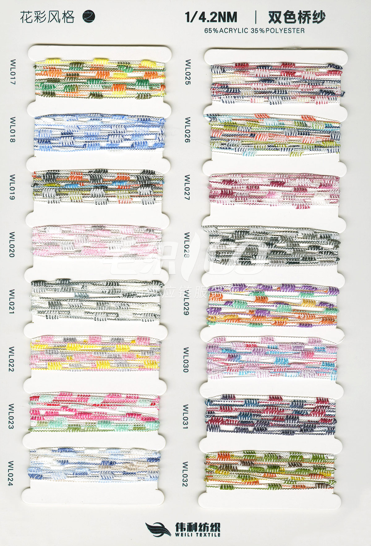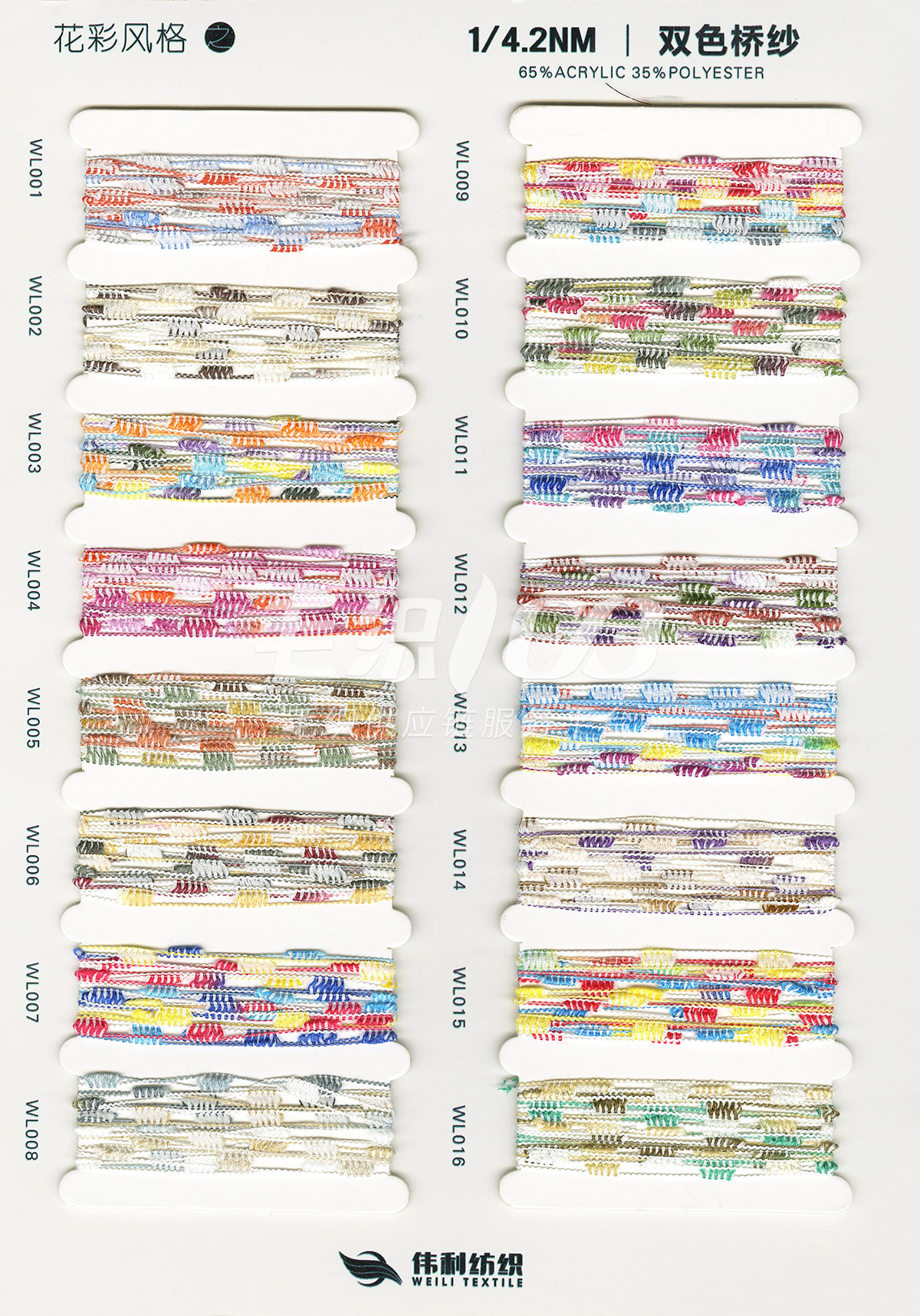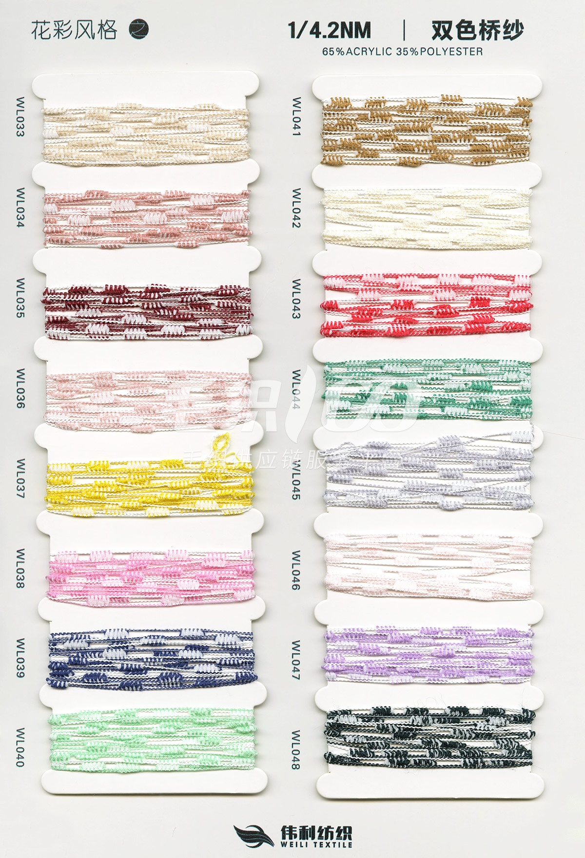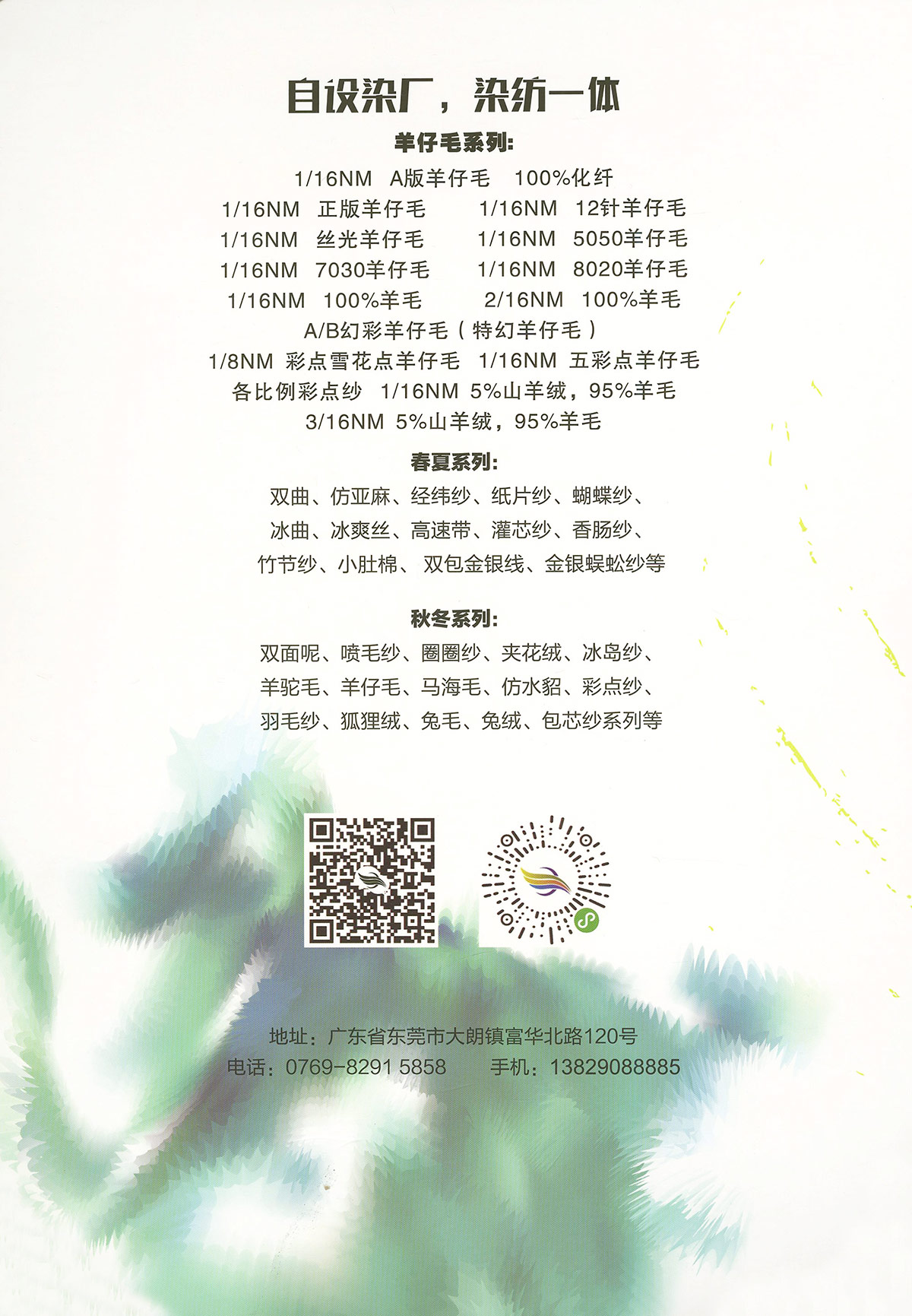 特種花式紗系列:螞蟻絨、棉花絨、珊瑚絨、花駝絨、磨毛考拉絨、彩虹噴毛紗、羊絨珠片紗、再生莫代爾珠片紗、漸變彩虹噴毛系列、金銀蜈蚣紗、金銀玻璃紗、金銀雙包紗、金銀空心帶、香腸紗、蜻蜓紗、蝴蝶紗、高速帶、馬海毛、空心帶、米粉紗、小肚棉、彩點紗、經緯紗、水結珠、梯仔紗、菊花紗、燈籠紗、羊駝毛、圈圈紗、等花式特種紗。