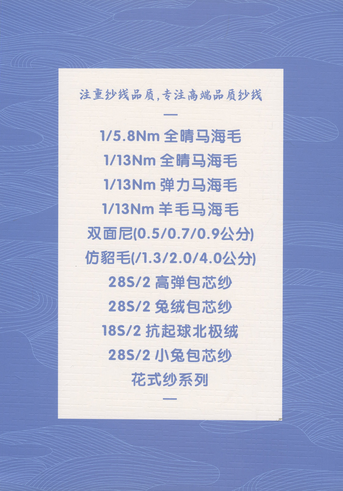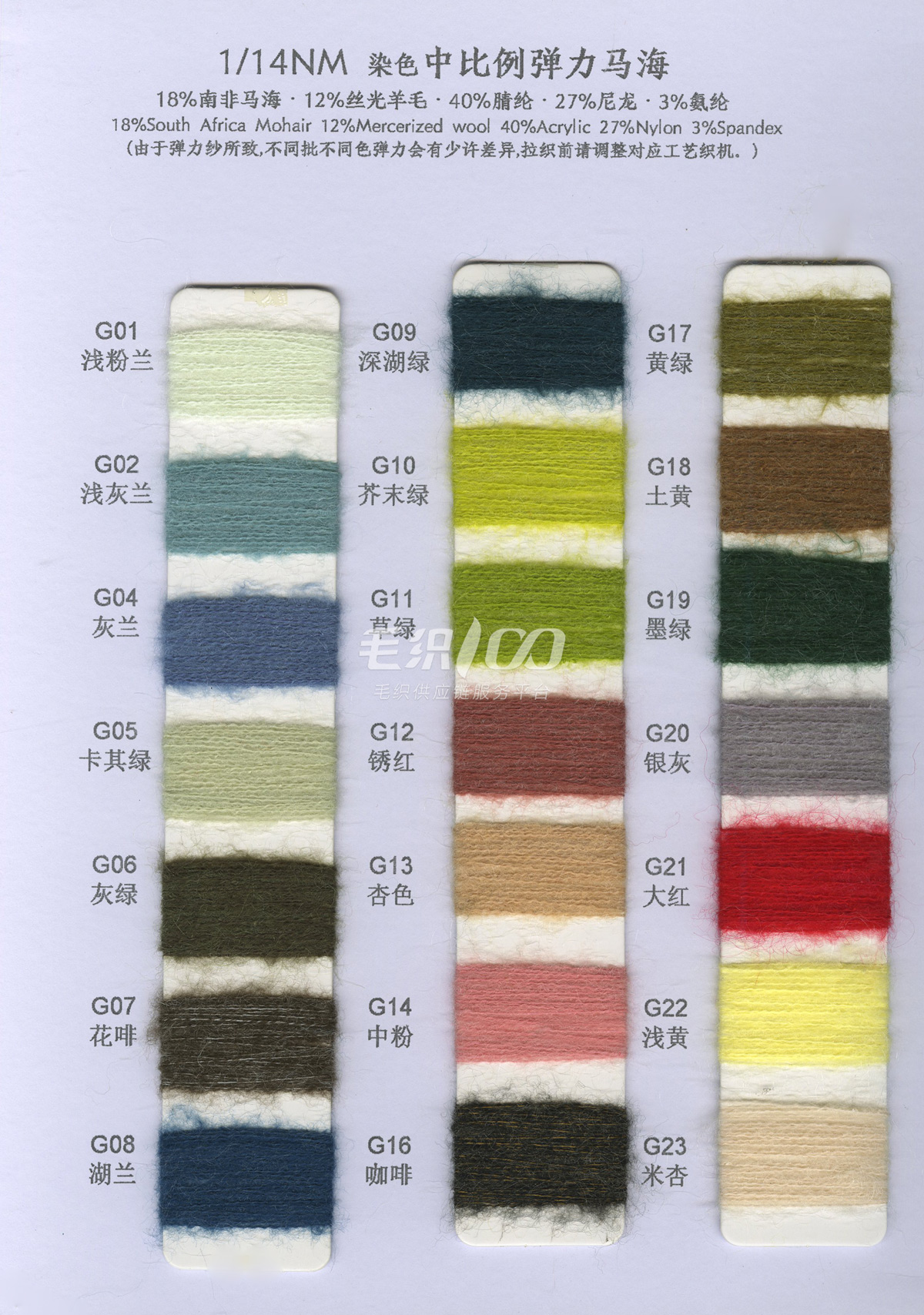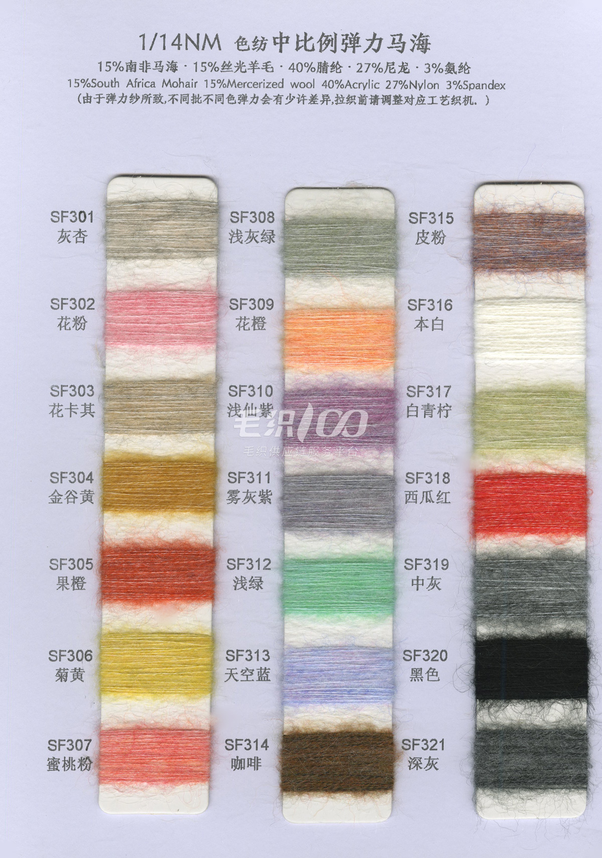 1/13NM 彈力羊毛馬海毛·色紡 8%絲光羊毛 62%腈綸 27%聚酯纖維 3%氨綸 1/13NM 高比例羊毛馬海毛 30%南非馬海 30%絲光羊毛 40%尼龍 1/18NM 超柔羊駝馬海毛 15%超細羊駝 15%絲光羊毛 30%錦綸 40%腈綸 1/14NM 中比例彈力羊毛馬海 15%南非馬海 15%絲光羊毛 40%腈綸 27%尼龍 3%氨綸 常規產品: 1/13NM 彈力馬海毛 77%腈綸 20%尼龍 3%氨綸 1/13NM 羊毛馬海毛 10%羊毛 35%尼