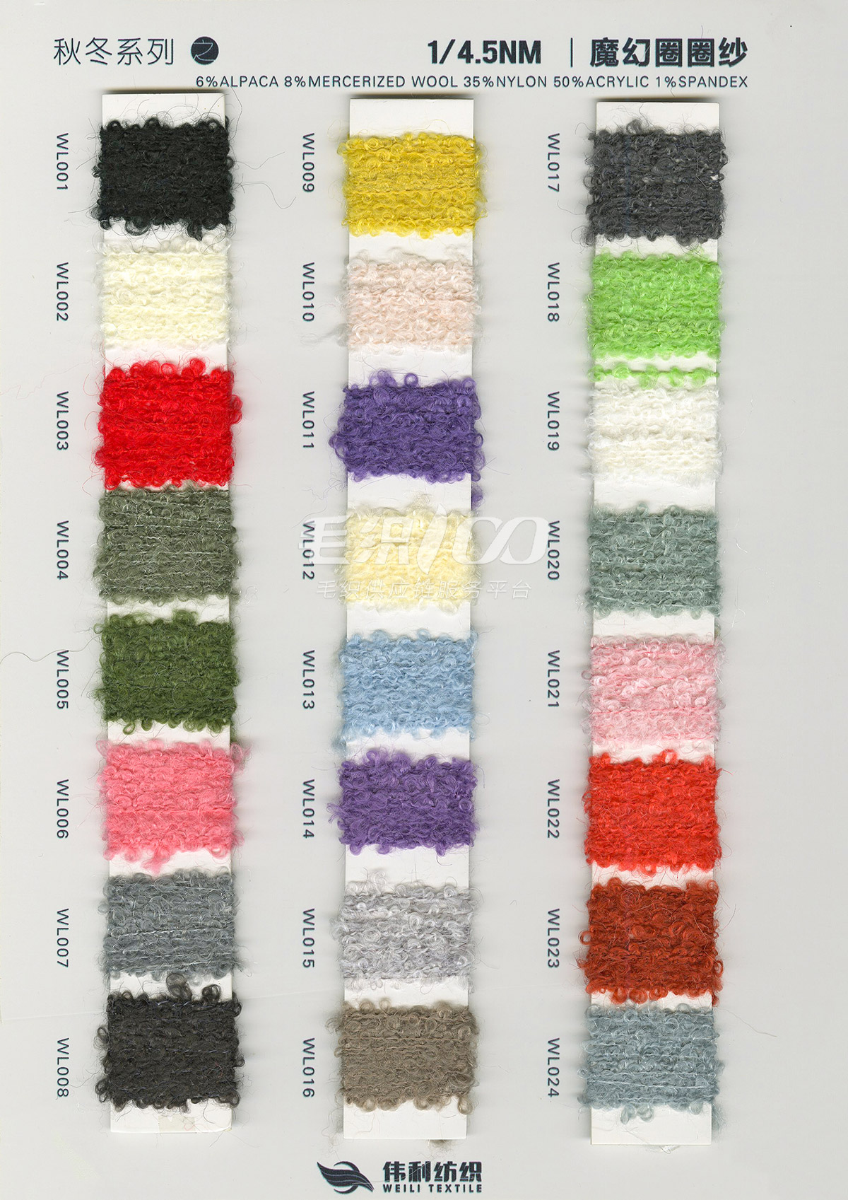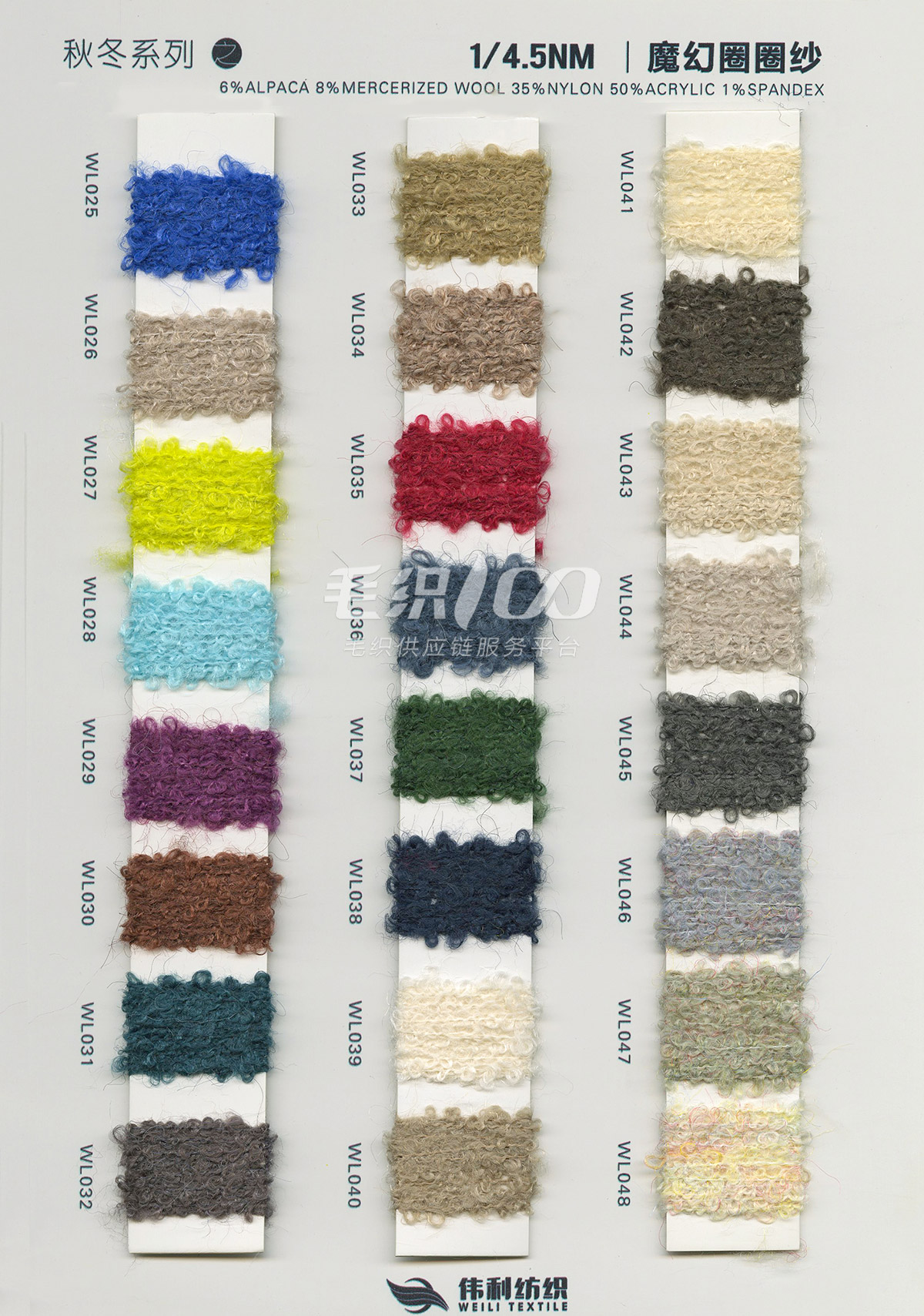 特種花式紗系列:螞蟻絨、棉花絨、珊瑚絨、花駝絨、磨毛考拉絨、彩虹噴毛紗、羊絨珠片紗、再生莫代爾珠片紗、漸變彩虹噴毛系列、金銀蜈蚣紗、金銀玻璃紗、金銀雙包紗、金銀空心帶、香腸紗、蜻蜓紗、蝴蝶紗、高速帶、馬海毛、空心帶、米粉紗、小肚棉、彩點紗、經緯紗、水結珠、梯仔紗、菊花紗、燈籠紗、羊駝毛、圈圈紗、等花式特種紗。