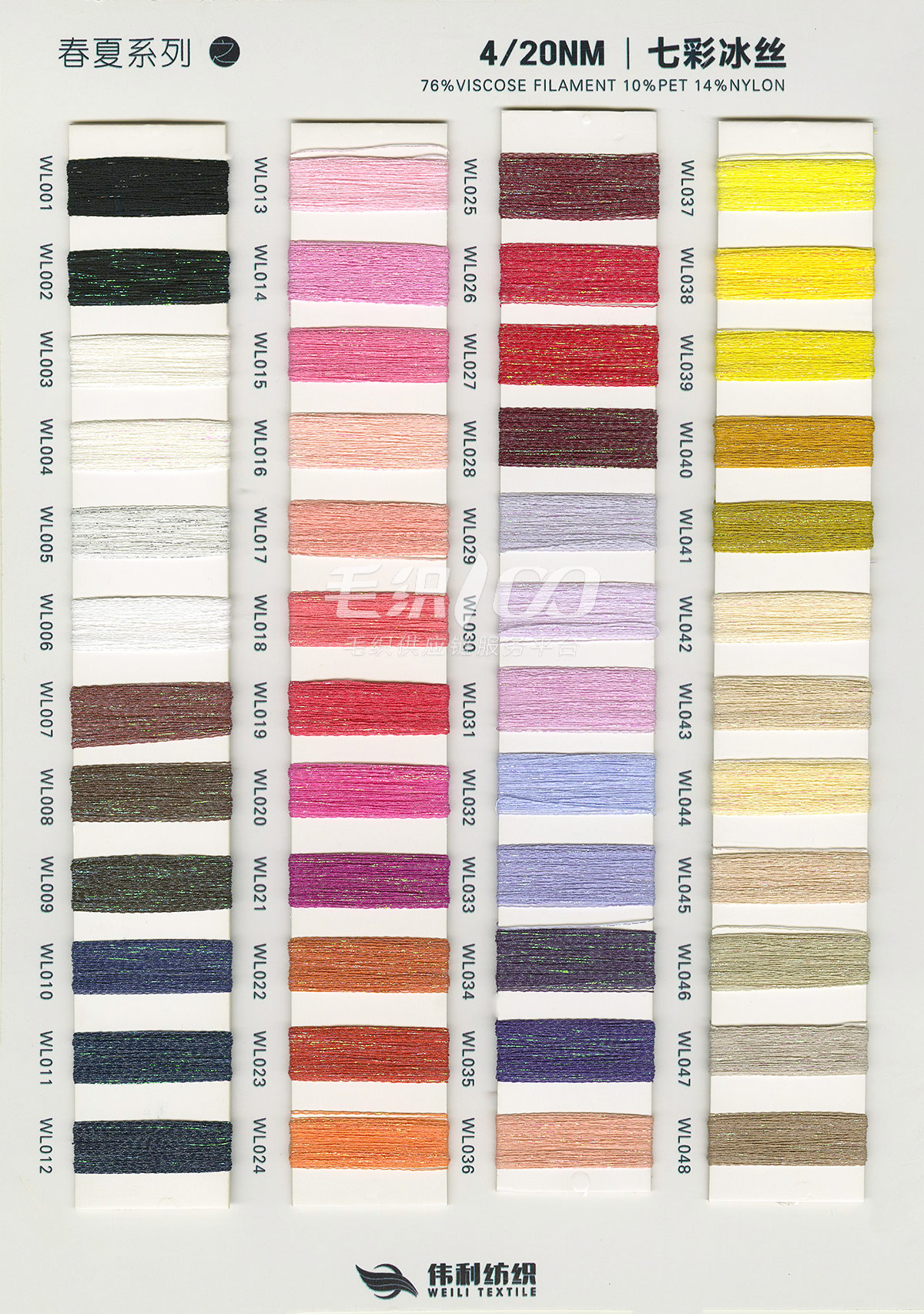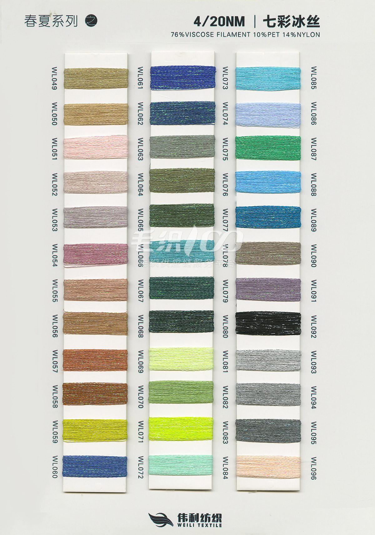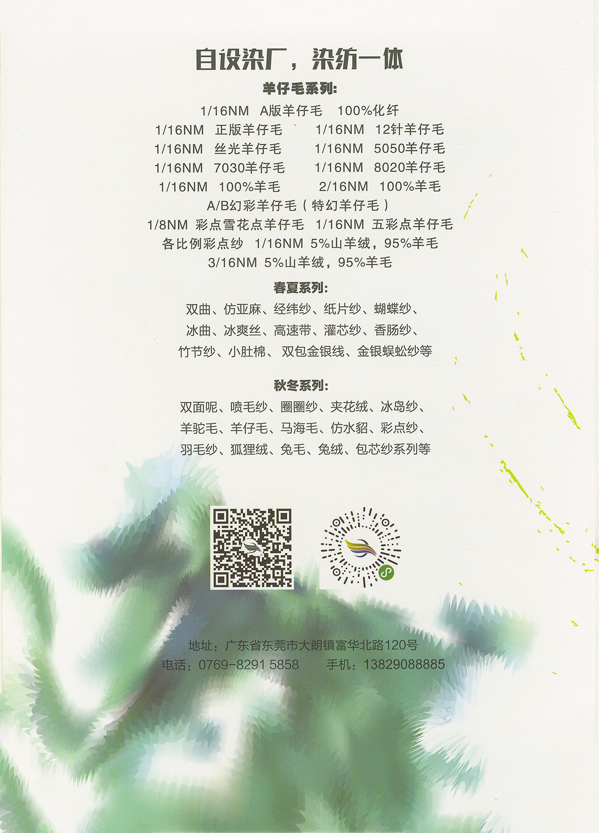 特種花式紗系列:螞蟻絨、棉花絨、珊瑚絨、花駝絨、磨毛考拉絨、彩虹噴毛紗、羊絨珠片紗、再生莫代爾珠片紗、漸變彩虹噴毛系列、金銀蜈蚣紗、金銀玻璃紗、金銀雙包紗、金銀空心帶、香腸紗、蜻蜓紗、蝴蝶紗、高速帶、馬海毛、空心帶、米粉紗、小肚棉、彩點紗、經緯紗、水結珠、梯仔紗、菊花紗、燈籠紗、羊駝毛、圈圈紗、等花式特種紗。