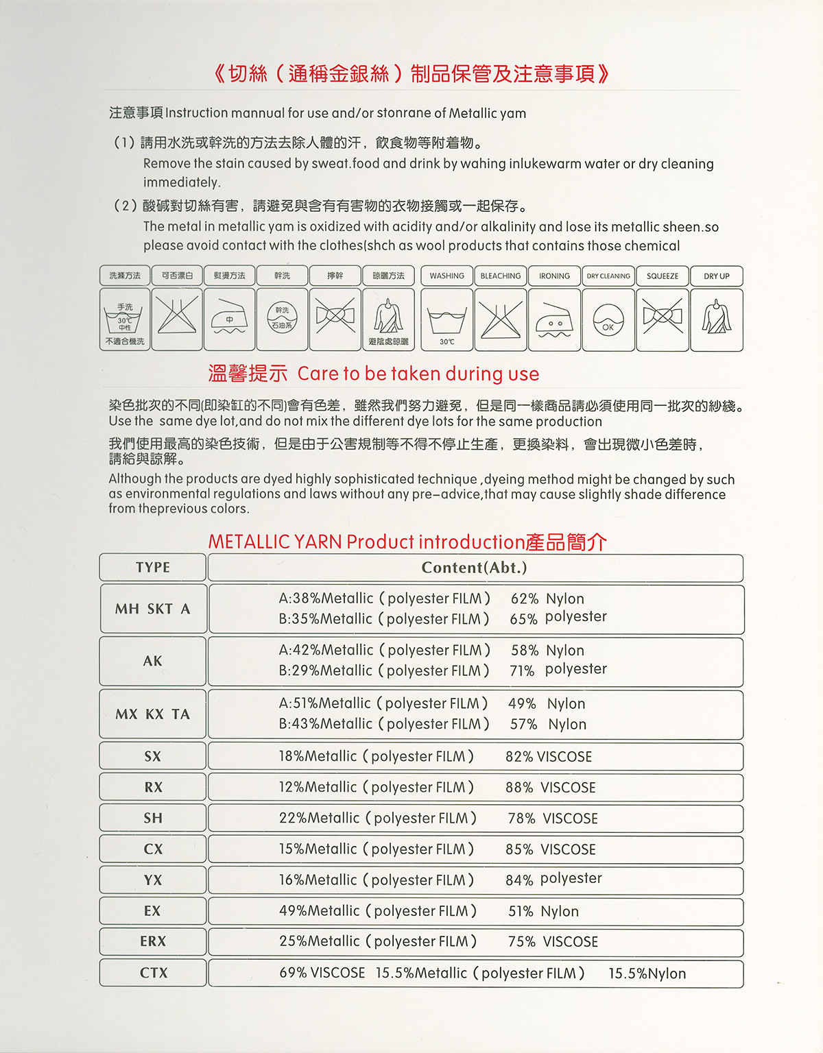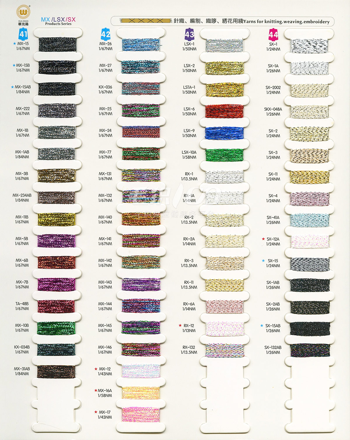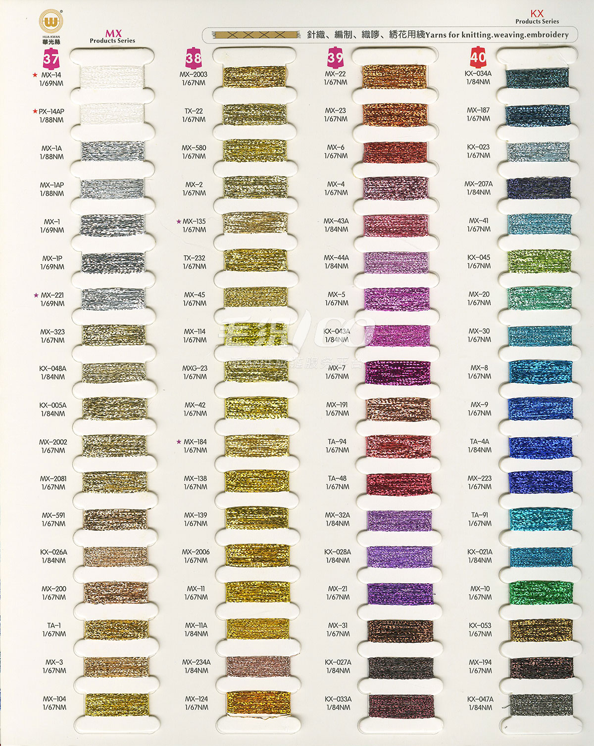 1/110”普通金銀絲:MH&SKT\ A;1/69”、1/110”普通金銀絲:MX、KX、TA、TX系列;1/169”超細金銀絲AK、HAK系列;1/169”超細金銀絲EX系列;1/254”極細金銀絲ZX系列;1/254”極細金銀絲ZAK系列;金銀絲花式紗ZRX系列;金銀絲粒粒紗;金銀絲粒粒紗 S系列多股金、銀;金蔥棉粒粒紗;金蔥香腸紗;金蔥結子紗;超細金蔥結子紗;金絲絨A系列;金絲絨B系列