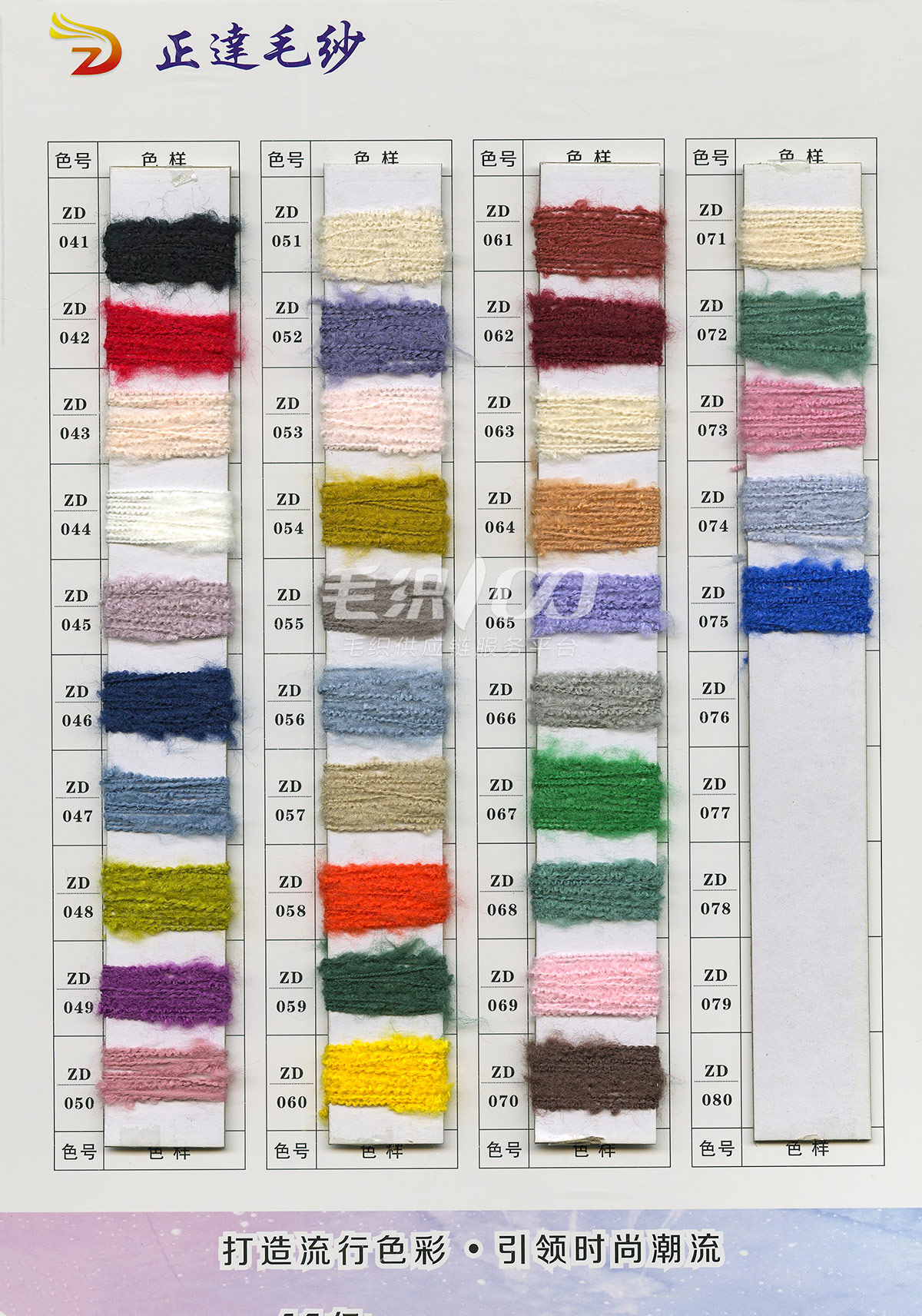 新型紗線:仿西班牙紗、17支高捻天麻絲、13支K絨、9.5支炫彩珊瑚絨、20支北極絨之星、幸運8字紗、捻紗之美、彩色之美、2.5支段彩噴噴毛、9支高比例公主兔、亮絲長毛、1/28支萬能配角紗…… 主推紗線:9支抗起球澳呢絨、14支漸變彩虹絨、10支珠片拉毛紗、0.9m不掉毛水晶紗、13支雪尼爾、14支雙色駝毛/雙色毛兔、14支仿牛絨、14支色紡駝毛絨、仿西班牙紗、新型捌字紗、2.6支段染網紗……