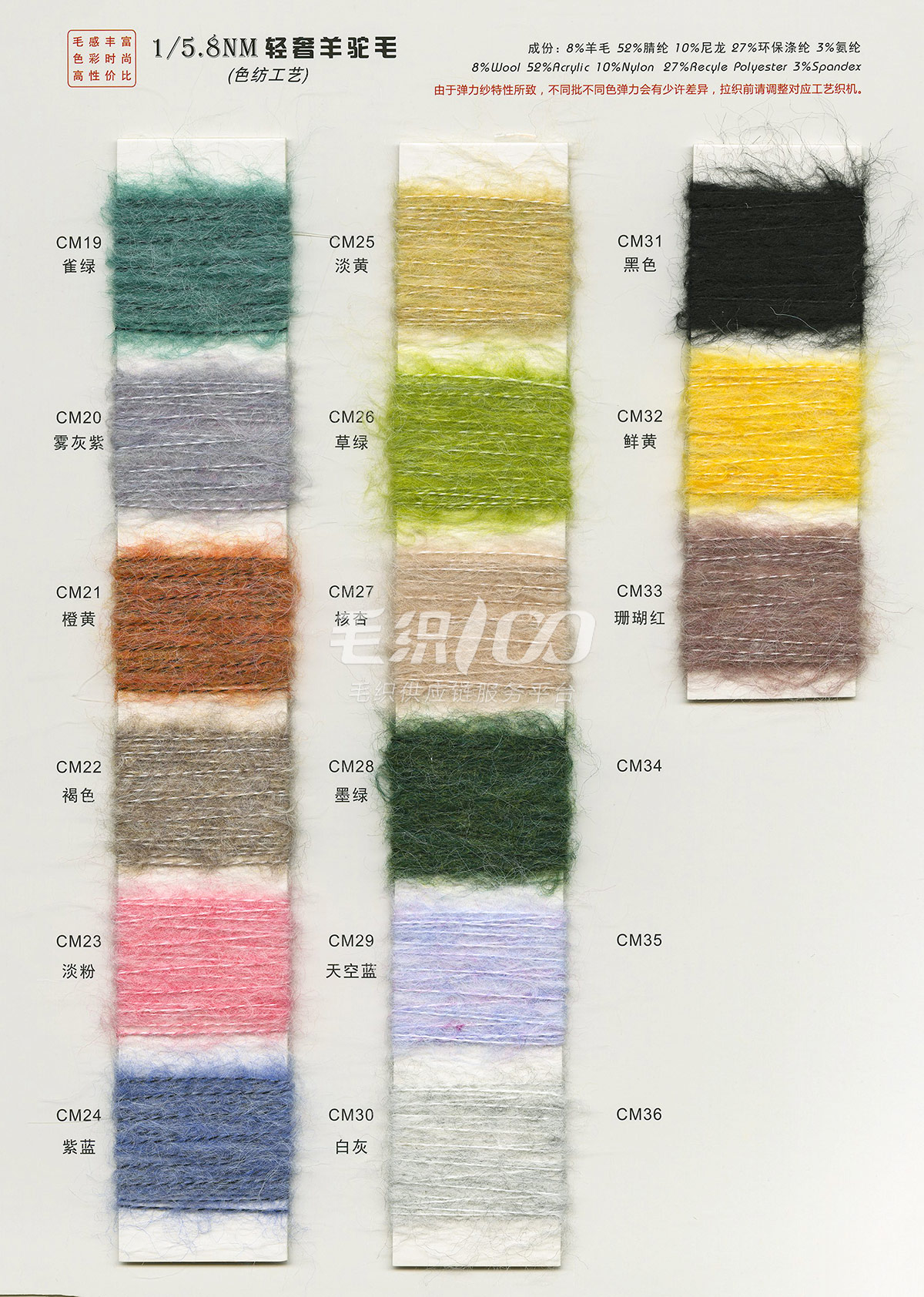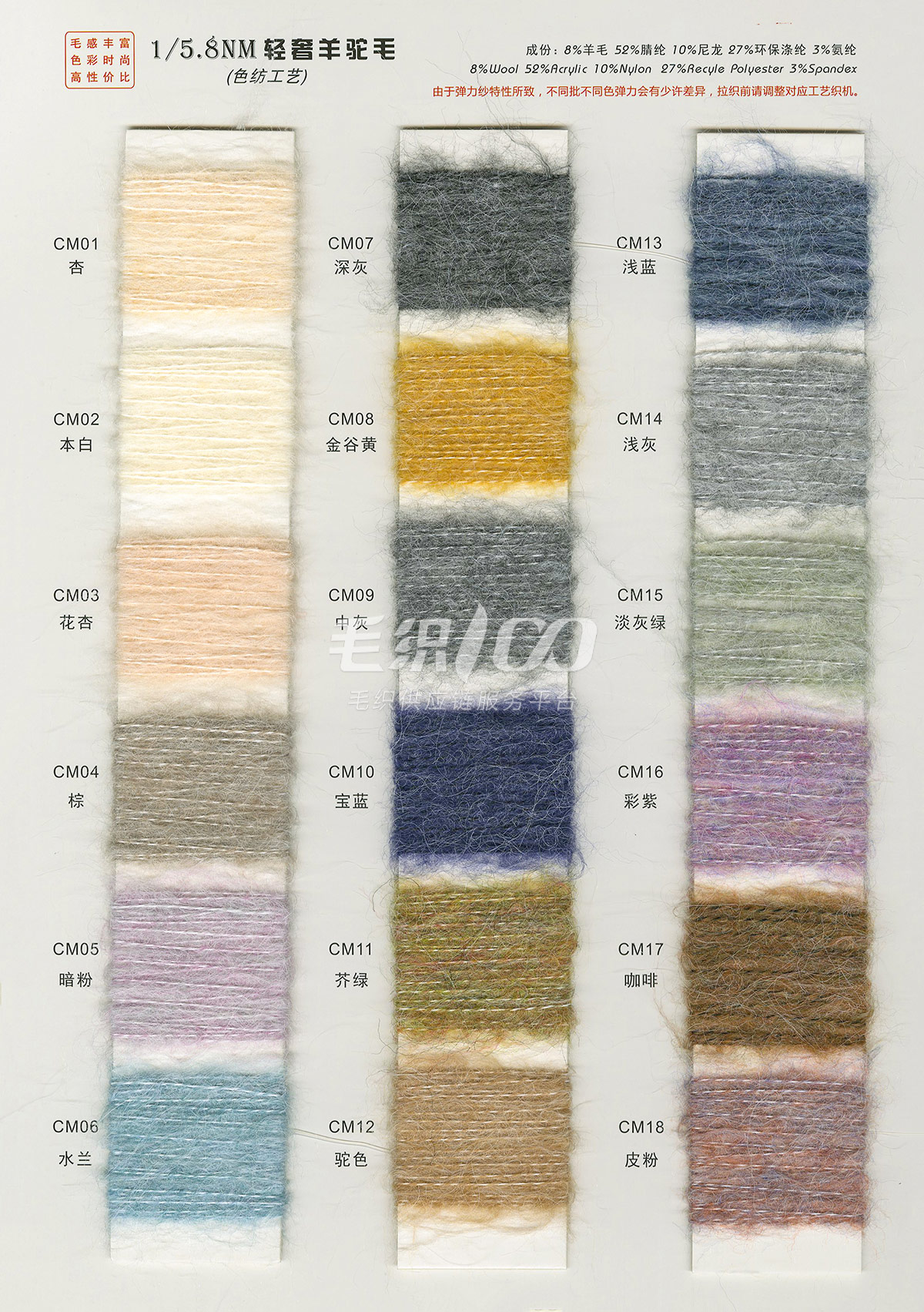 一. 流行花式紗線(中低價位):磨毛紗、拉毛紗、圈圈紗、噴毛紗 ; 二. 高品質常規料:包芯紗、北極絨(綿羊絨); 三. 膨體紗線:絲光膨體羊毛、新型膨體羊毛、膨體棉晴 。