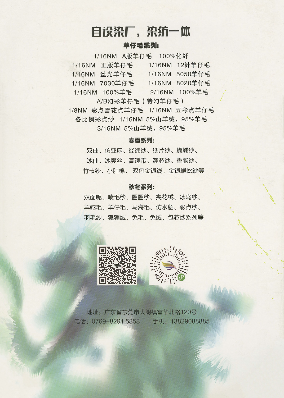 特種花式紗系列:螞蟻絨、棉花絨、珊瑚絨、花駝絨、磨毛考拉絨、彩虹噴毛紗、羊絨珠片紗、再生莫代爾珠片紗、漸變彩虹噴毛系列、金銀蜈蚣紗、金銀玻璃紗、金銀雙包紗、金銀空心帶、香腸紗、蜻蜓紗、蝴蝶紗、高速帶、馬海毛、空心帶、米粉紗、小肚棉、彩點紗、經緯紗、水結珠、梯仔紗、菊花紗、燈籠紗、羊駝毛、圈圈紗、等花式特種紗。