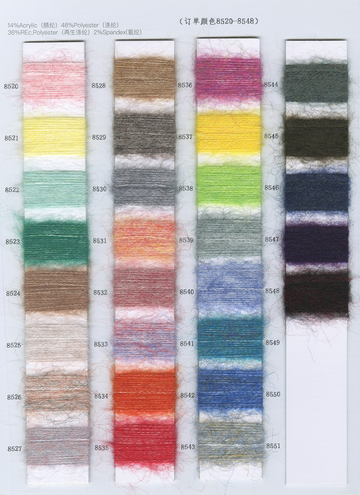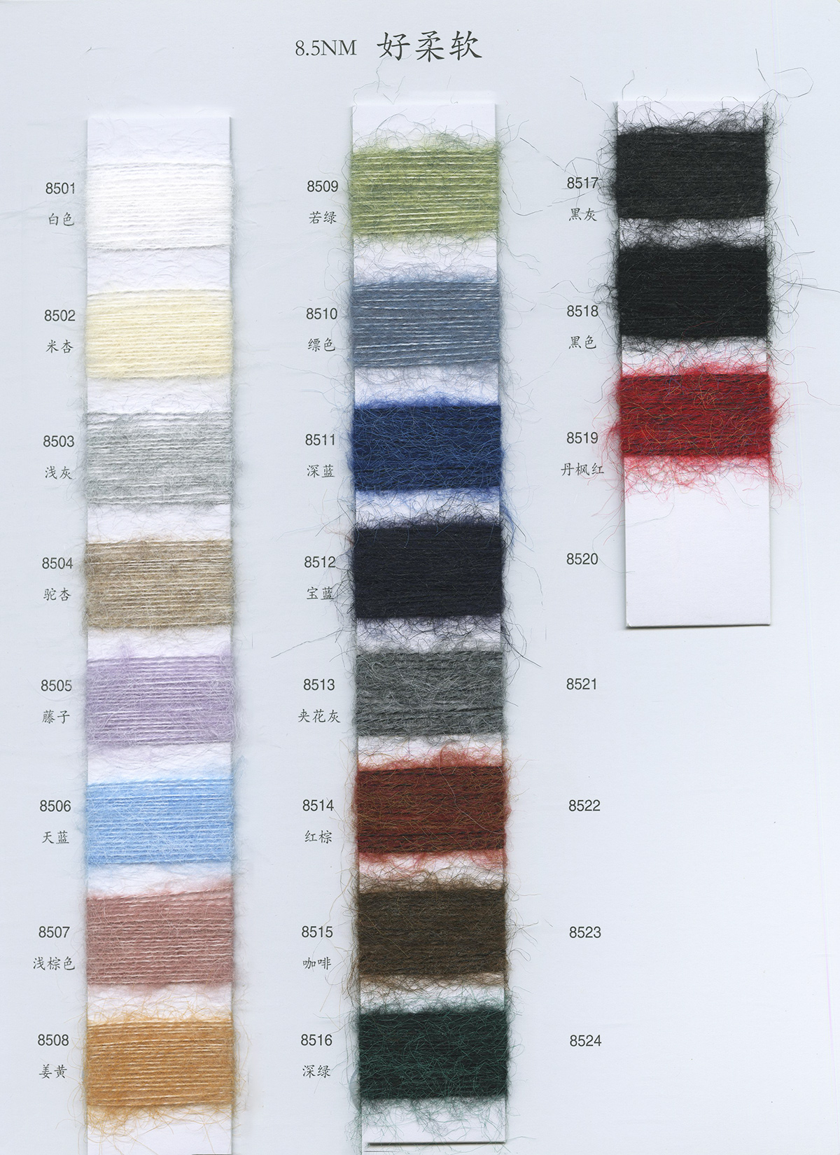 4.9/1NM超柔密圈圈(單色/雙色),4.3/1NM彩粒圈圈,2.4/1NM菊花絨,2.2/1NM法蘭絨,2.2/1NM星星點點,8.2/1NM彩點馬海,8.5/1NM好柔軟,4/1和6/1NM彩糯