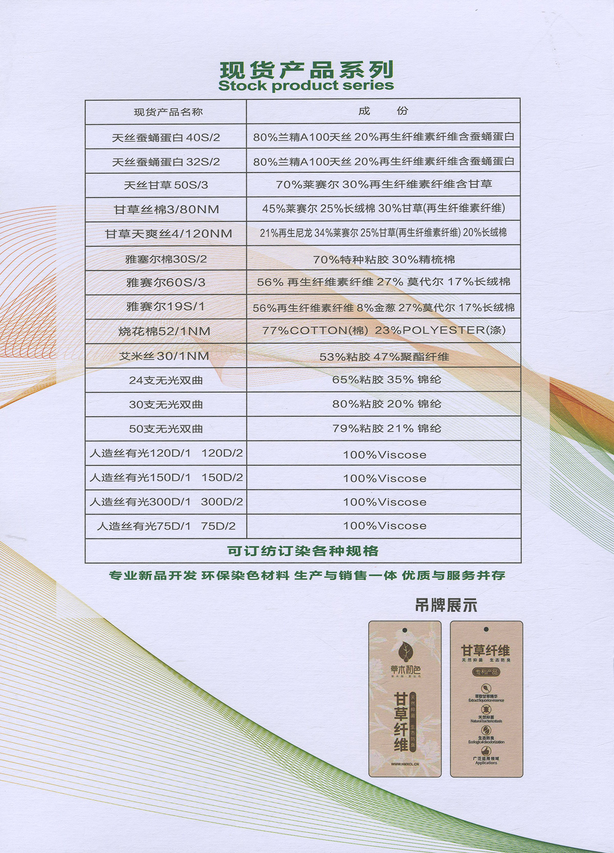 主營:功能性纖維及紗線產(chǎn)品,蠶蛹蛋白,羊絨蛋白,羽毛蛋白,甘草纖維,天絲蠶蛹蛋白.天絲甘草,再生環(huán)保產(chǎn)品及各種規(guī)格人造絲