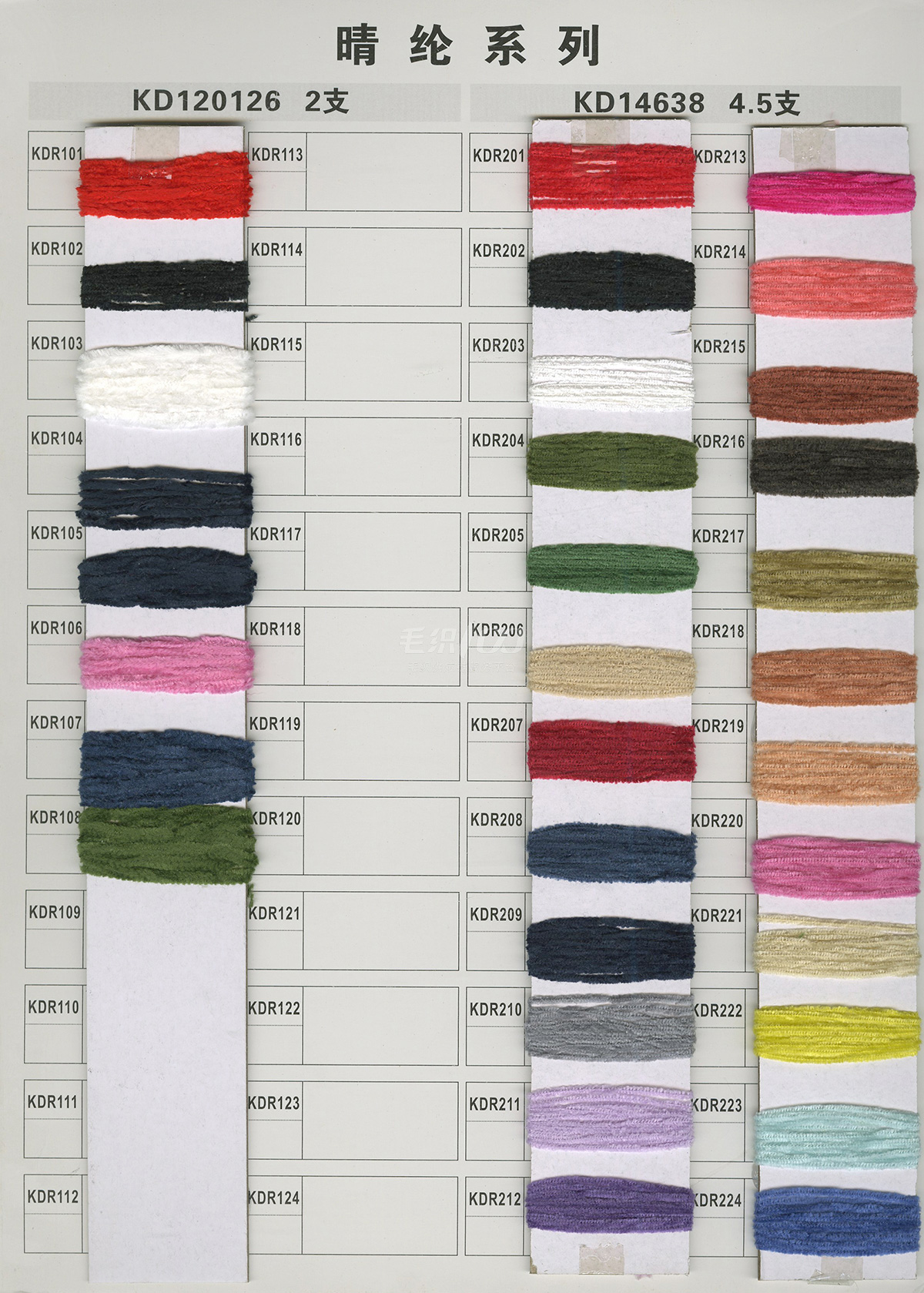 乒乓紗、菊花紗、絲絨紗、絲絨大肚、漸變花式紗、噴毛紗、小肚紗、圈圈紗、彩點紗、色紡冰島紗、仿羊絨、五五毛、貓毛紗、燈籠紗、蜈蚣紗、羽毛紗、仿貂毛、樓梯紗、牙刷紗、斜毛紗、高速帶、米粉紗、繡花線等特種紗。