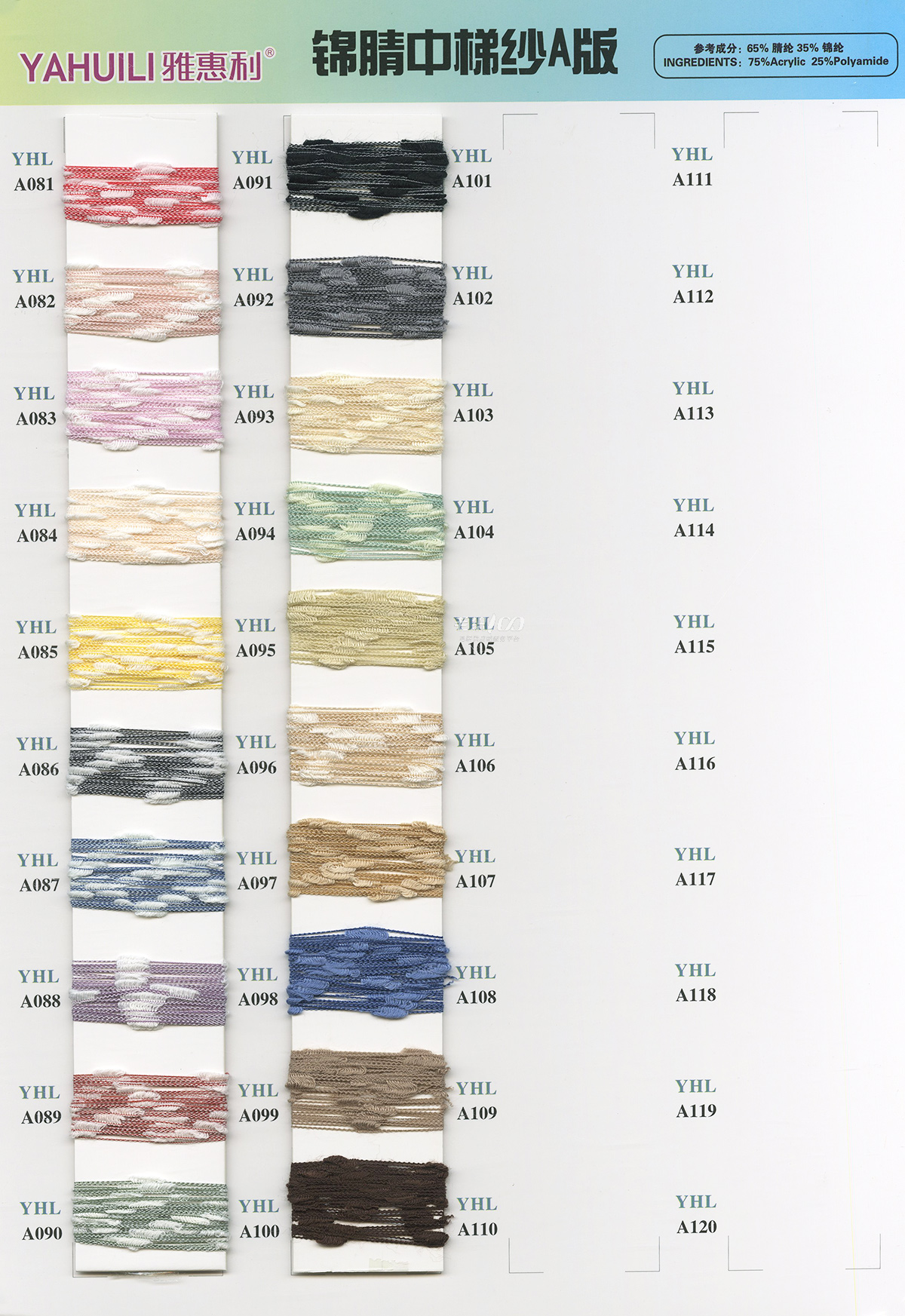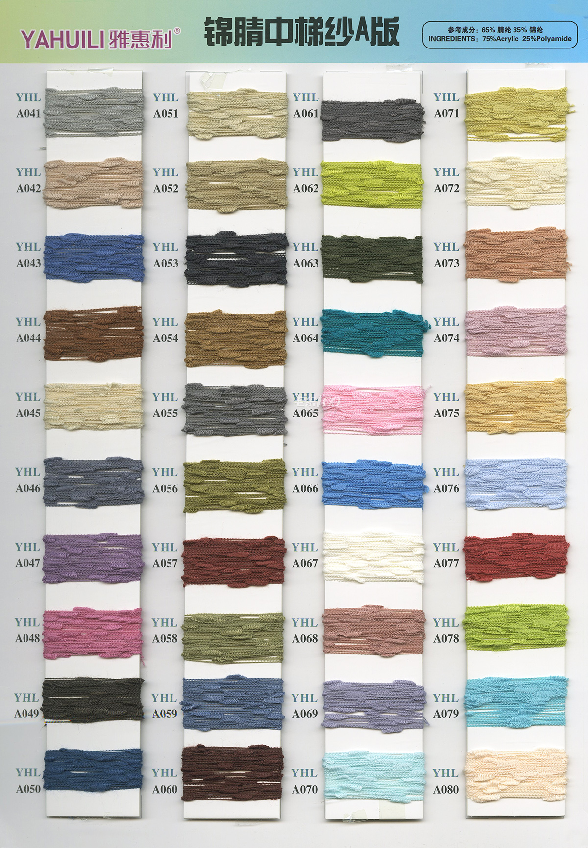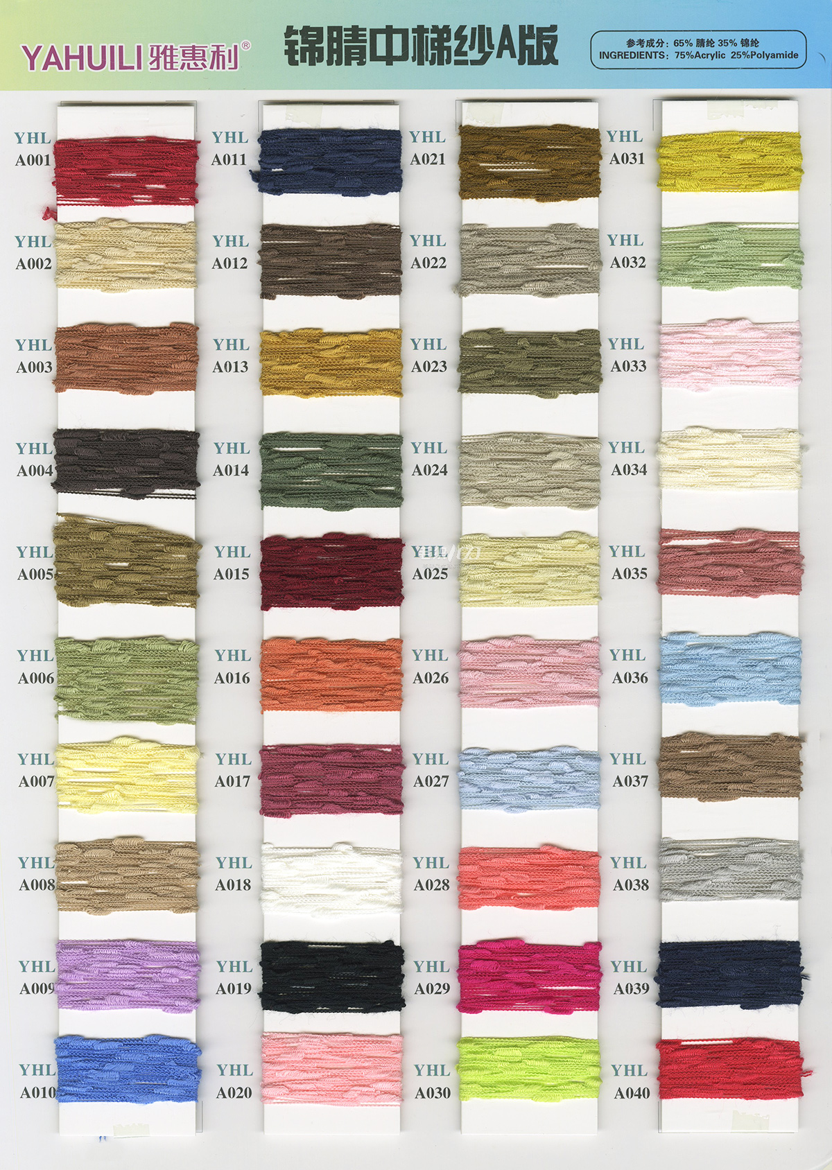 專業開發各種花式紗、特種紗、馬海毛等 各式時尚紗線,網紅紗線等 主營:828膨體人造毛/仿西班牙絨/仿麻包纏紗/水晶麻絲/仿麻結子紗/八字紗/曲珠紗/貂毛類/仿兔羊絨/各個支數全晴空心帶/5.6支全晴小肚棉/鹿毛絨/各種段染紗/