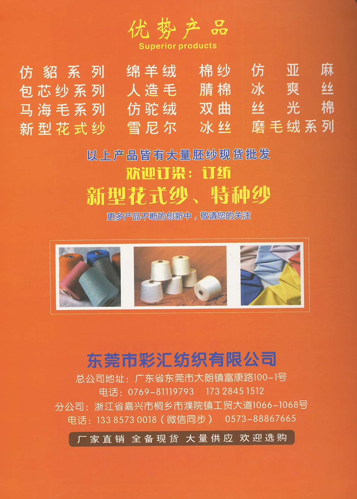 自設染紡廠-現貨色紗;抗起球包芯紗、磨毛絨、圈圈紗、拉毛紗、北極絨、冰絲、花式紗;