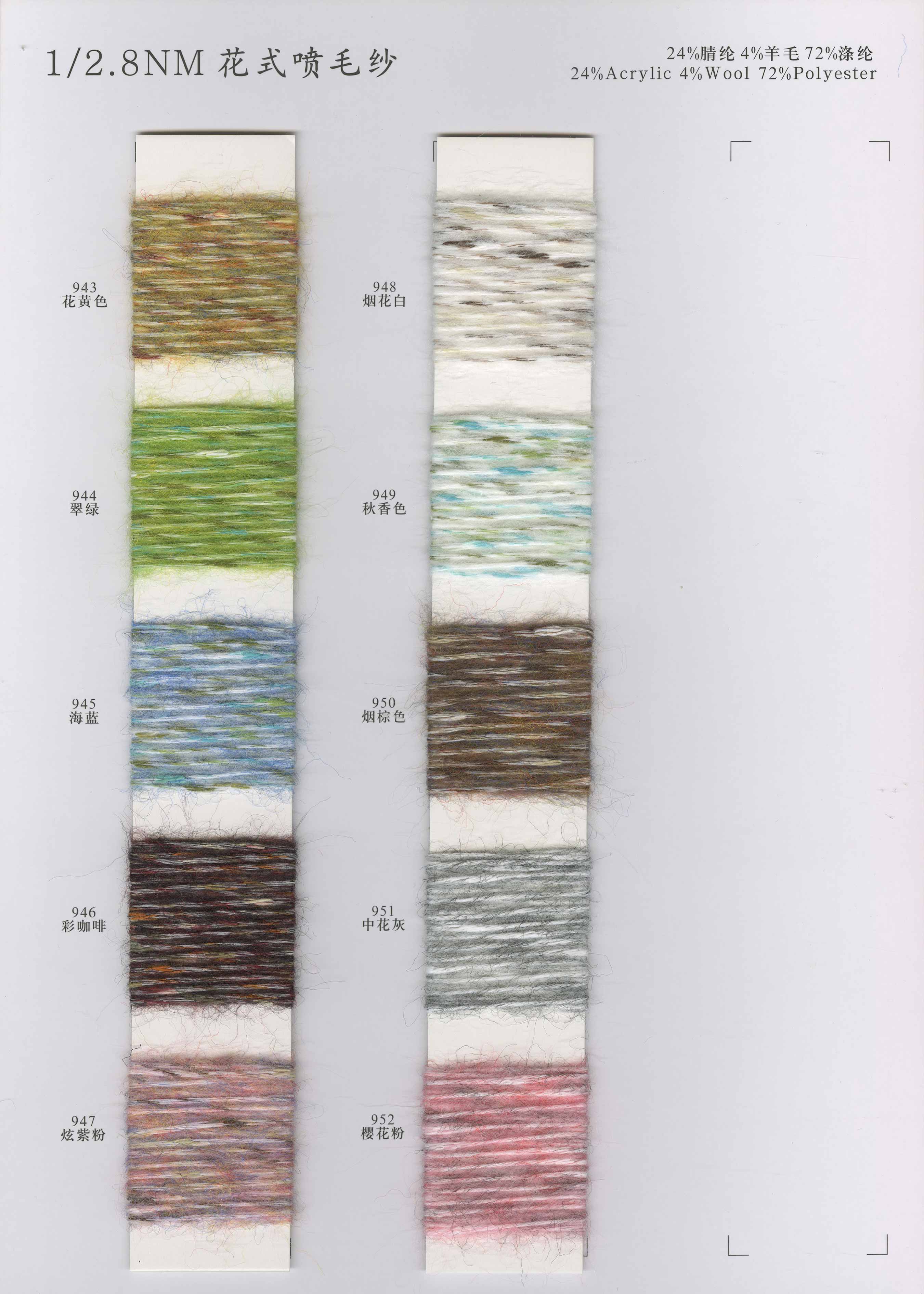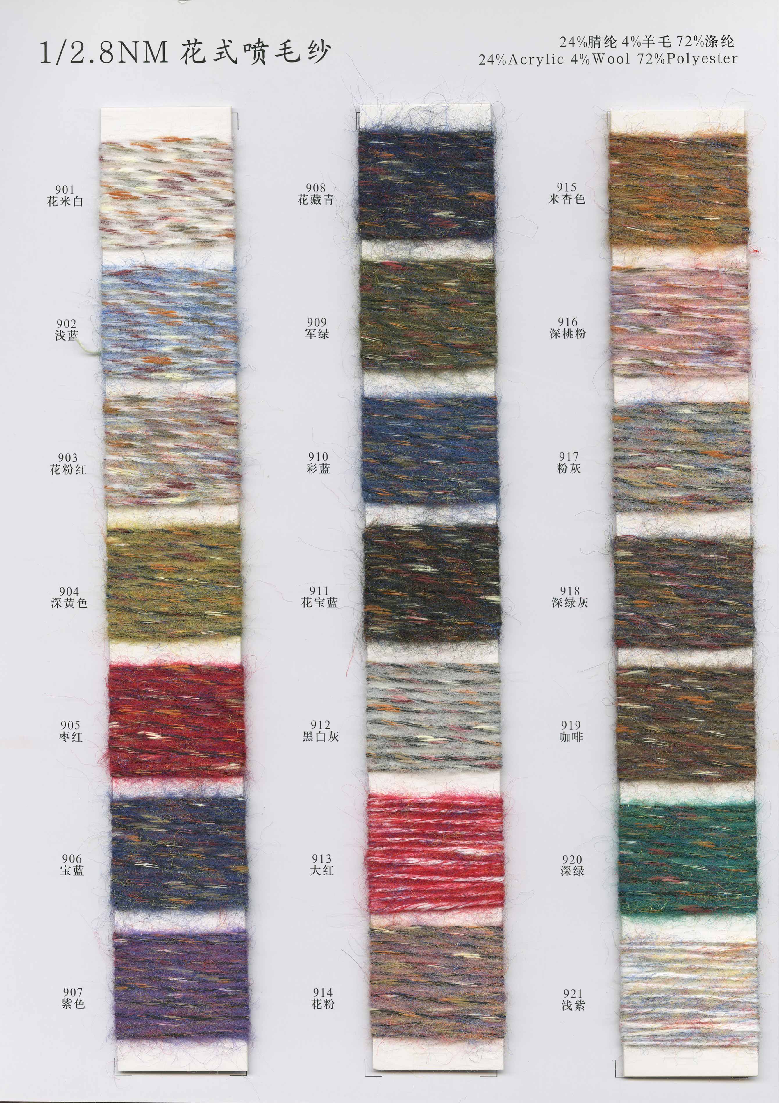 1/2.8NM花式噴毛紗、1/6NM蘇麗噴毛紗、1/5.5NM羊駝噴毛紗、1/6.5NM駱馬絨噴毛紗、1/3NM彩點噴毛紗、1/3.8NM閃光噴毛紗、1/2.8NM多彩噴毛紗、1/5.5NM色紡噴毛紗、1/3.5NM彩虹噴毛紗、1/3NM花式棉噴毛紗、1/13NM楓葉羊駝毛、1/
