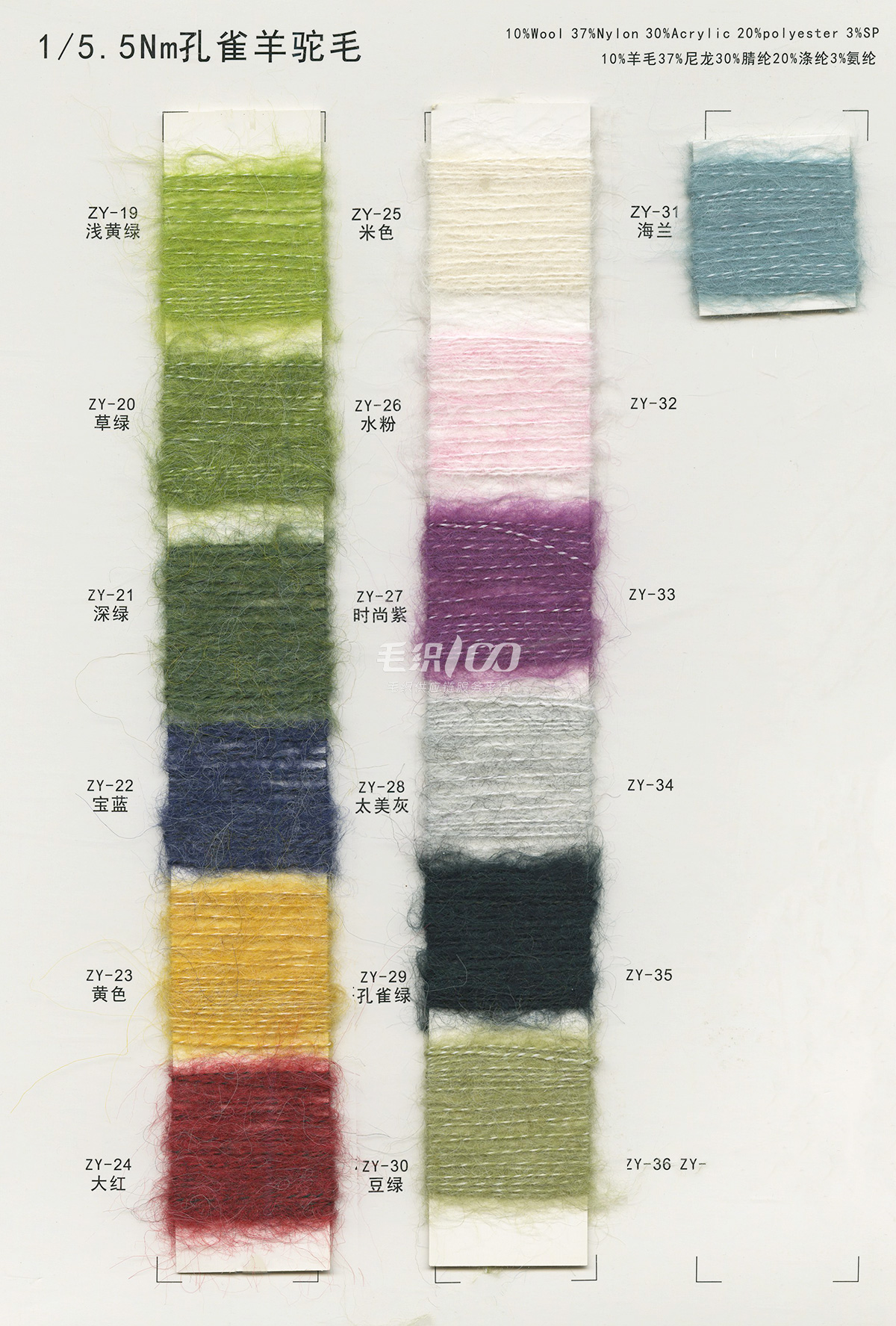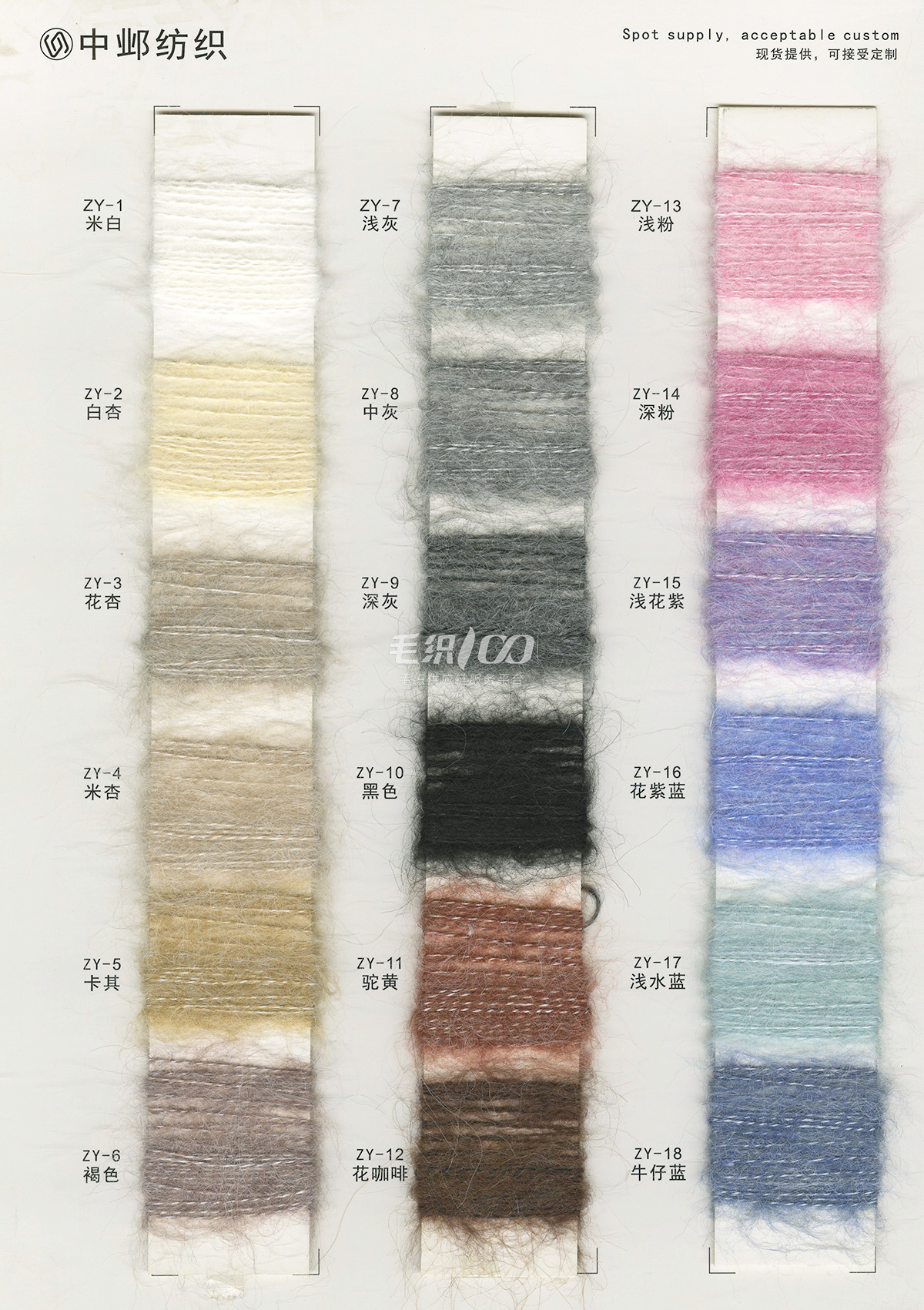 1/2.8NM花式噴毛紗、1/6NM蘇麗噴毛紗、1/5.5NM羊駝噴毛紗、1/6.5NM駱馬絨噴毛紗、1/3NM彩點噴毛紗、1/3.8NM閃光噴毛紗、1/2.8NM多彩噴毛紗、1/5.5NM色紡噴毛紗、1/3.5NM彩虹噴毛紗、1/3NM花式棉噴毛紗、1/13NM楓葉羊駝毛、1/