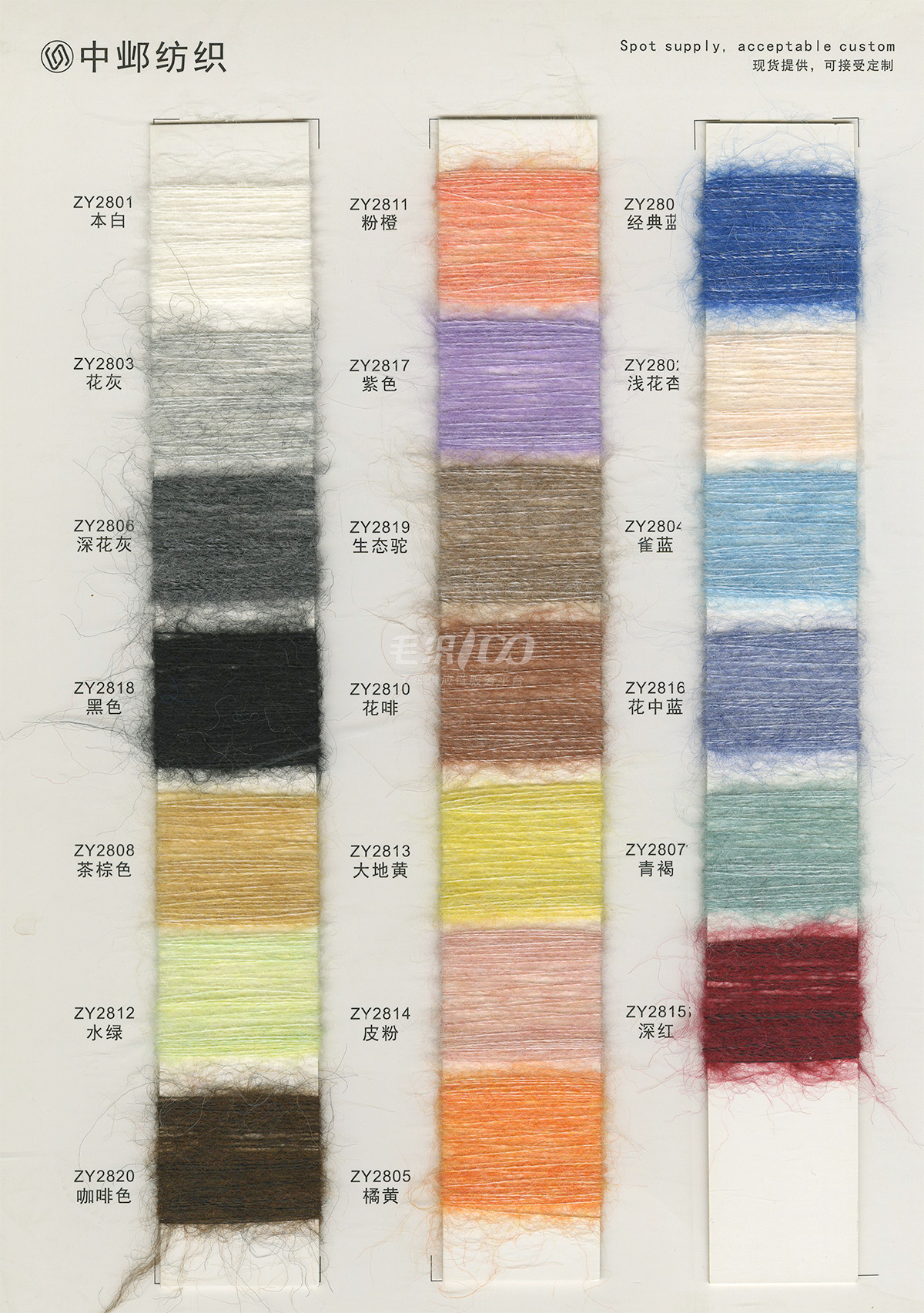 1/2.8NM花式噴毛紗、1/6NM蘇麗噴毛紗、1/5.5NM羊駝噴毛紗、1/6.5NM駱馬絨噴毛紗、1/3NM彩點(diǎn)噴毛紗、1/3.8NM閃光噴毛紗、1/2.8NM多彩噴毛紗、1/5.5NM色紡噴毛紗、1/3.5NM彩虹噴毛紗、1/3NM花式棉噴毛紗、1/13NM楓葉羊駝毛、1/