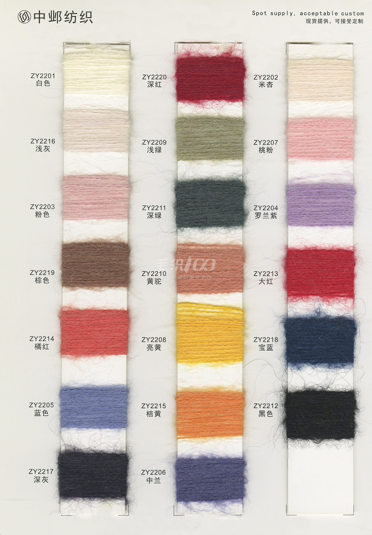 1/2.8NM花式噴毛紗、1/6NM蘇麗噴毛紗、1/5.5NM羊駝噴毛紗、1/6.5NM駱馬絨噴毛紗、1/3NM彩點噴毛紗、1/3.8NM閃光噴毛紗、1/2.8NM多彩噴毛紗、1/5.5NM色紡噴毛紗、1/3.5NM彩虹噴毛紗、1/3NM花式棉噴毛紗、1/13NM楓葉羊駝毛、1/