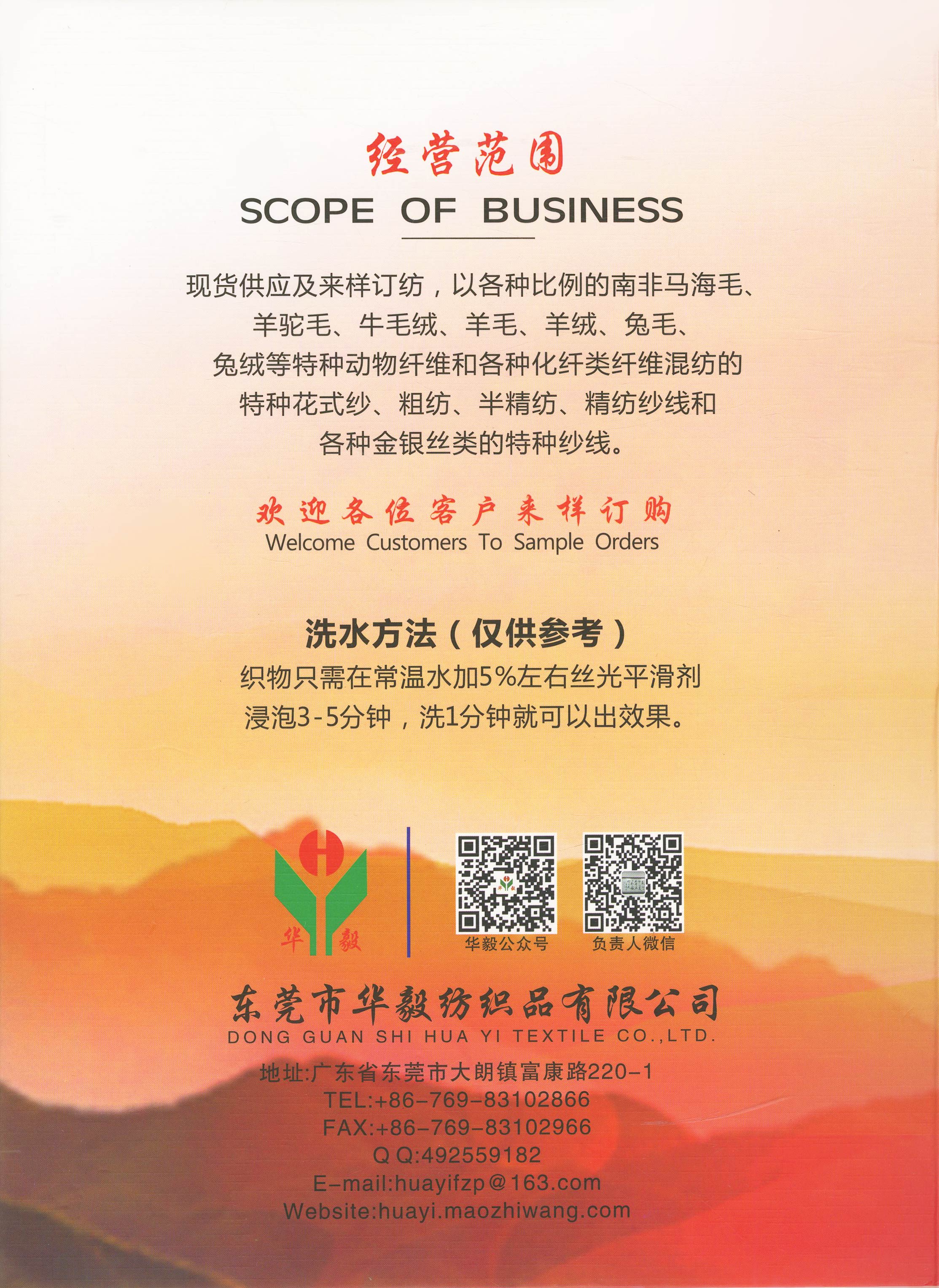 華毅紡織主營:南非馬海毛系列 、羊駝毛 、羊毛、噴毛紗、圈圈紗、羊仔毛、兔毛兔絨紗、冰島毛、大肚紗等各種比例的特種花式紗、粗紡、半精紡、精紡等色紗現貨。