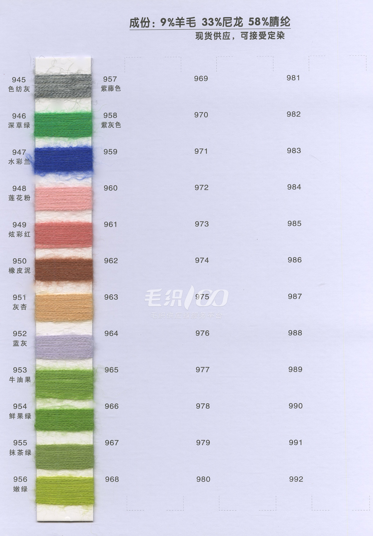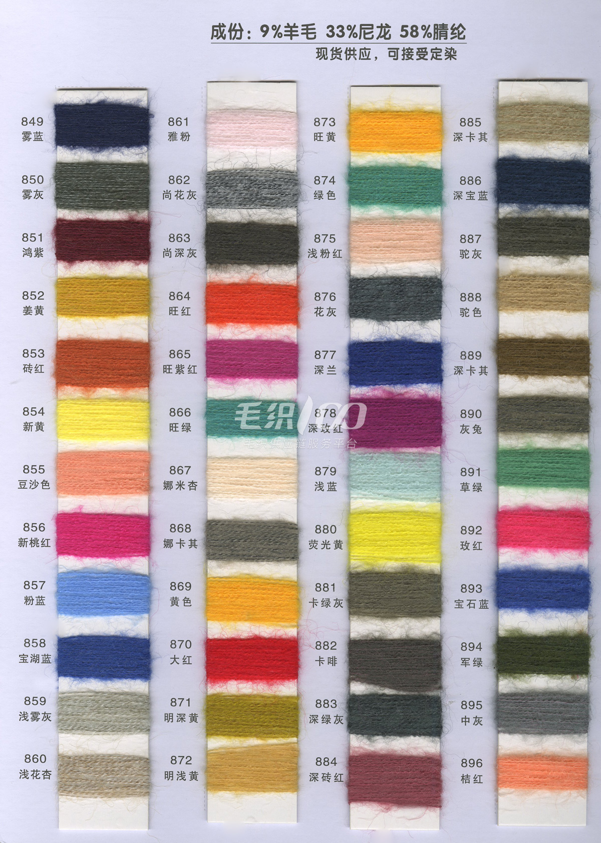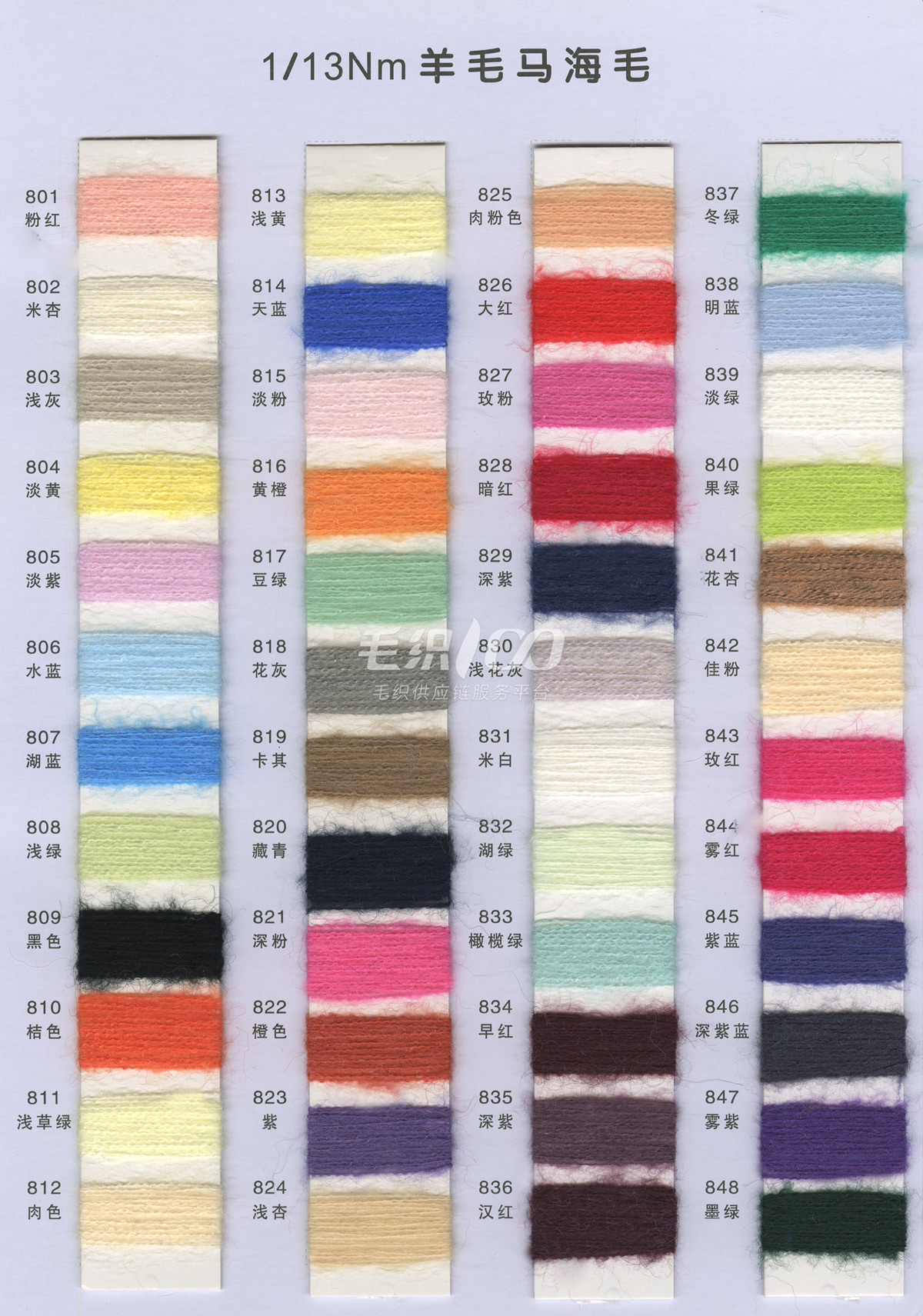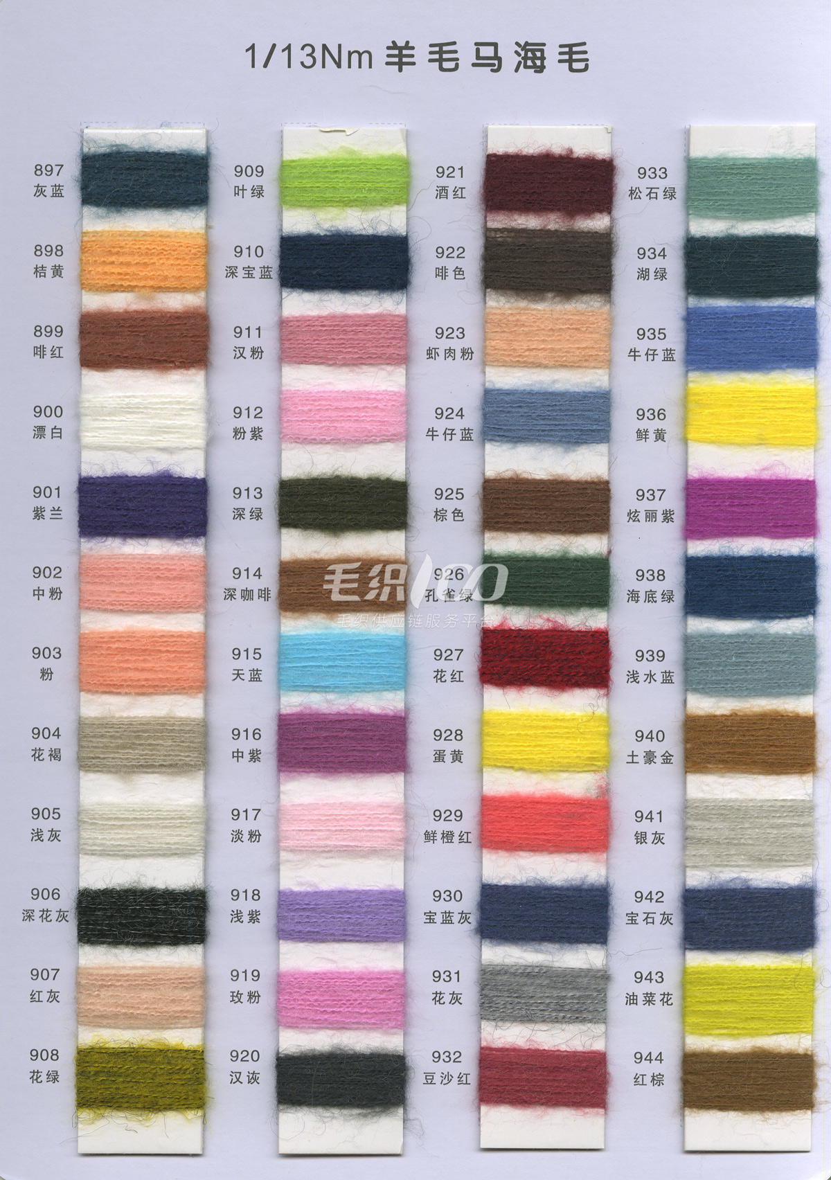 1/13NM 彈力羊毛馬海毛·色紡 8%絲光羊毛 62%腈綸 27%聚酯纖維 3%氨綸 1/13NM 高比例羊毛馬海毛 30%南非馬海 30%絲光羊毛 40%尼龍 1/18NM 超柔羊駝馬海毛 15%超細羊駝 15%絲光羊毛 30%錦綸 40%腈綸 1/14NM 中比例彈力羊毛馬海 15%南非馬海 15%絲光羊毛 40%腈綸 27%尼龍 3%氨綸 常規產品: 1/13NM 彈力馬海毛 77%腈綸 20%尼龍 3%氨綸 1/13NM 羊毛馬海毛 10%羊毛 35%尼