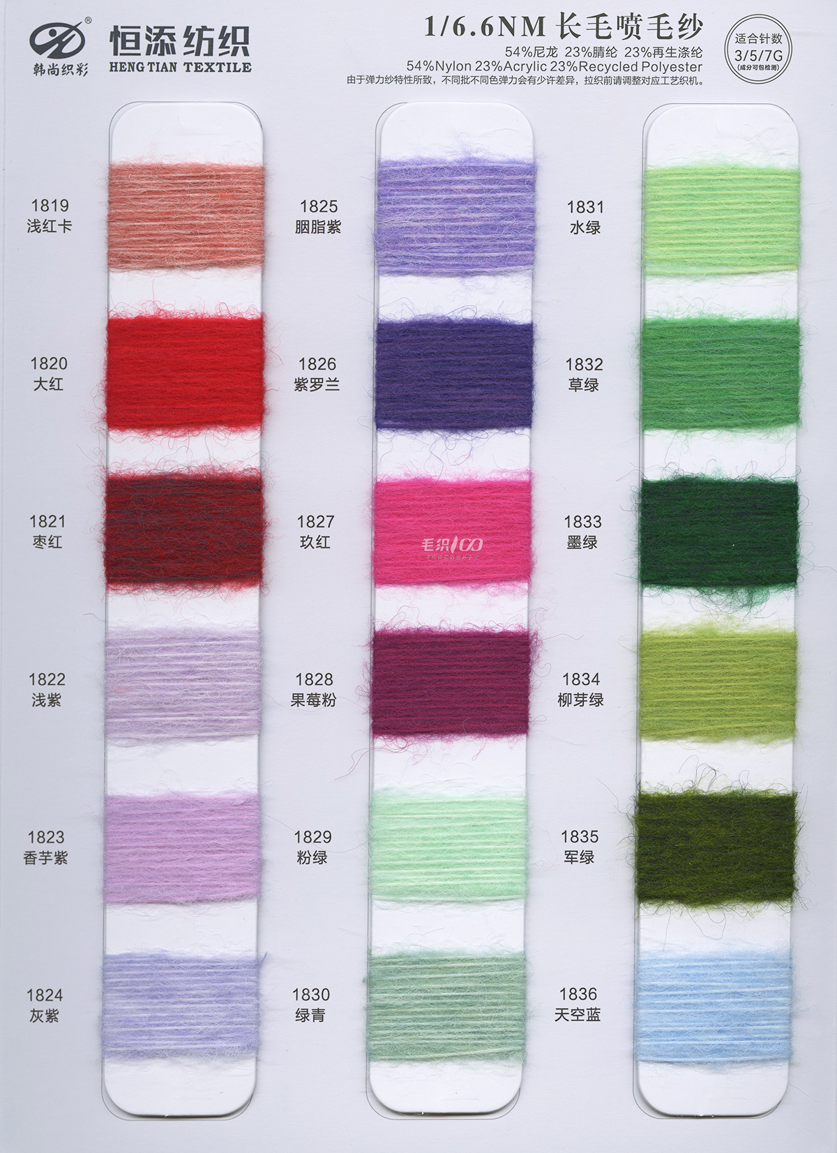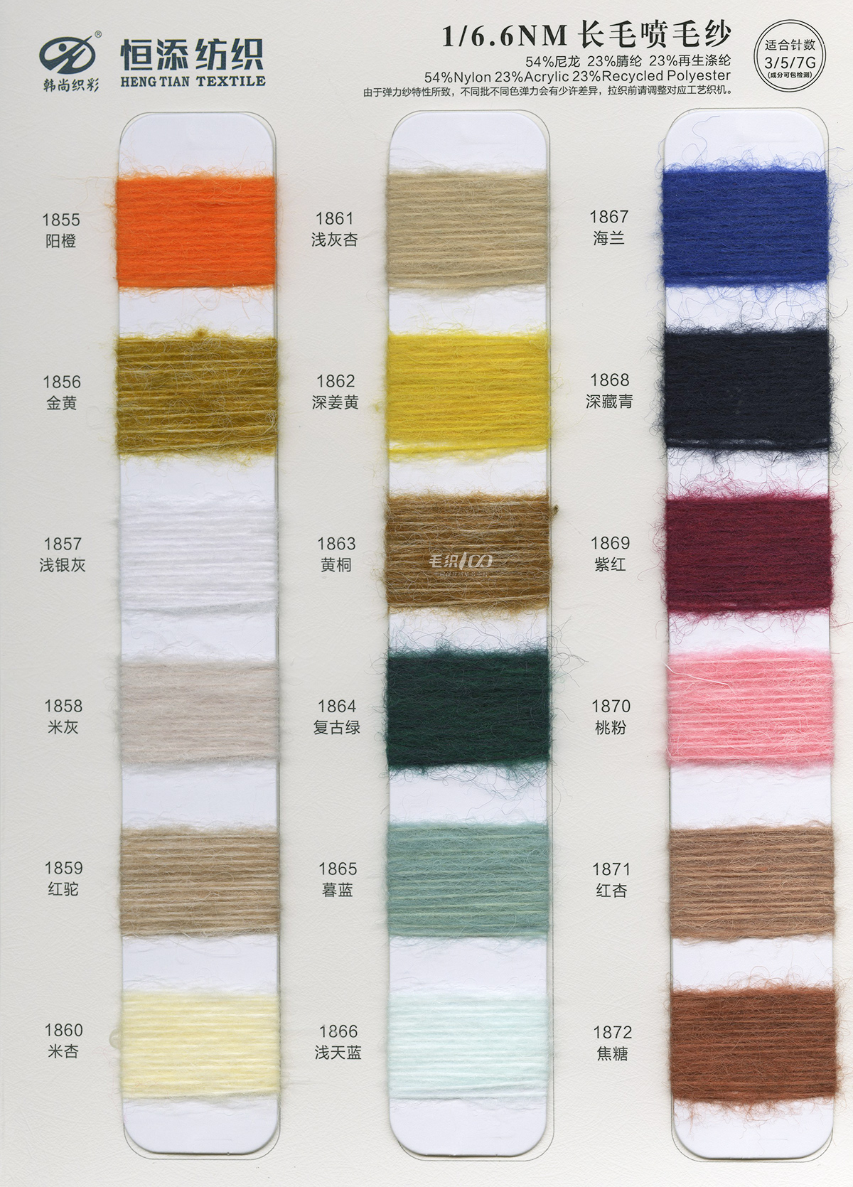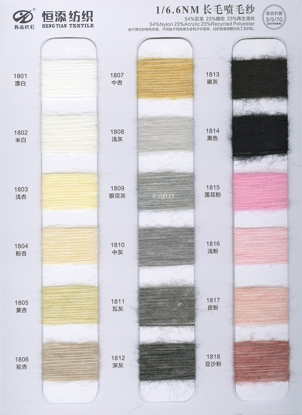 1/9NM 柔霧(雙芯退捻磨毛)1/11NM 羊毛北極絨(磨毛紗),1/9NM 通天紅(磨毛紗),1/3.8NM 征帆(拉毛紗),1/9NM 湛藍(拉毛紗 ),1.5支褪色牛仔,1/8NM 海米-變色圈圈28/2 親澳絨,16S/2星川 ,1/6.6NM 長毛噴毛紗,1/6.6NM 星耀·漸變噴毛紗 ,1/15NM 東方紅(磨毛紗),15支彈力磨毛紗,1/5.5NM 獨尊 · 頂級羊駝,1/13NM 尊者 · 極品羊駝,1/8NM 至尊·超級羊駝,1/2.6NM 夢羽