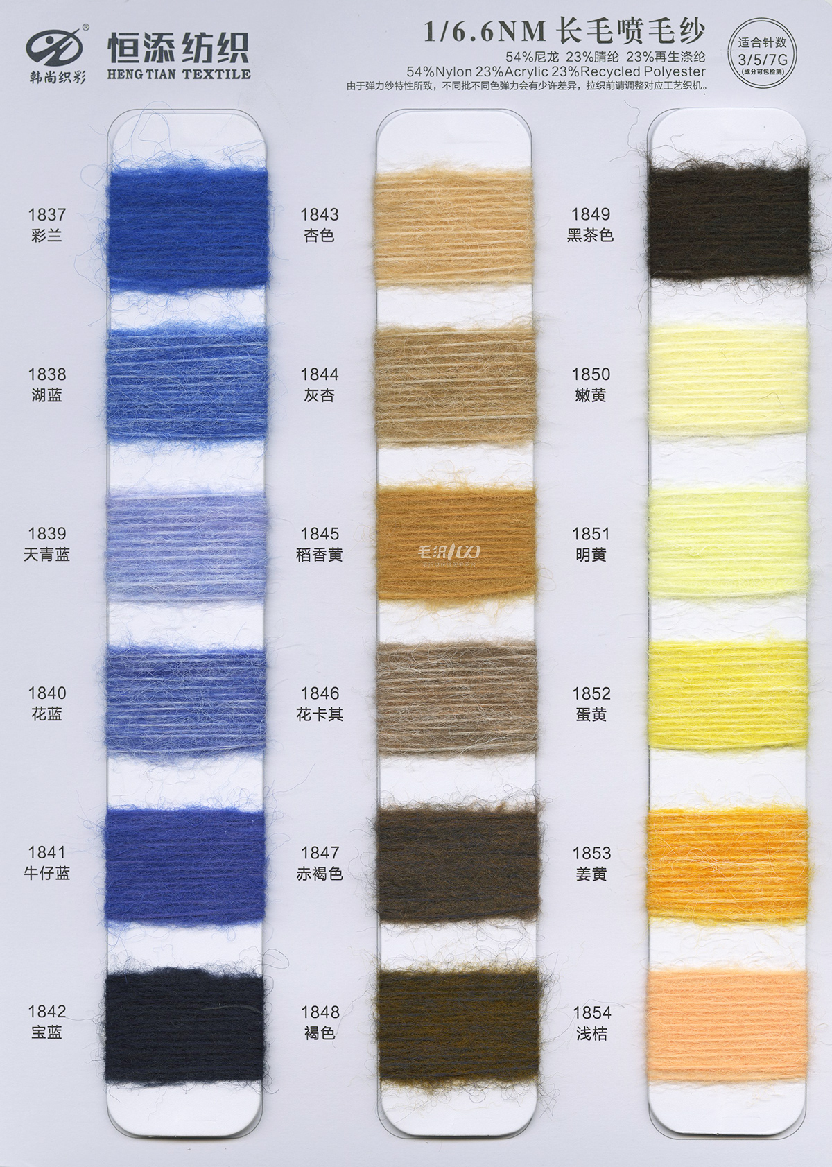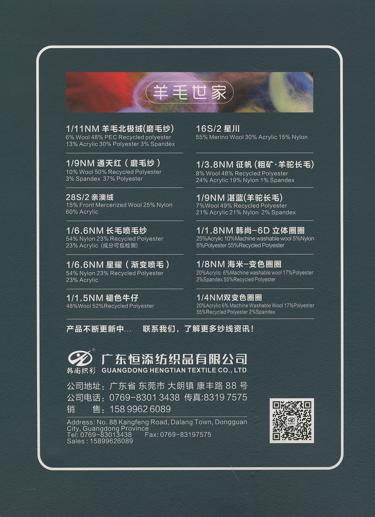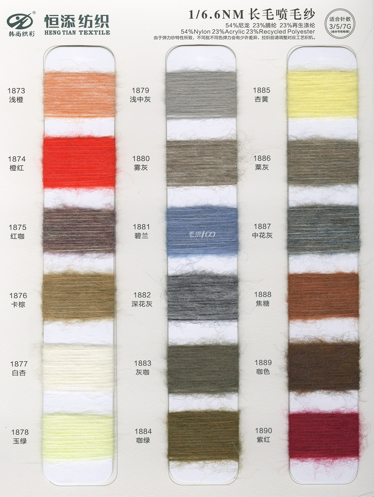 1/9NM 柔霧(雙芯退捻磨毛)1/11NM 羊毛北極絨(磨毛紗),1/9NM 通天紅(磨毛紗),1/3.8NM 征帆(拉毛紗),1/9NM 湛藍(拉毛紗 ),1.5支褪色牛仔,1/8NM 海米-變色圈圈28/2 親澳絨,16S/2星川 ,1/6.6NM 長毛噴毛紗,1/6.6NM 星耀·漸變噴毛紗 ,1/15NM 東方紅(磨毛紗),15支彈力磨毛紗,1/5.5NM 獨尊 · 頂級羊駝,1/13NM 尊者 · 極品羊駝,1/8NM 至尊·超級羊駝,1/2.6NM 夢羽