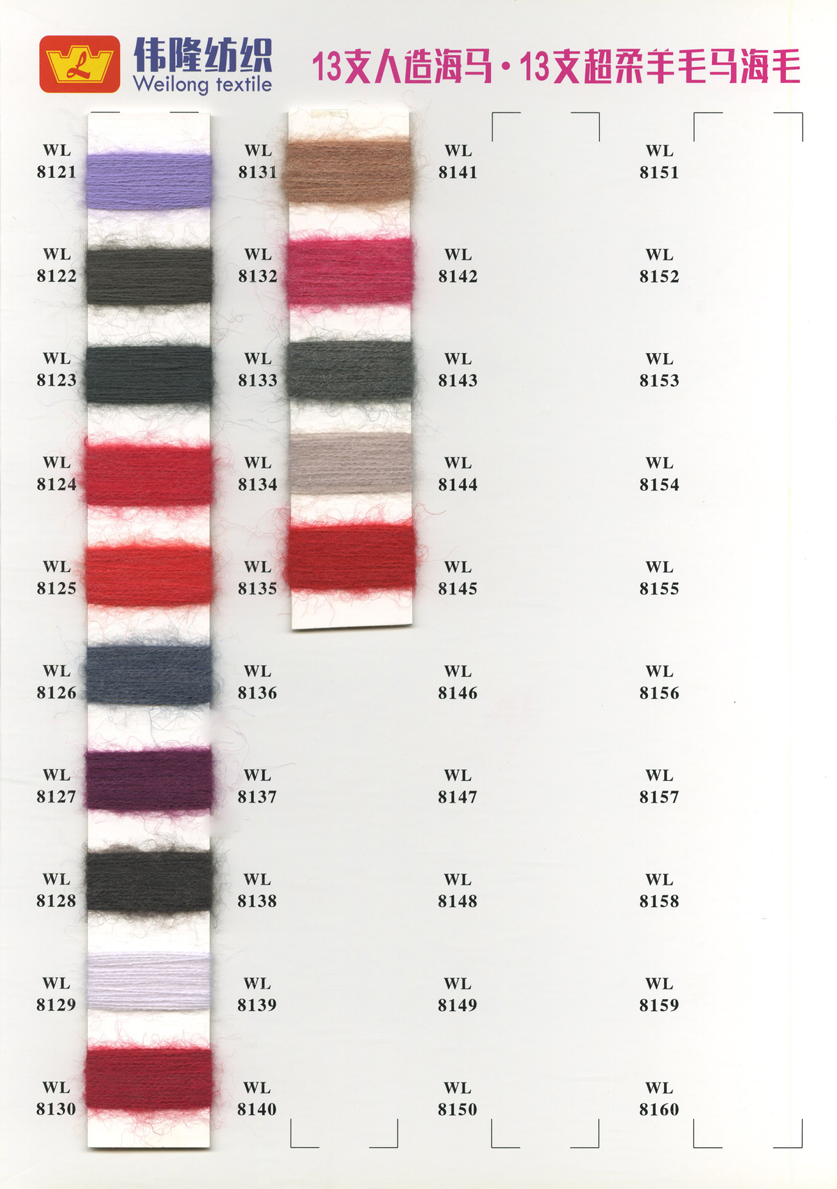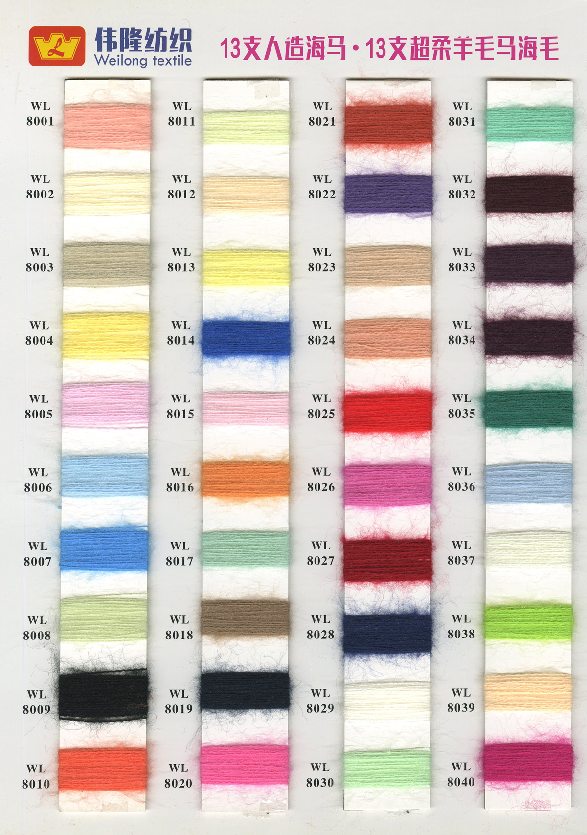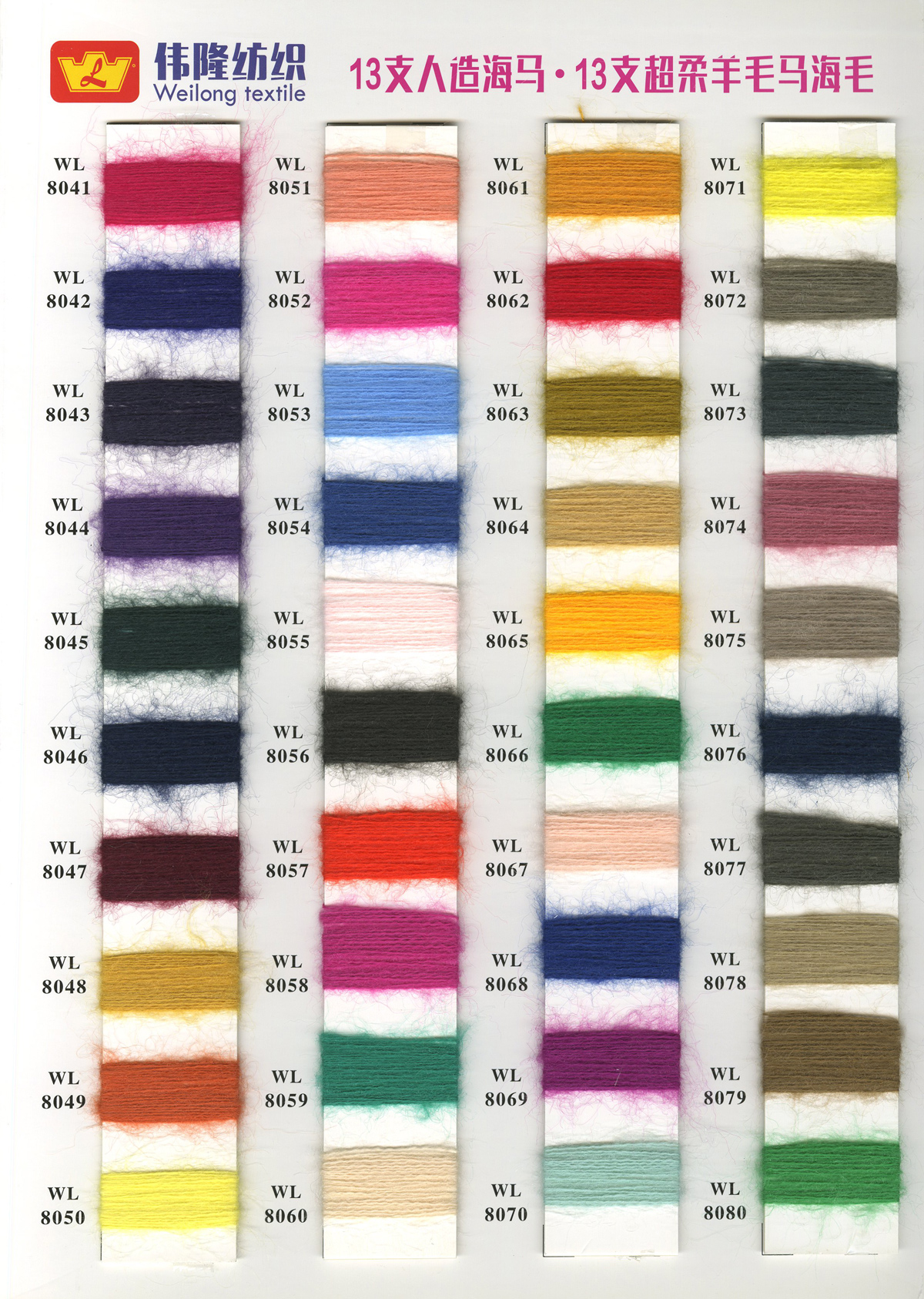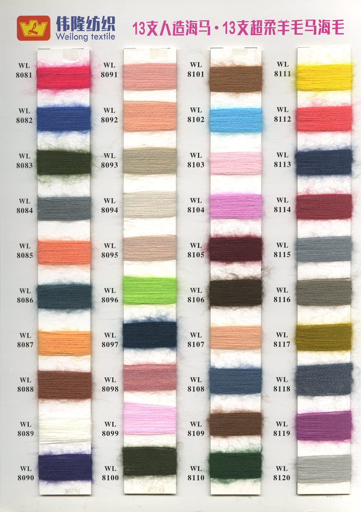 1/15NM冰曲(曲珠)、16S/2仿西班牙紗、28S/2精仿人造毛(腈綸)、18S/2抗起球北極絨、15支長毛馬海、28S/2抗起球安迪絨件染紗胚
