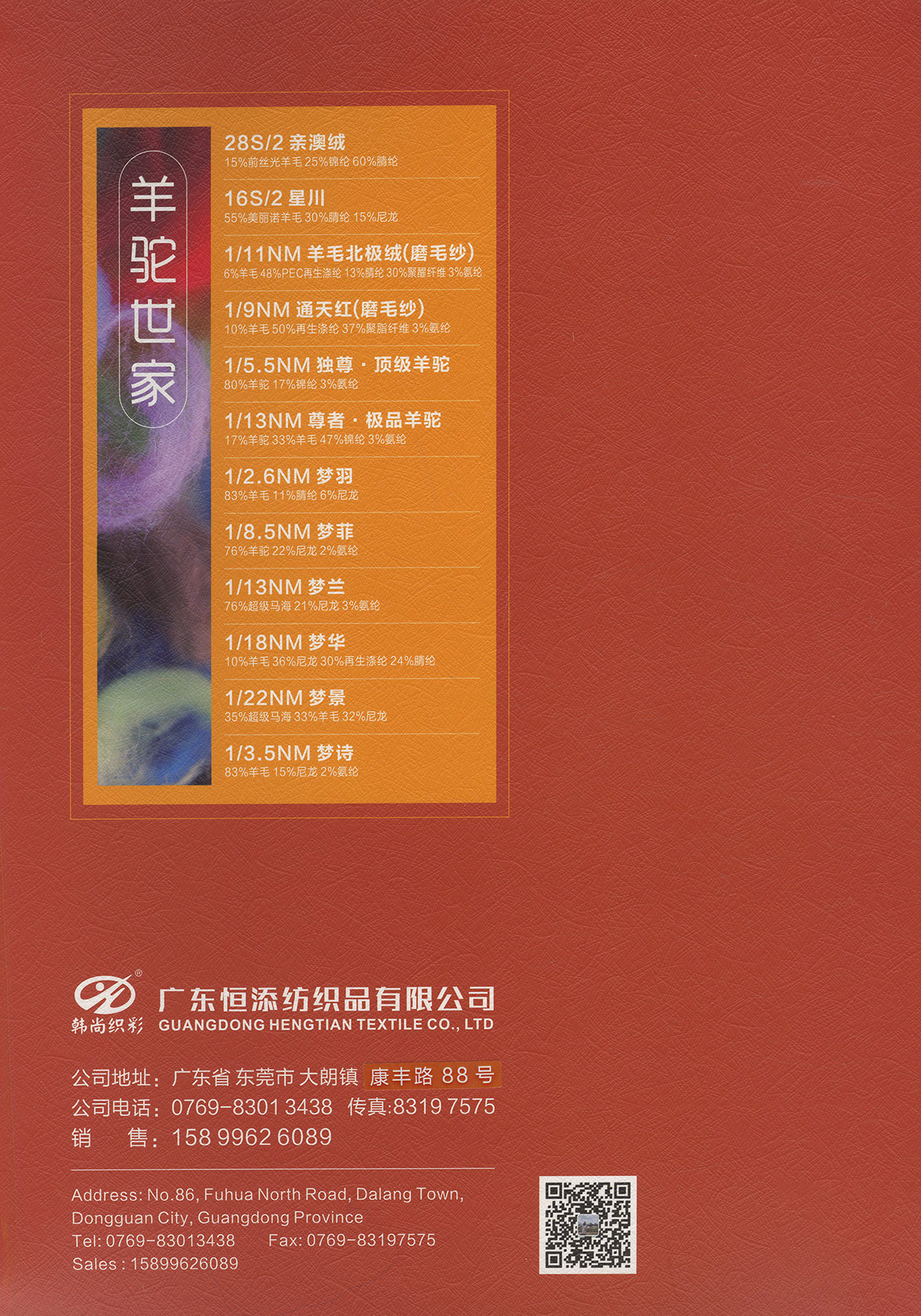 1/9NM 柔霧(雙芯退捻磨毛)1/11NM 羊毛北極絨(磨毛紗),1/9NM 通天紅(磨毛紗),1/3.8NM 征帆(拉毛紗),1/9NM 湛藍(拉毛紗 ),1.5支褪色牛仔,1/8NM 海米-變色圈圈28/2 親澳絨,16S/2星川 ,1/6.6NM 長毛噴毛紗,1/6.6NM 星耀·漸變噴毛紗 ,1/15NM 東方紅(磨毛紗),15支彈力磨毛紗,1/5.5NM 獨尊 · 頂級羊駝,1/13NM 尊者 · 極品羊駝,1/8NM 至尊·超級羊駝,1/2.6NM 夢羽