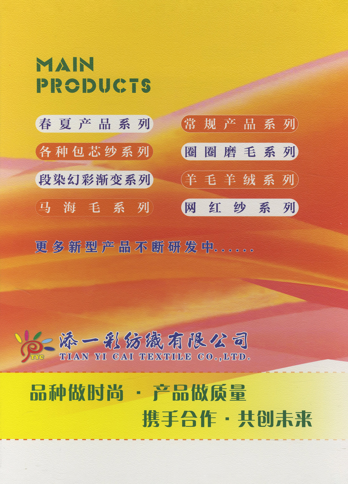 冰絲、天絲麻、亮麗歐根紗、金銀夏曲、有色閃光絲、竹節麻、有色絲光棉、膨體棉晴、有色粘棉、有色雙曲、麻曲、彩點棉、抗起球冰爽絲、紡麻包覆紗、高捻仿亞麻 冰絲