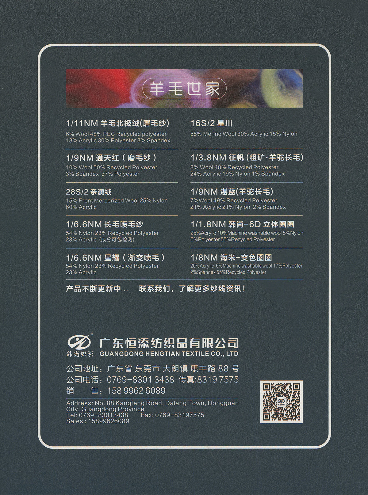 1/9NM 柔霧(雙芯退捻磨毛)1/11NM 羊毛北極絨(磨毛紗),1/9NM 通天紅(磨毛紗),1/3.8NM 征帆(拉毛紗),1/9NM 湛藍(拉毛紗 ),1.5支褪色牛仔,1/8NM 海米-變色圈圈28/2 親澳絨,16S/2星川 ,1/6.6NM 長毛噴毛紗,1/6.6NM 星耀·漸變噴毛紗 ,1/15NM 東方紅(磨毛紗),15支彈力磨毛紗,1/5.5NM 獨尊 · 頂級羊駝,1/13NM 尊者 · 極品羊駝,1/8NM 至尊·超級羊駝,1/2.6NM 夢羽