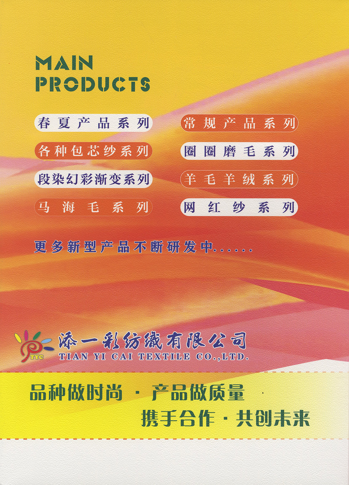 冰絲、天絲麻、亮麗歐根紗、金銀夏曲、有色閃光絲、竹節(jié)麻、有色絲光棉、膨體棉晴、有色粘棉、有色雙曲、麻曲、彩點棉、抗起球冰爽絲、紡麻包覆紗、高捻仿亞麻 冰絲