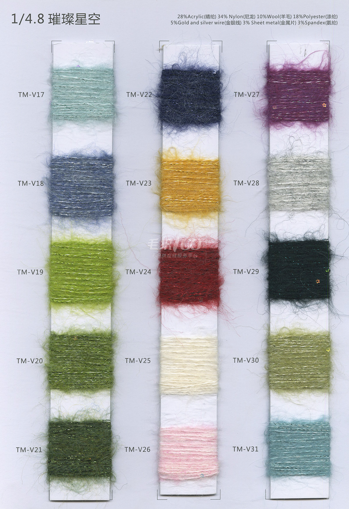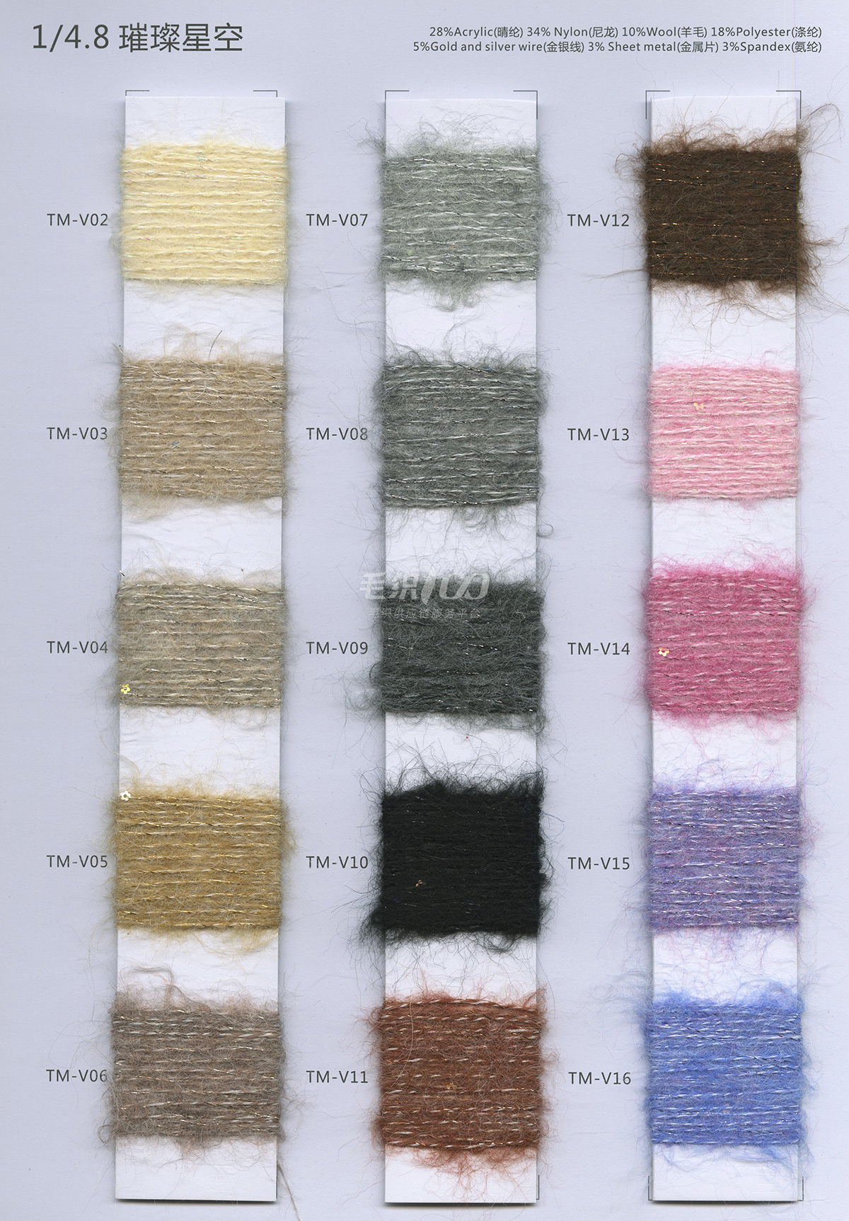 1/2.8NM花式噴毛紗、1/6NM蘇麗噴毛紗、1/5.5NM羊駝噴毛紗、1/6.5NM駱馬絨噴毛紗、1/3NM彩點(diǎn)噴毛紗、1/3.8NM閃光噴毛紗、1/2.8NM多彩噴毛紗、1/5.5NM色紡噴毛紗、1/3.5NM彩虹噴毛紗、1/3NM花式棉噴毛紗、1/13NM楓葉羊駝毛、1/