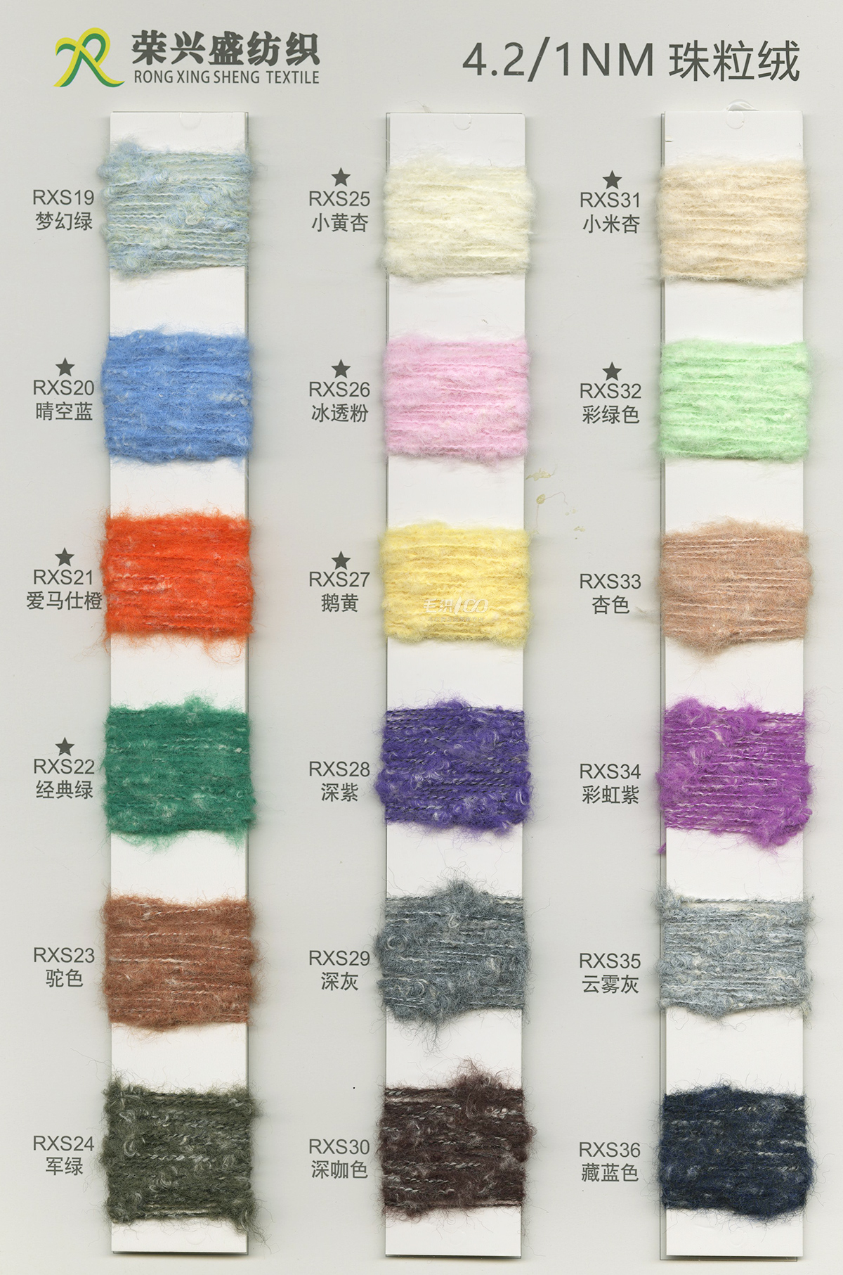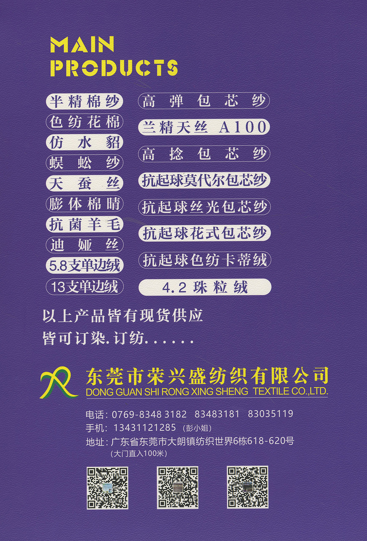 棉紗系列:32S/2有色半精梳棉紗、32S/2色紡花棉、32S/2幻彩棉紗、32S/2彩點棉;16/2膨體棉晴;包芯紗系列:28/2高彈包芯紗、50/2高捻包芯紗、44/2抗起球莫代爾包芯紗、50/2抗起球絲光包芯紗、30/2抗起球花式包芯紗;