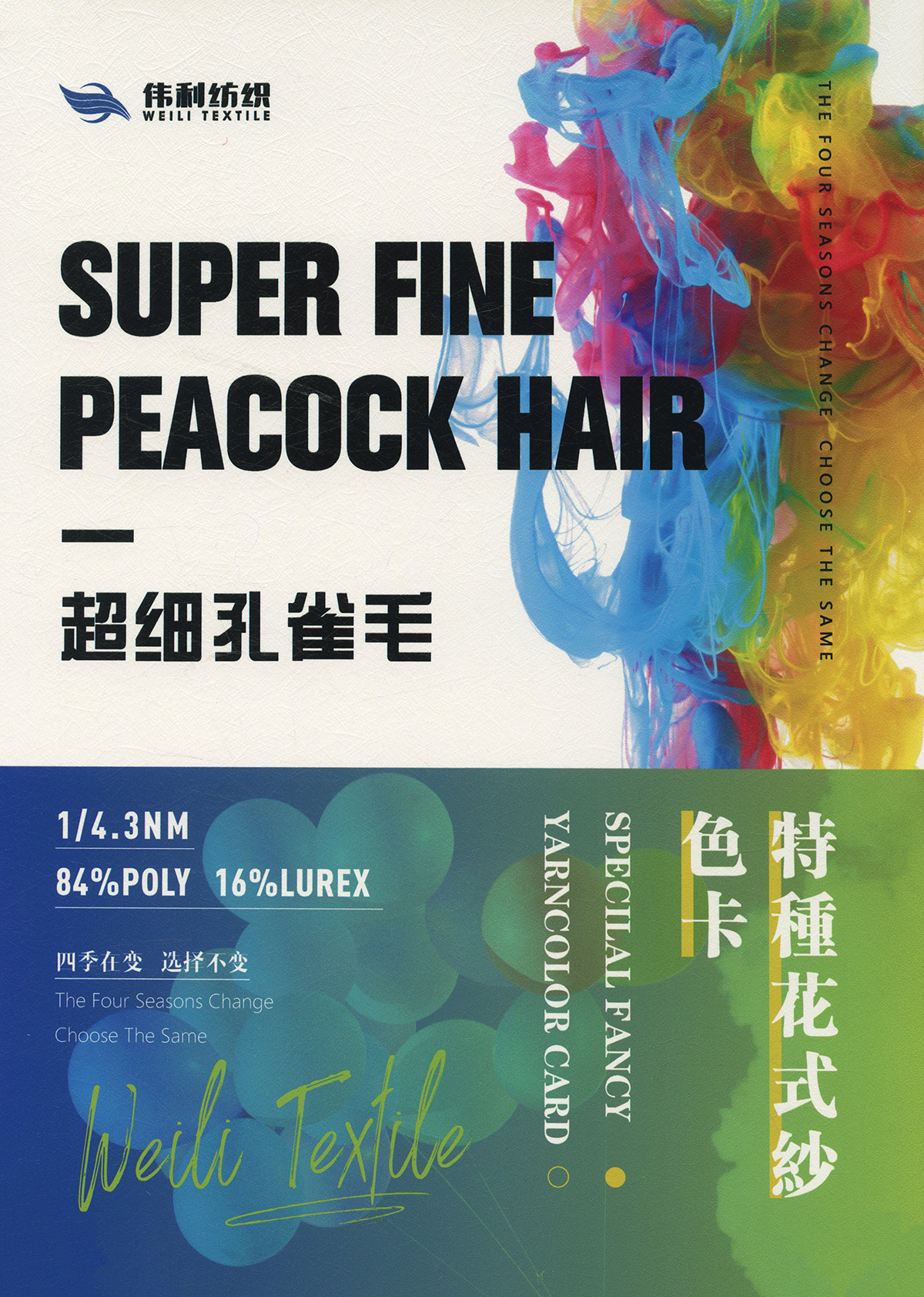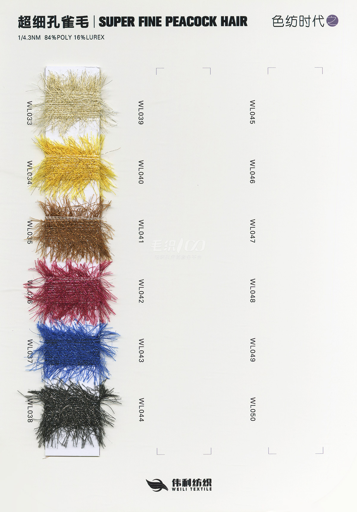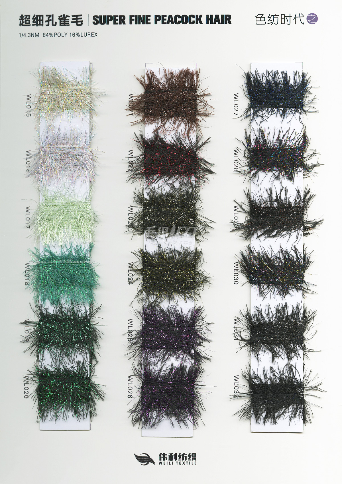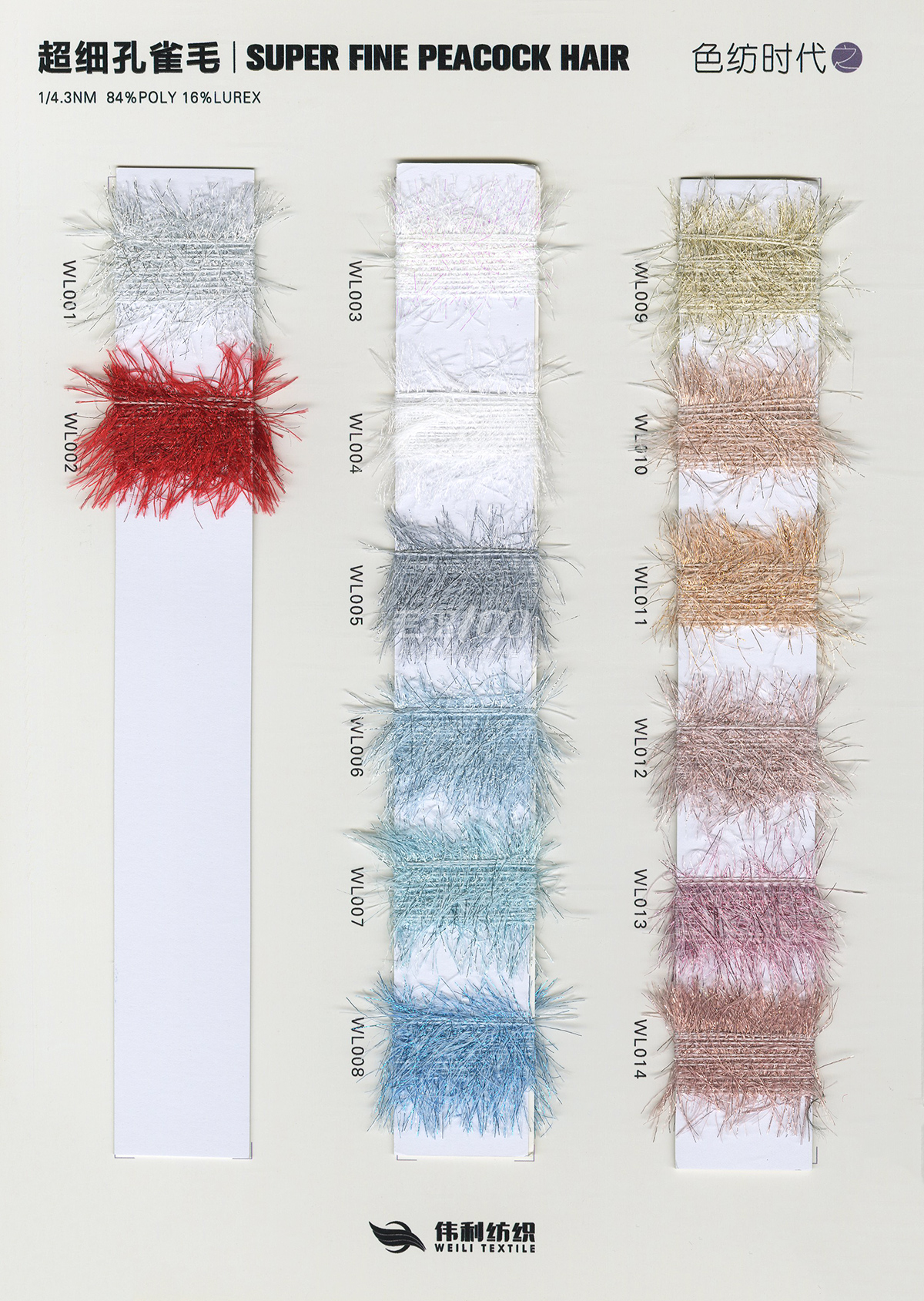 特種花式紗系列:螞蟻絨、棉花絨、珊瑚絨、花駝絨、磨毛考拉絨、彩虹噴毛紗、羊絨珠片紗、再生莫代爾珠片紗、漸變彩虹噴毛系列、金銀蜈蚣紗、金銀玻璃紗、金銀雙包紗、金銀空心帶、香腸紗、蜻蜓紗、蝴蝶紗、高速帶、馬海毛、空心帶、米粉紗、小肚棉、彩點紗、經緯紗、水結珠、梯仔紗、菊花紗、燈籠紗、羊駝毛、圈圈紗、等花式特種紗。