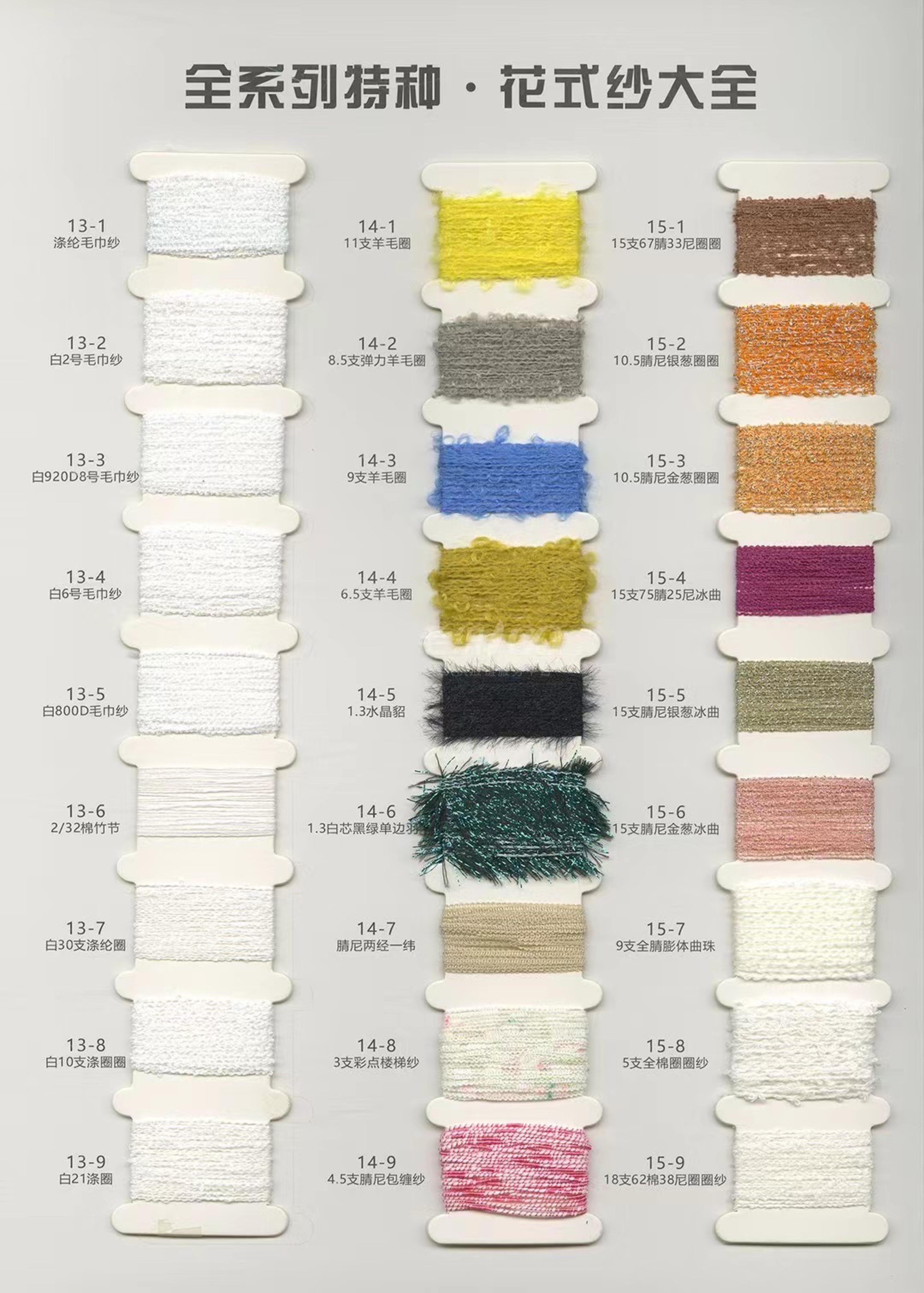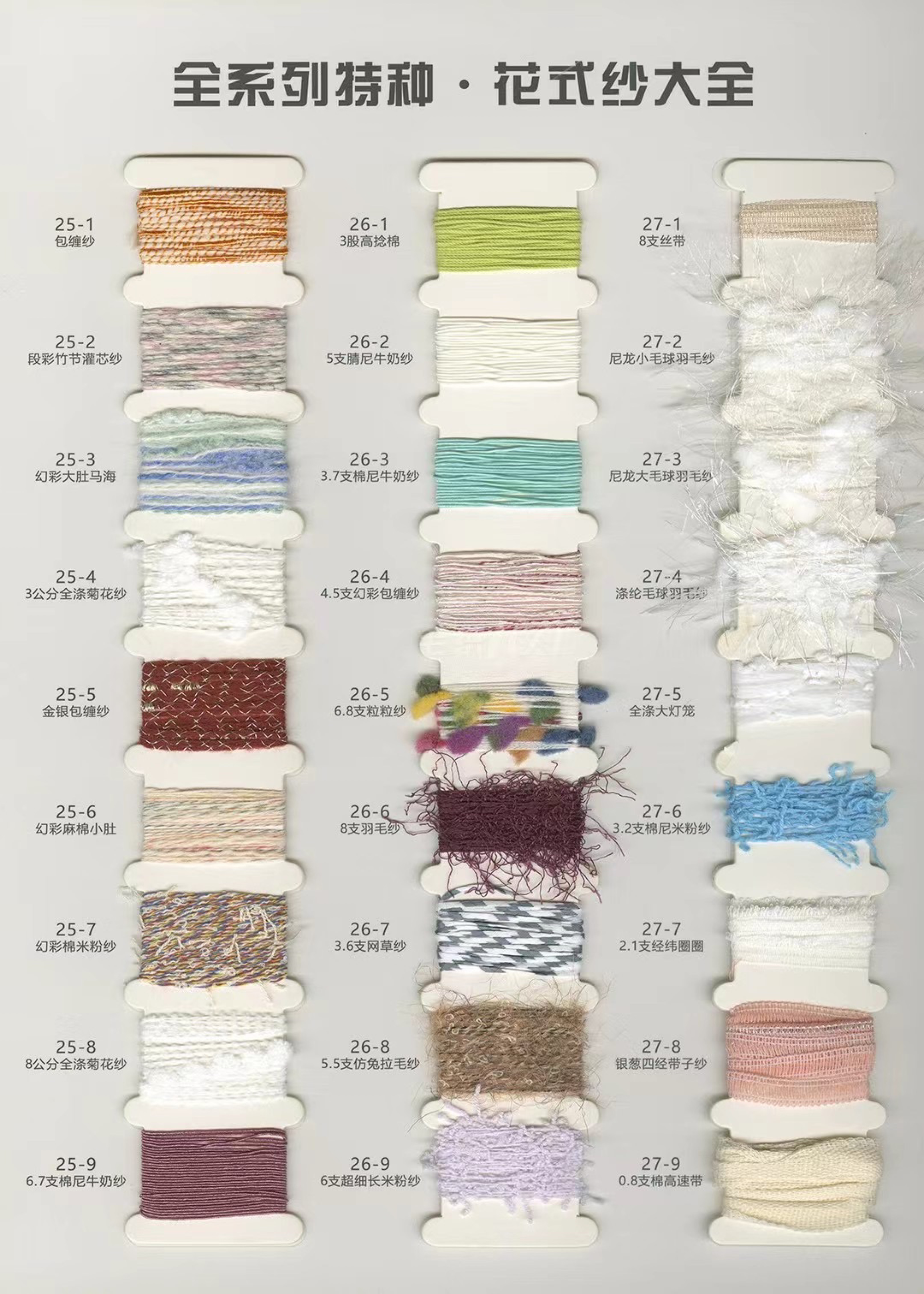 帶子紗,珠片紗,花式紗,特種紗,羊毛混紡,羊駝毛,馬海毛,浣熊絨,牦牛絨,段染系列。