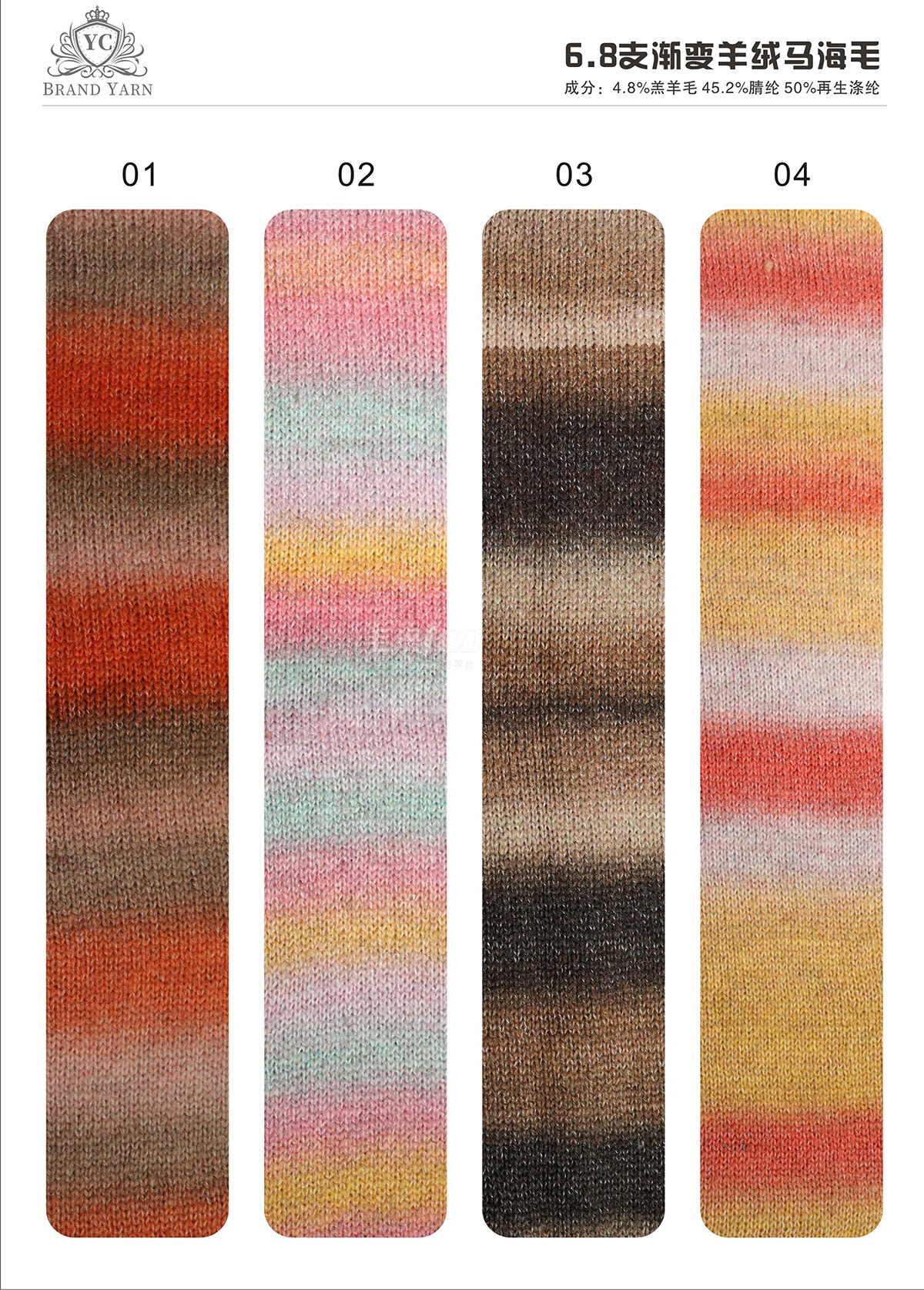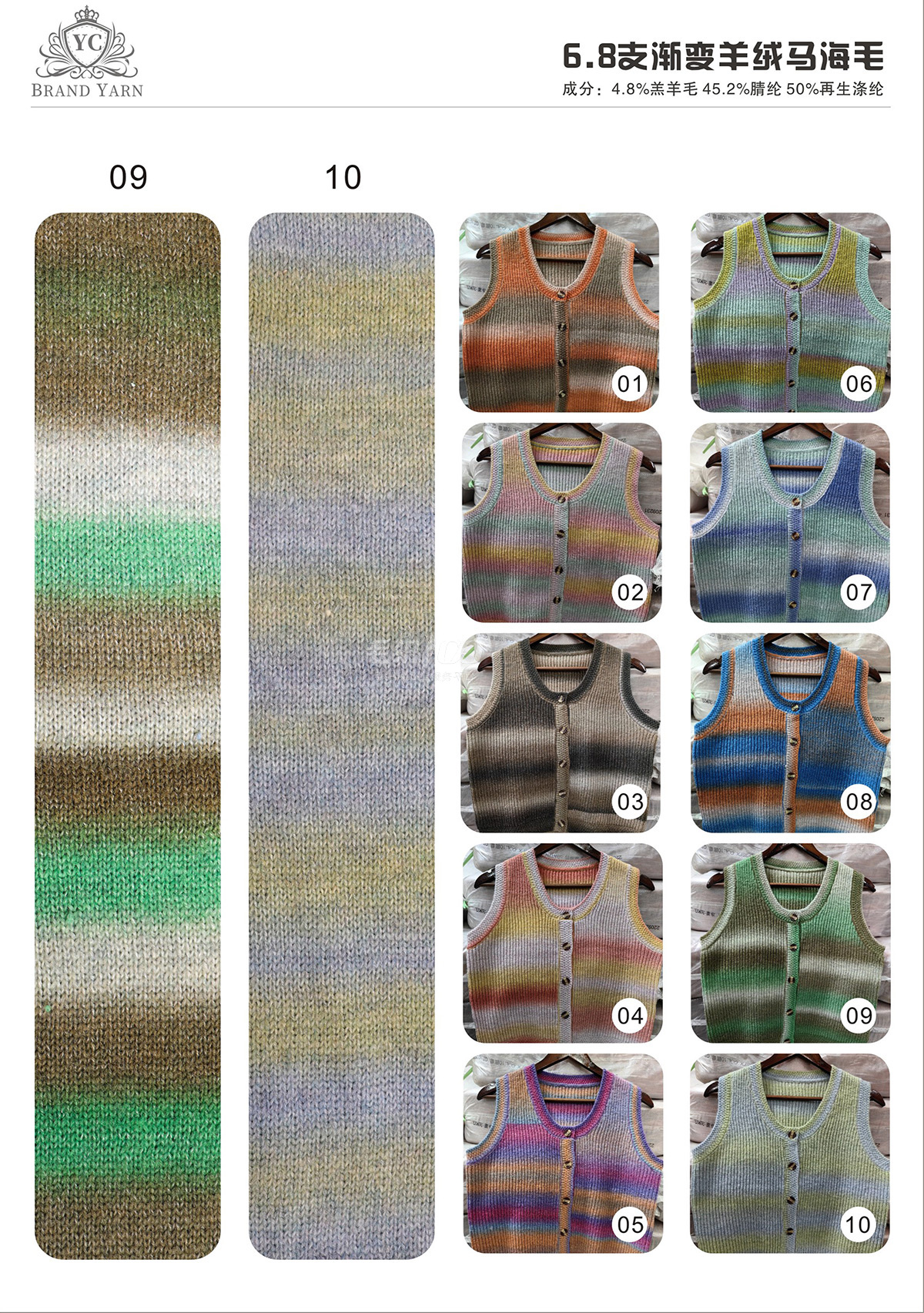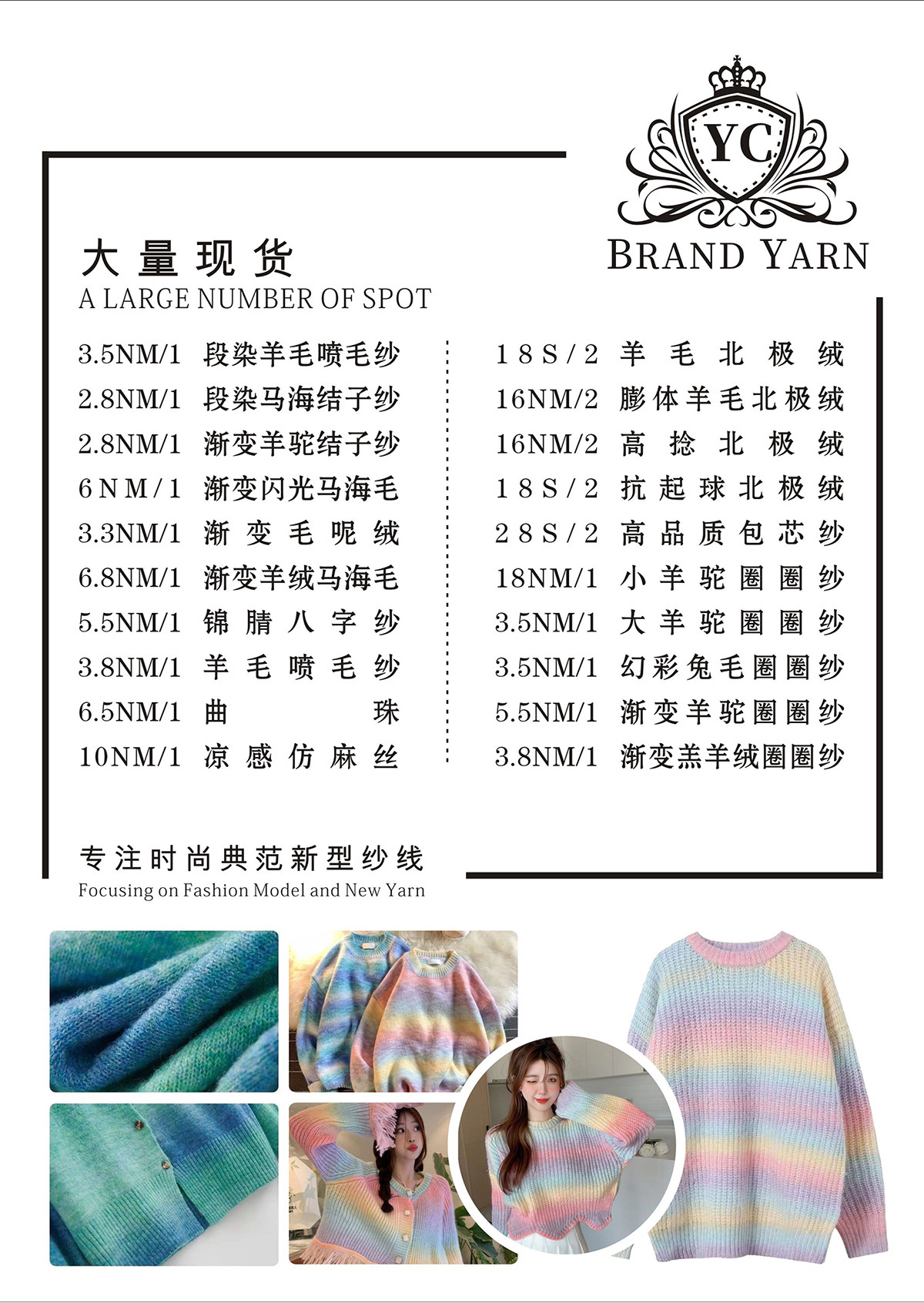 段染羊毛噴毛紗,漸變羊駝結(jié)子紗,漸變閃光馬海毛,漸變毛呢絨,小羊駝圈圈紗,大羊駝圈圈紗,幻彩兔毛圈圈紗,羊毛噴毛紗,曲珠,高比例馬海結(jié)子紗。