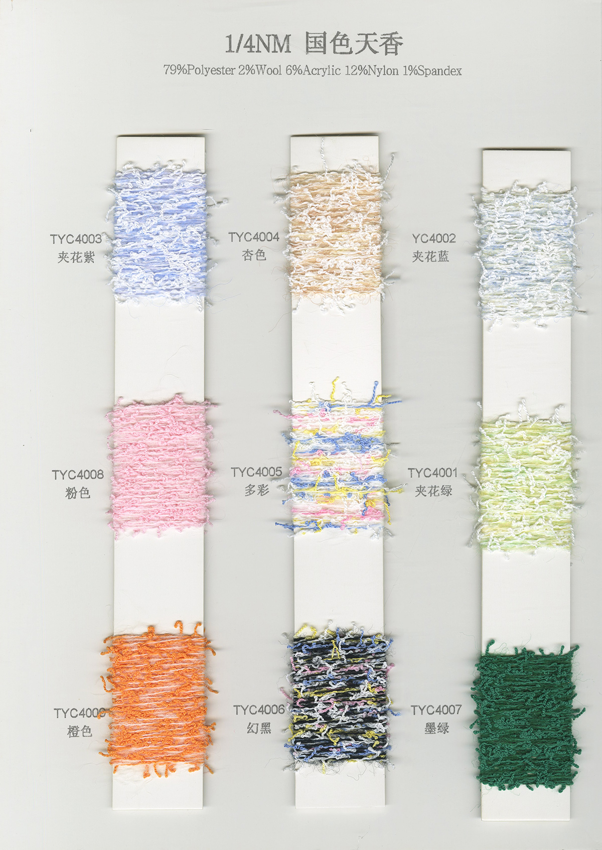 冰絲、天絲麻、亮麗歐根紗、金銀夏曲、有色閃光絲、竹節麻、有色絲光棉、膨體棉晴、有色粘棉、有色雙曲、麻曲、彩點棉、抗起球冰爽絲、紡麻包覆紗、高捻仿亞麻 冰絲