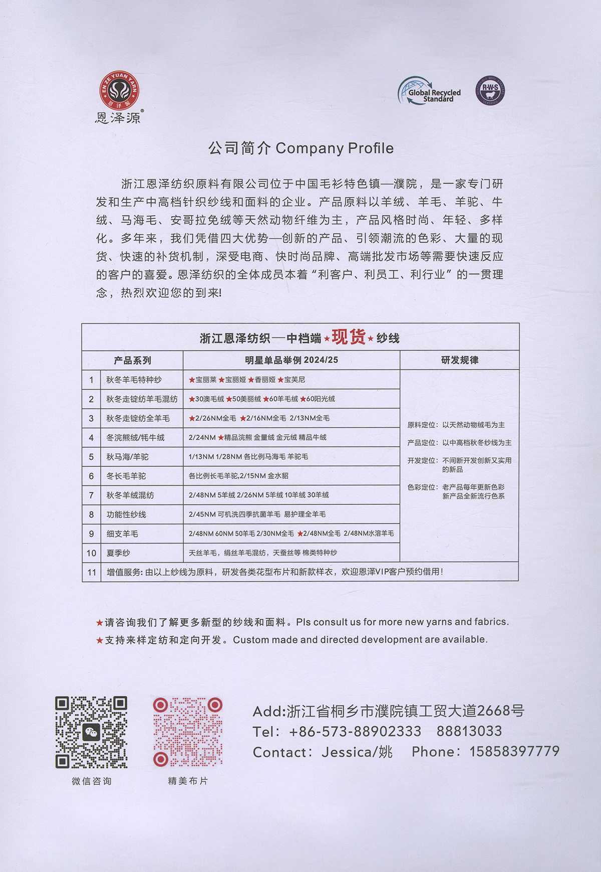 1、26支100%全羊毛,2/16支100%全羊毛 16支點子紗 2、2/26支 粗紡50羊毛 30羊毛 3、2/24支 2/16支 精品浣熊絨 4、26支 10羊絨,30羊絨 5、各種比例馬海毛,羊駝毛 6、3/70支 10%羊毛90%天絲,絹絲羊毛