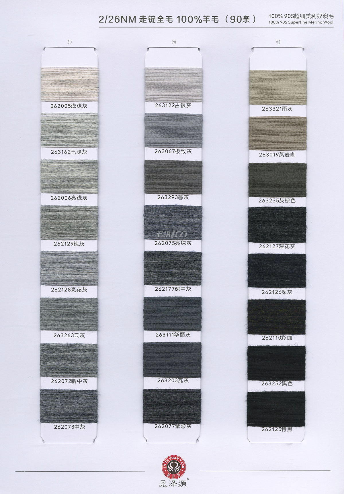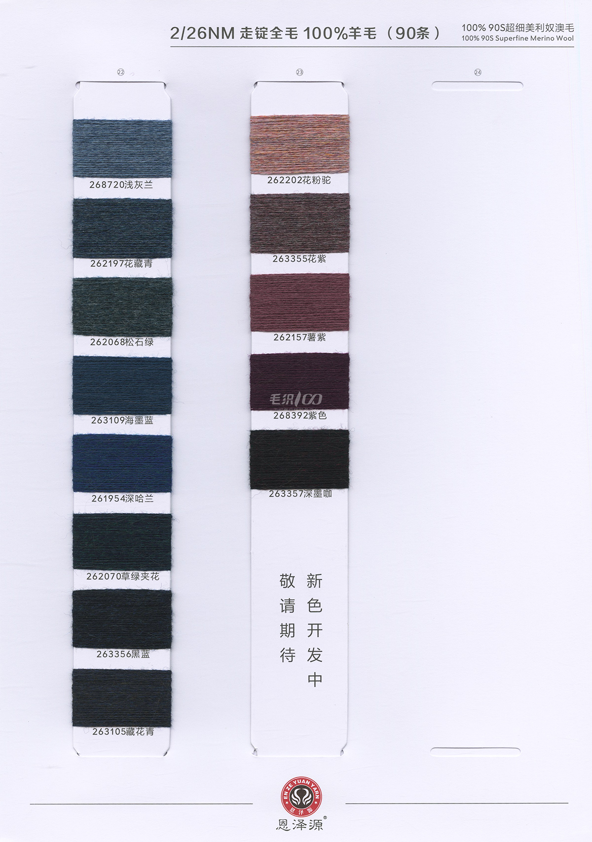 1、26支100%全羊毛,2/16支100%全羊毛 16支點子紗 2、2/26支 粗紡50羊毛 30羊毛 3、2/24支 2/16支 精品浣熊絨 4、26支 10羊絨,30羊絨 5、各種比例馬海毛,羊駝毛 6、3/70支 10%羊毛90%天絲,絹絲羊毛
