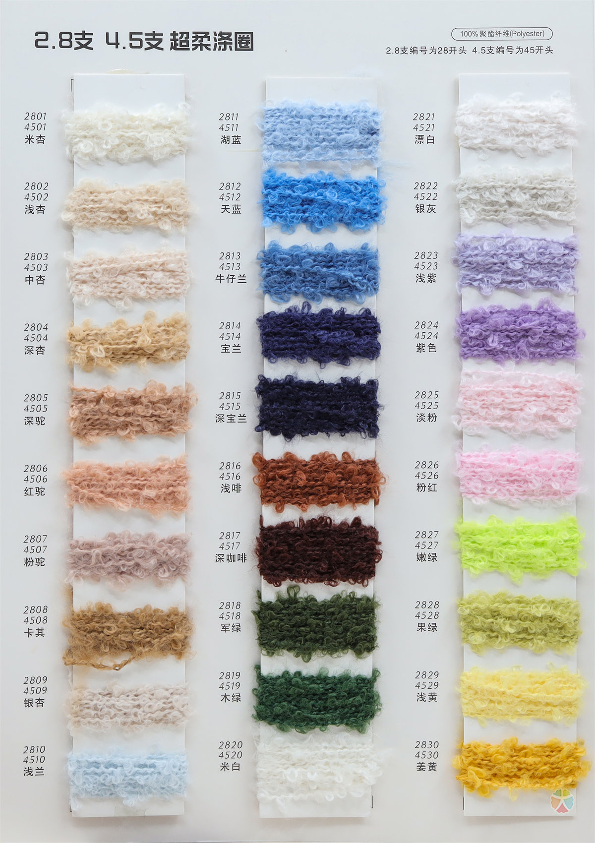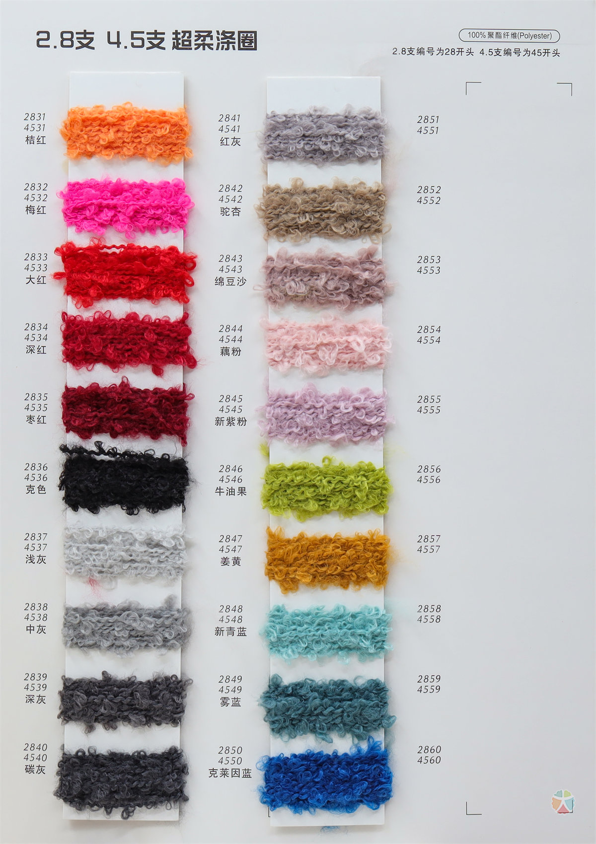 70D/100D/140D仿錦綸、有色高彈絲、2CM仿熊毛、2/32NM抗起球小羊絨、0.9仿駝絨、1/13.5NM棉拉毛紗、1/5.4NM五彩噴毛紗