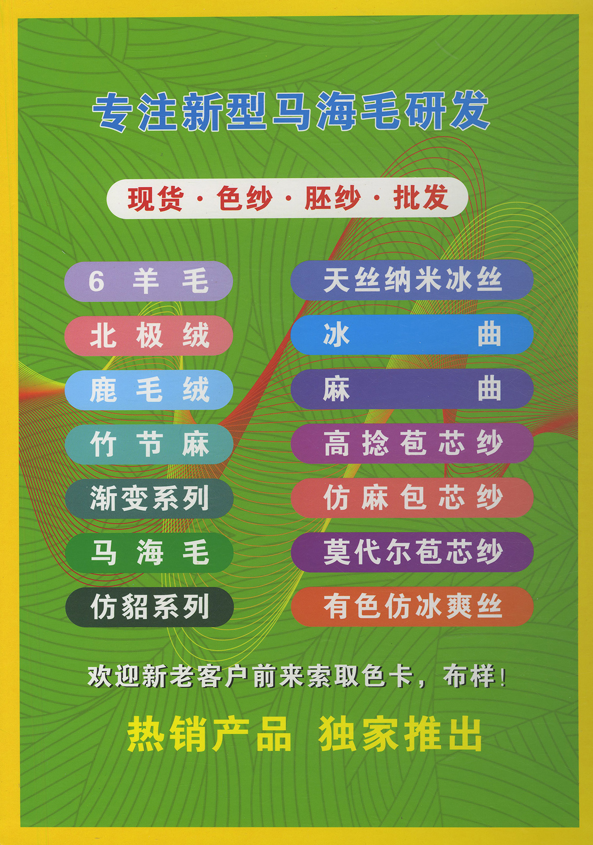 免洗水冰曲(TT紗) ,抗起球仿麻曲 ,仿麻包心紗,28支立體包芯紗,TT羊駝圈圈,4.5公分仿貂毛, 5公分花貂,5公分銀絲仿貂,1.3公分銀絲仿貂,1.3公分段染仿貂,棉形珠片紗, 絲光麻棉.