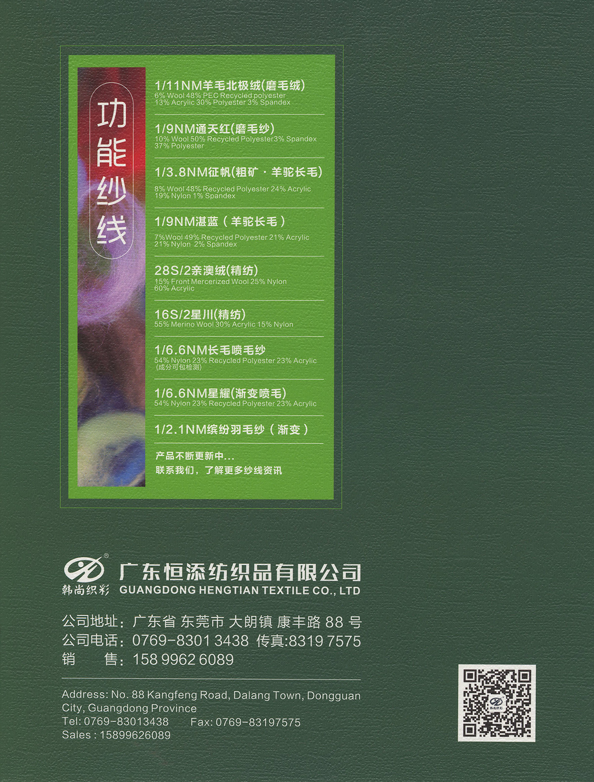1/9NM 柔霧(雙芯退捻磨毛)1/11NM 羊毛北極絨(磨毛紗),1/9NM 通天紅(磨毛紗),1/3.8NM 征帆(拉毛紗),1/9NM 湛藍(拉毛紗 ),1.5支褪色牛仔,1/8NM 海米-變色圈圈28/2 親澳絨,16S/2星川 ,1/6.6NM 長毛噴毛紗,1/6.6NM 星耀·漸變噴毛紗 ,1/15NM 東方紅(磨毛紗),15支彈力磨毛紗,1/5.5NM 獨尊 · 頂級羊駝,1/13NM 尊者 · 極品羊駝,1/8NM 至尊·超級羊駝,1/2.6NM 夢羽