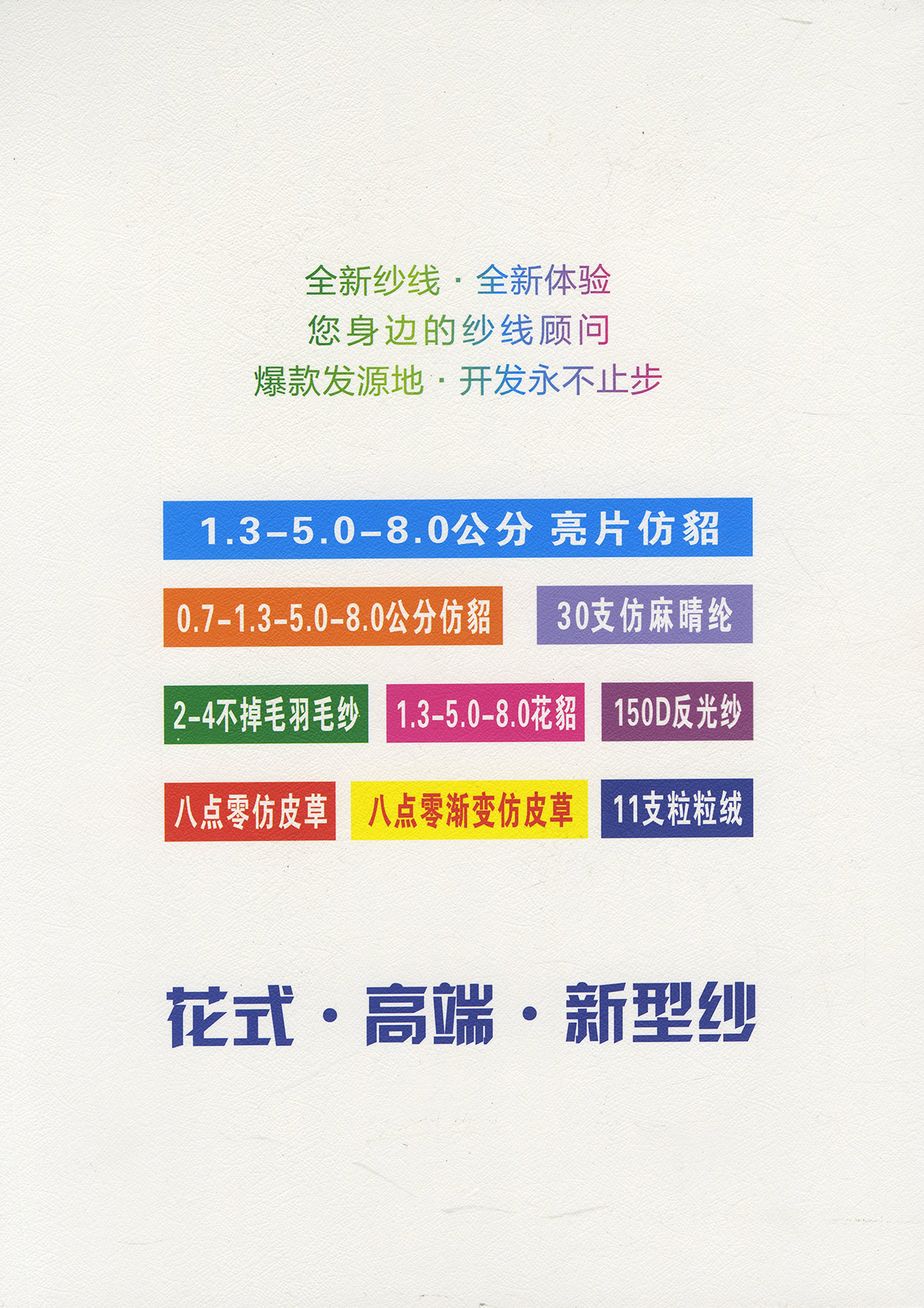 主營:6.8-13支麻爽棉曲 3.5支包纏紗 5支包覆紗 15支棉尼竹節圈圈 11支粒粒絨 6支中橋紗 5.2支燈籠紗 1.3-8公分仿貂 1.3-8公分銀絲亮片仿貂