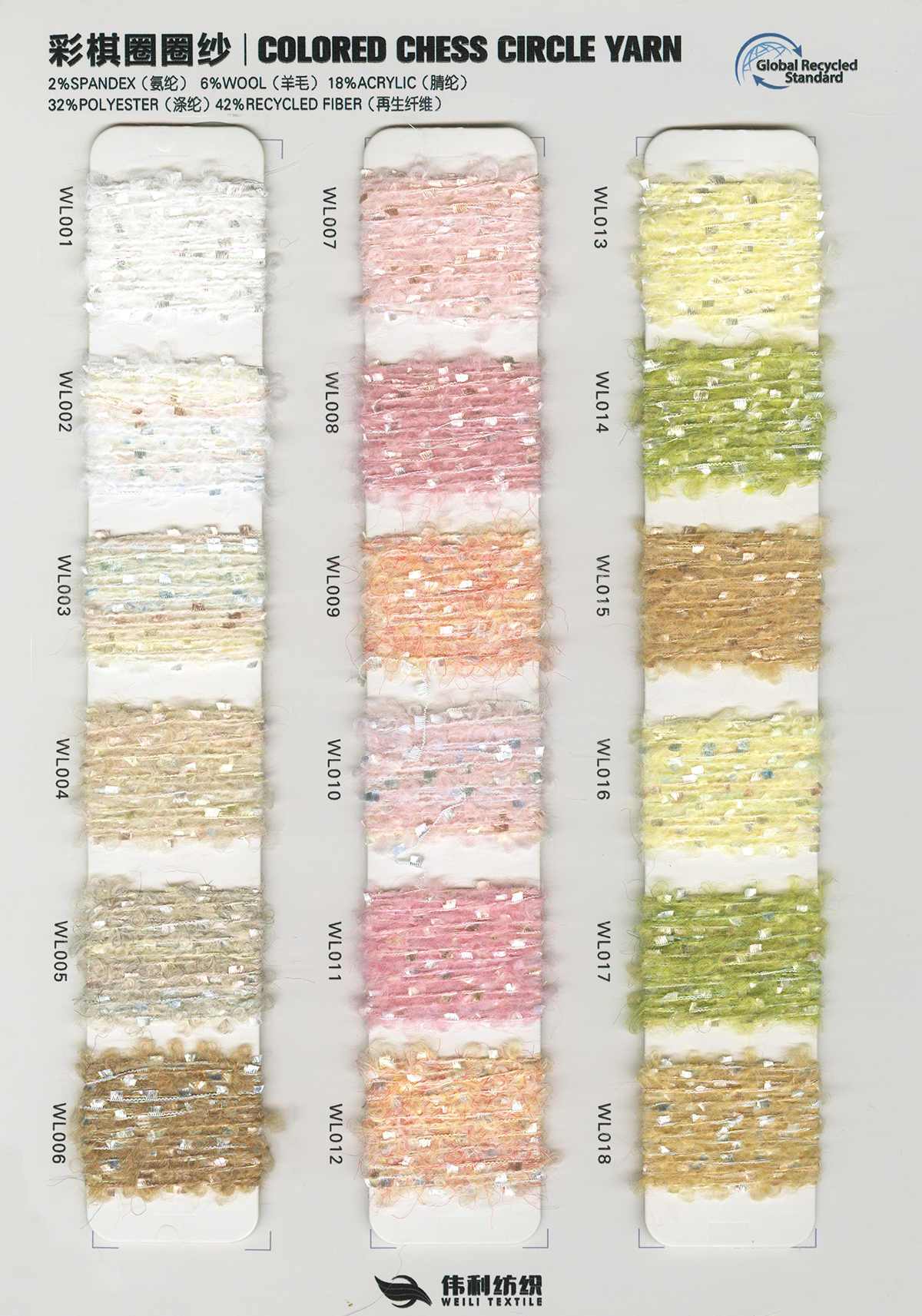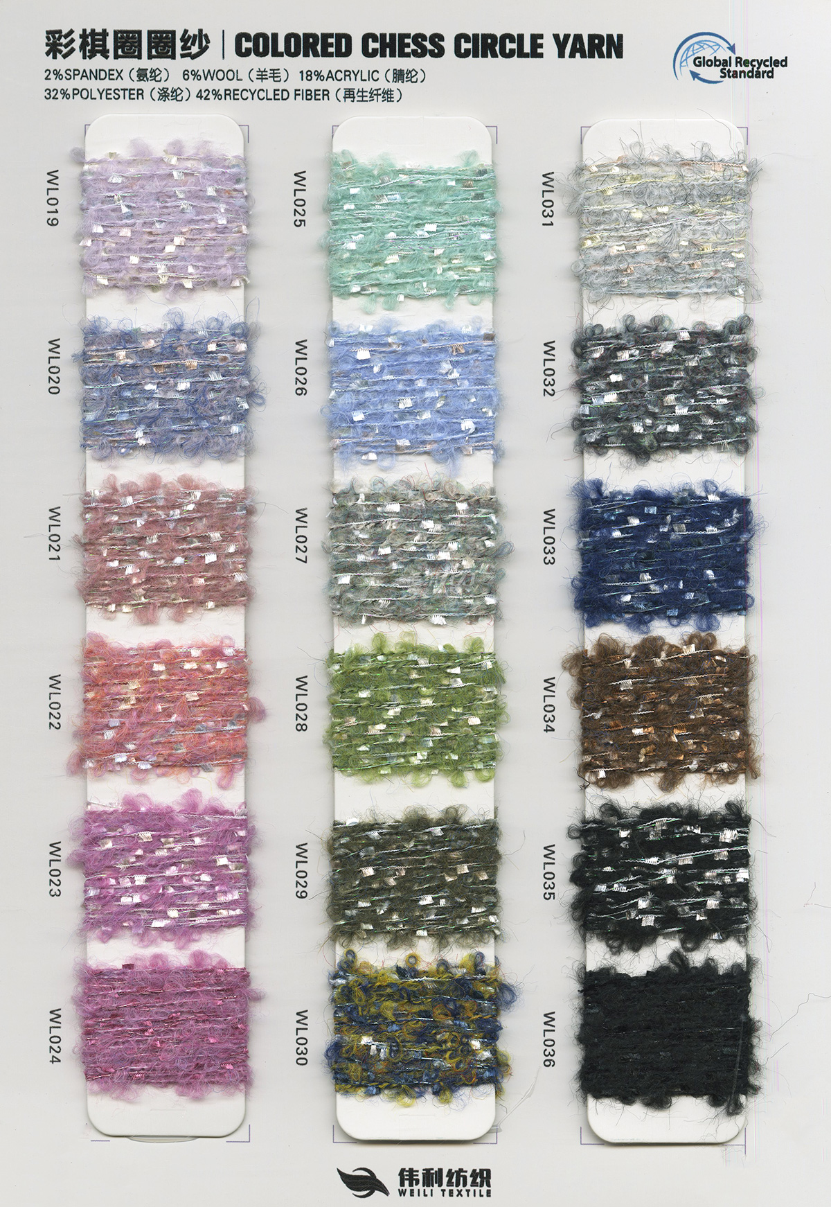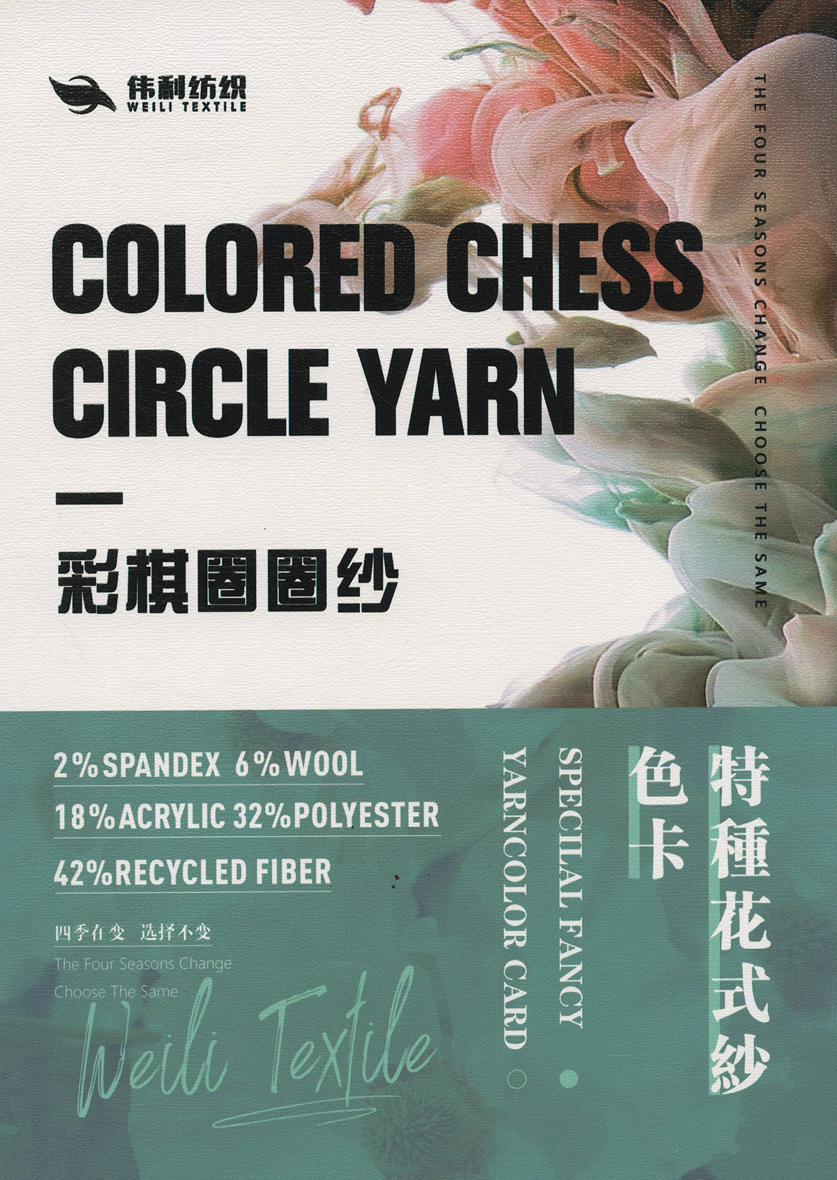 特種花式紗系列:螞蟻絨、棉花絨、珊瑚絨、花駝絨、磨毛考拉絨、彩虹噴毛紗、羊絨珠片紗、再生莫代爾珠片紗、漸變彩虹噴毛系列、金銀蜈蚣紗、金銀玻璃紗、金銀雙包紗、金銀空心帶、香腸紗、蜻蜓紗、蝴蝶紗、高速帶、馬海毛、空心帶、米粉紗、小肚棉、彩點紗、經(jīng)緯紗、水結(jié)珠、梯仔紗、菊花紗、燈籠紗、羊駝毛、圈圈紗、等花式特種紗。