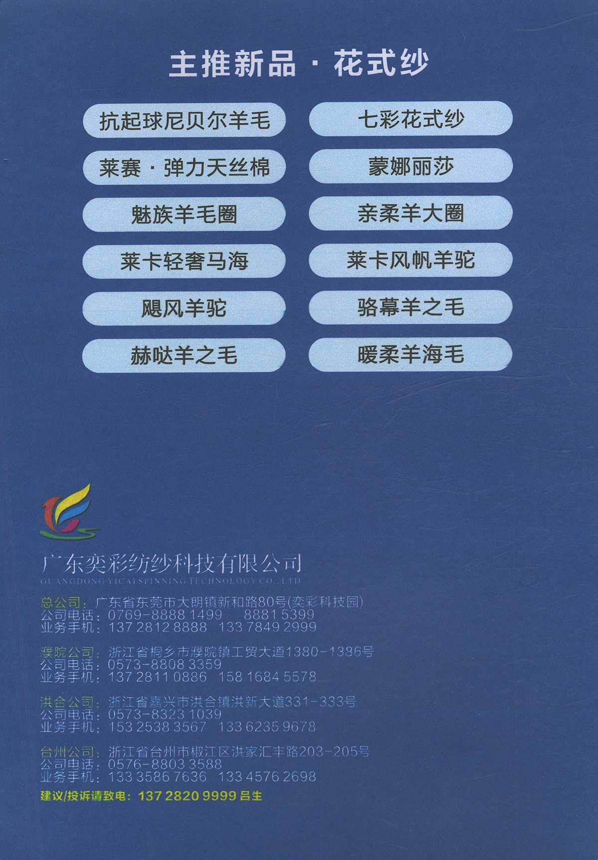 包芯紗系類;馬海毛系類;各類花式紗 兔絨包芯紗、七彩花式包芯紗、兔毛包芯紗、巴素蘭羊毛、長纖仿羊絨、有色精梳棉、膨體真三七、有色雙曲、絲光美麗奴羊毛、高檔半精兔絨、高端山羊絨