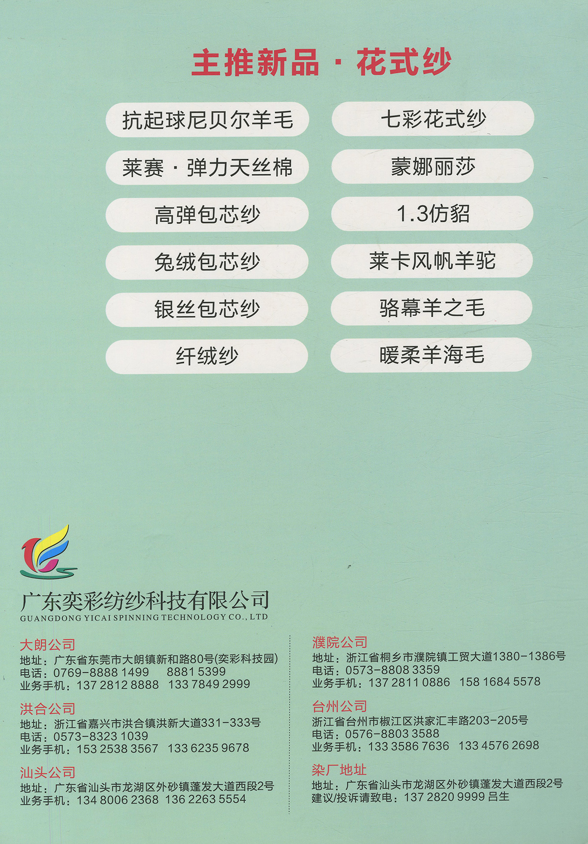 包芯紗系類;馬海毛系類;各類花式紗 兔絨包芯紗、七彩花式包芯紗、兔毛包芯紗、巴素蘭羊毛、長纖仿羊絨、有色精梳棉、膨體真三七、有色雙曲、絲光美麗奴羊毛、高檔半精兔絨、高端山羊絨
