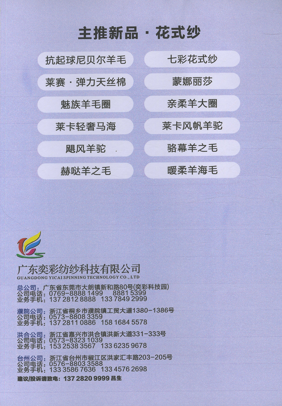 包芯紗系類;馬海毛系類;各類花式紗 兔絨包芯紗、七彩花式包芯紗、兔毛包芯紗、巴素蘭羊毛、長纖仿羊絨、有色精梳棉、膨體真三七、有色雙曲、絲光美麗奴羊毛、高檔半精兔絨、高端山羊絨