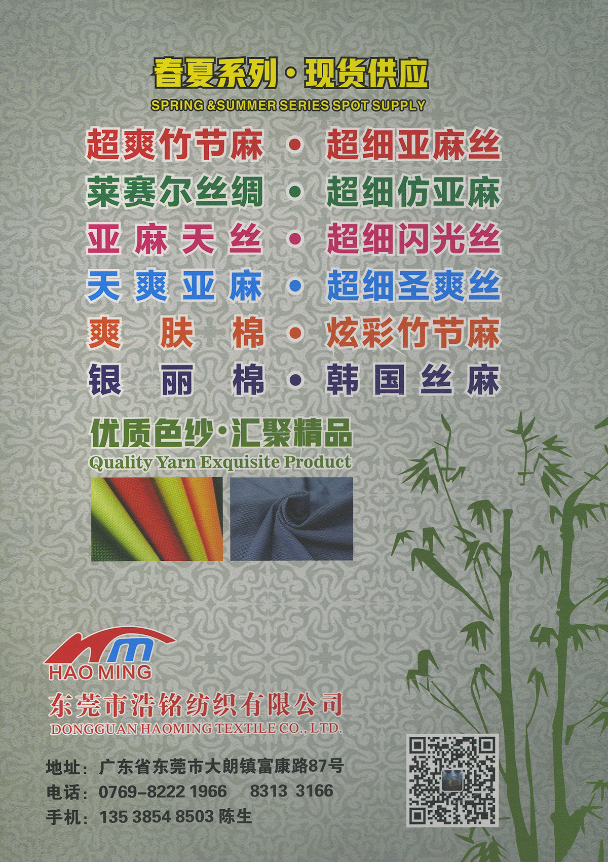 春夏產(chǎn)品系列:超爽竹節(jié)麻、天爽亞麻、麻感.天晴、天然絲、天曲亞麻、超細(xì)亞麻絲、萊賽爾絲綢、超細(xì)圣爽絲(親膚麻絲)、超細(xì)閃光絲(銀爽絲)、超細(xì)仿亞麻、炫彩竹節(jié)麻、亞麻天絲、漸變絲綢、幻彩麻紗、爽膚棉、銀麗棉、韓國(guó)絲麻、高端亞麗爽