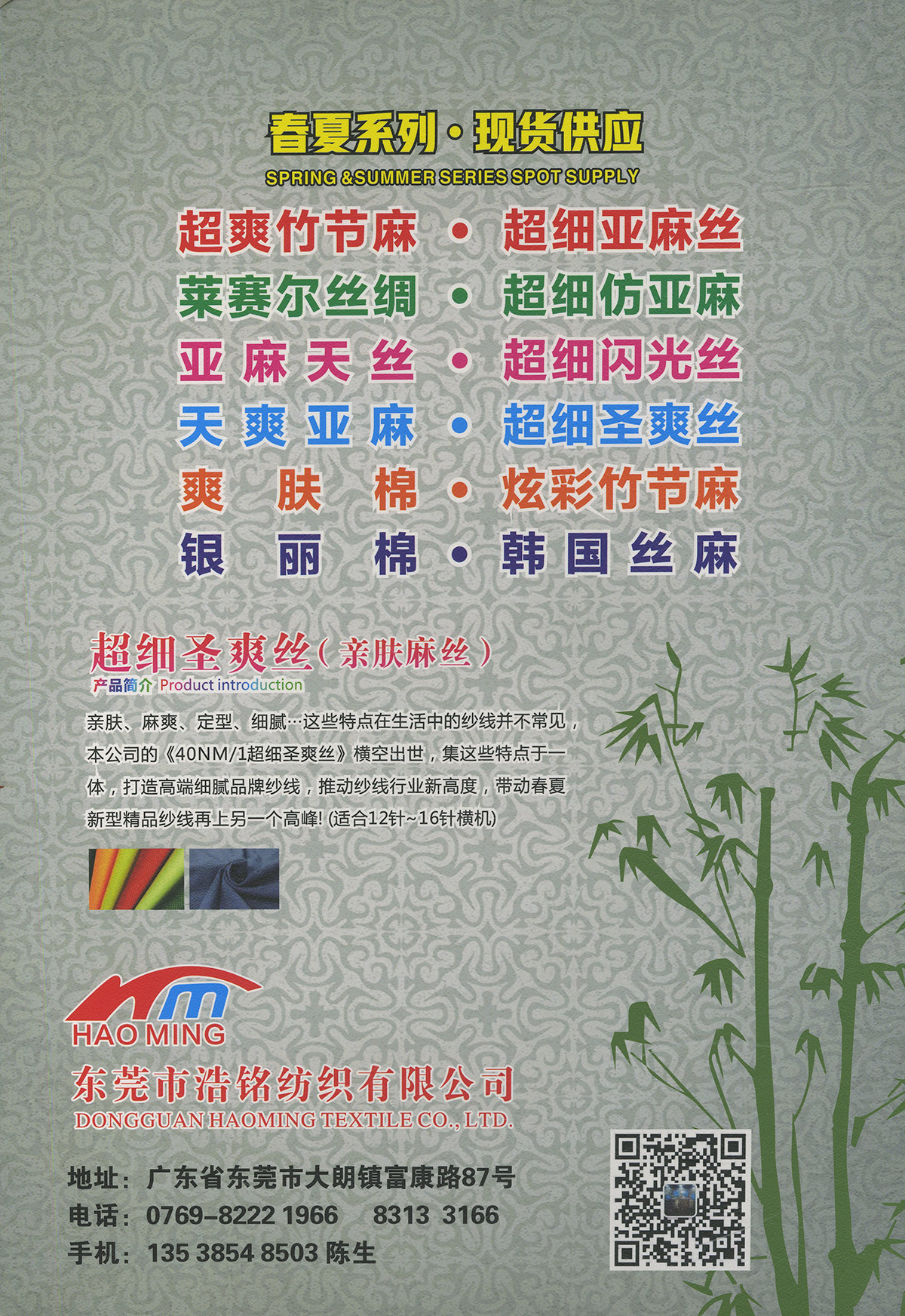 春夏產品系列:超爽竹節麻、天爽亞麻、麻感.天晴、天然絲、天曲亞麻、超細亞麻絲、萊賽爾絲綢、超細圣爽絲(親膚麻絲)、超細閃光絲(銀爽絲)、超細仿亞麻、炫彩竹節麻、亞麻天絲、漸變絲綢、幻彩麻紗、爽膚棉、銀麗棉、韓國絲麻、高端亞麗爽